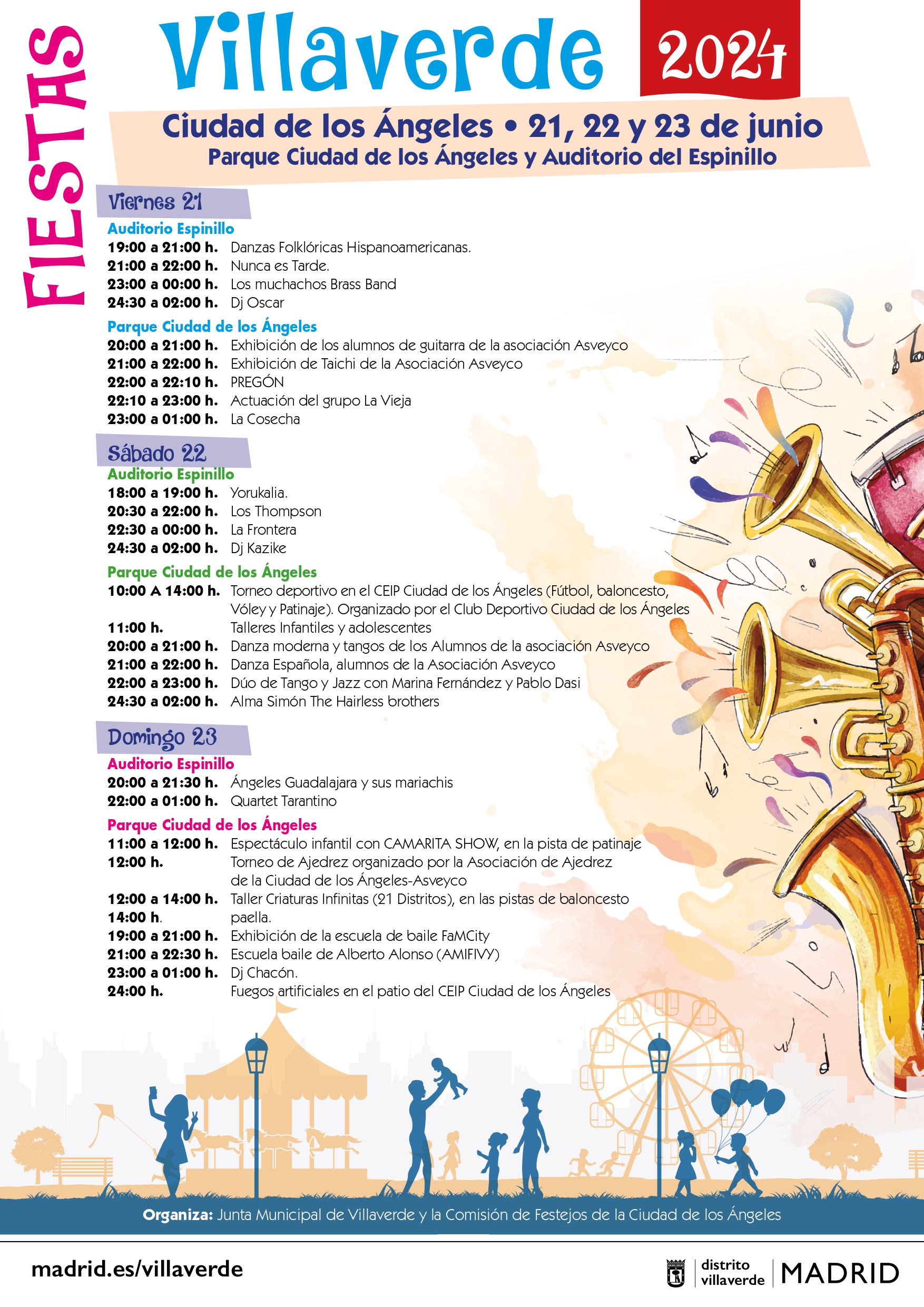 En Ciudad de los Ángeles, las fiestas comenzarán el viernes 21 de junio en el Auditorio El Espinillo, a partir de las 19:00 h con actuaciones de danzas folclóricas hispanoamericanas, seguidas del grupo Nunca es tarde, la banda Los Muchachos Brass y el DJ Óscar.
