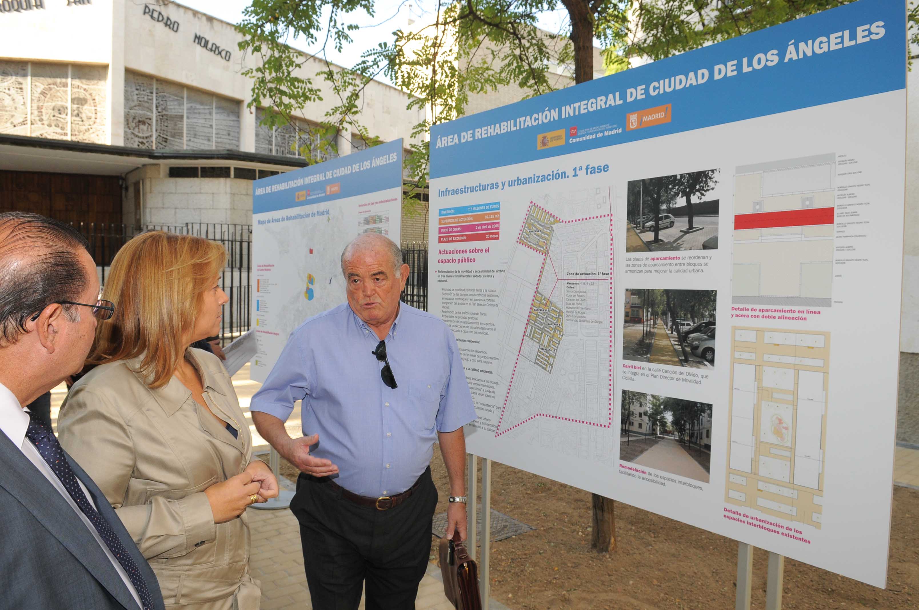 Mejorar la habitabilidad, accesibilidad y sostenibilidad de las viviendas, modernizar las redes de servicios, y adecuar los espacios interbloques instalando nueva iluminación y mobiliario urbano, son las principales actuaciones que se llevarán a cabo en el Área de Rehabilitación Integral de Ciudad de los Ángeles. El proyecto cuenta con una inversión de 68´5 millones de euros, de los cuales el Ayuntamiento de Madrid aporta 32´2 millones, el Ministerio de Vivienda 17´7 millones de euros, y la Comunidad 18´5 millones. La delegada de Urbanismo y Vivienda, Pilar Martínez, ha visitado hoy esta Área para conocer sobre el terreno la evolución de la primera fase de las obras de infraestructuras y urbanización, iniciadas en abril, y el proceso de concesión de ayudas para rehabilitación de viviendas e instalación de ascensores.