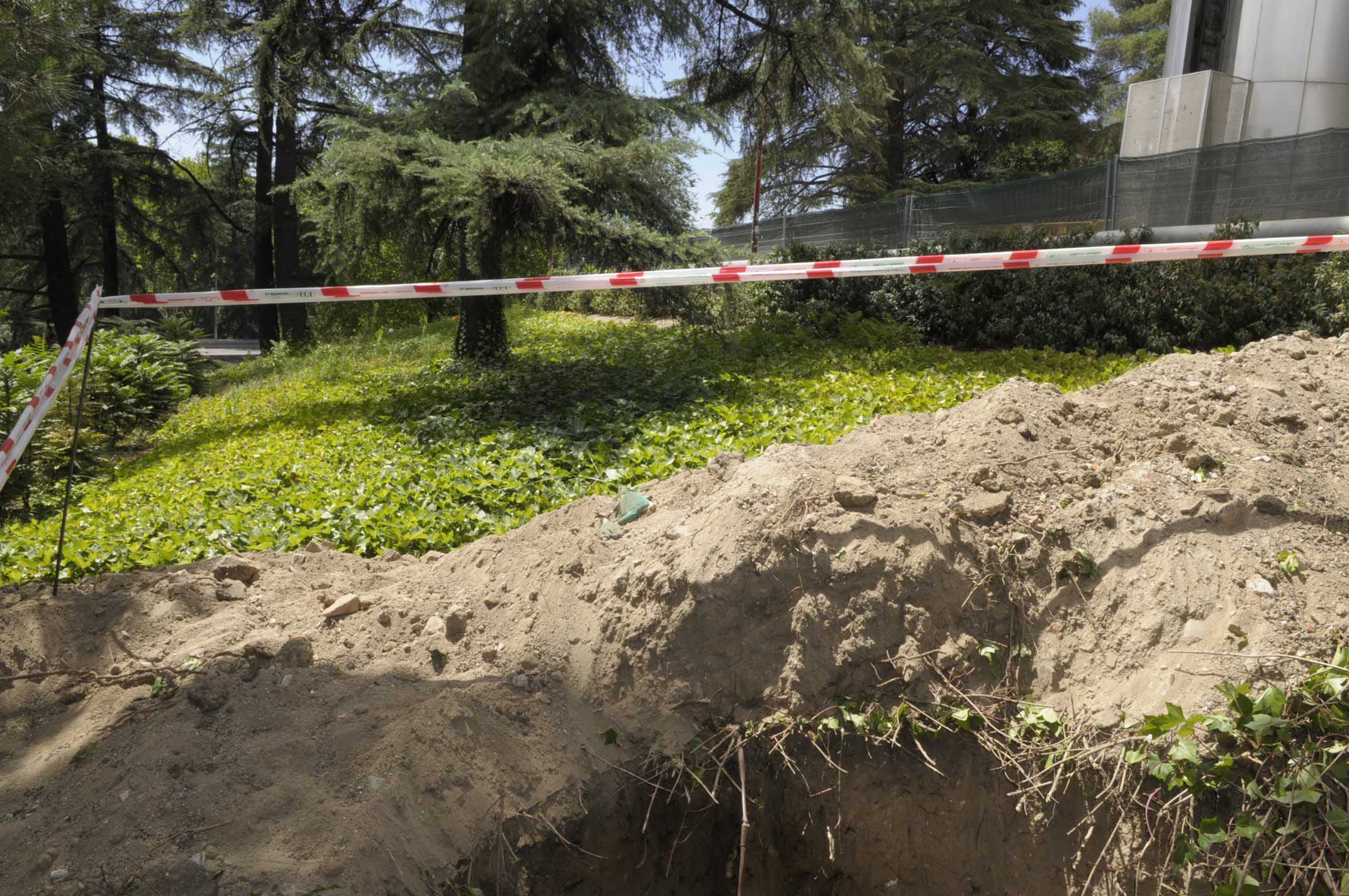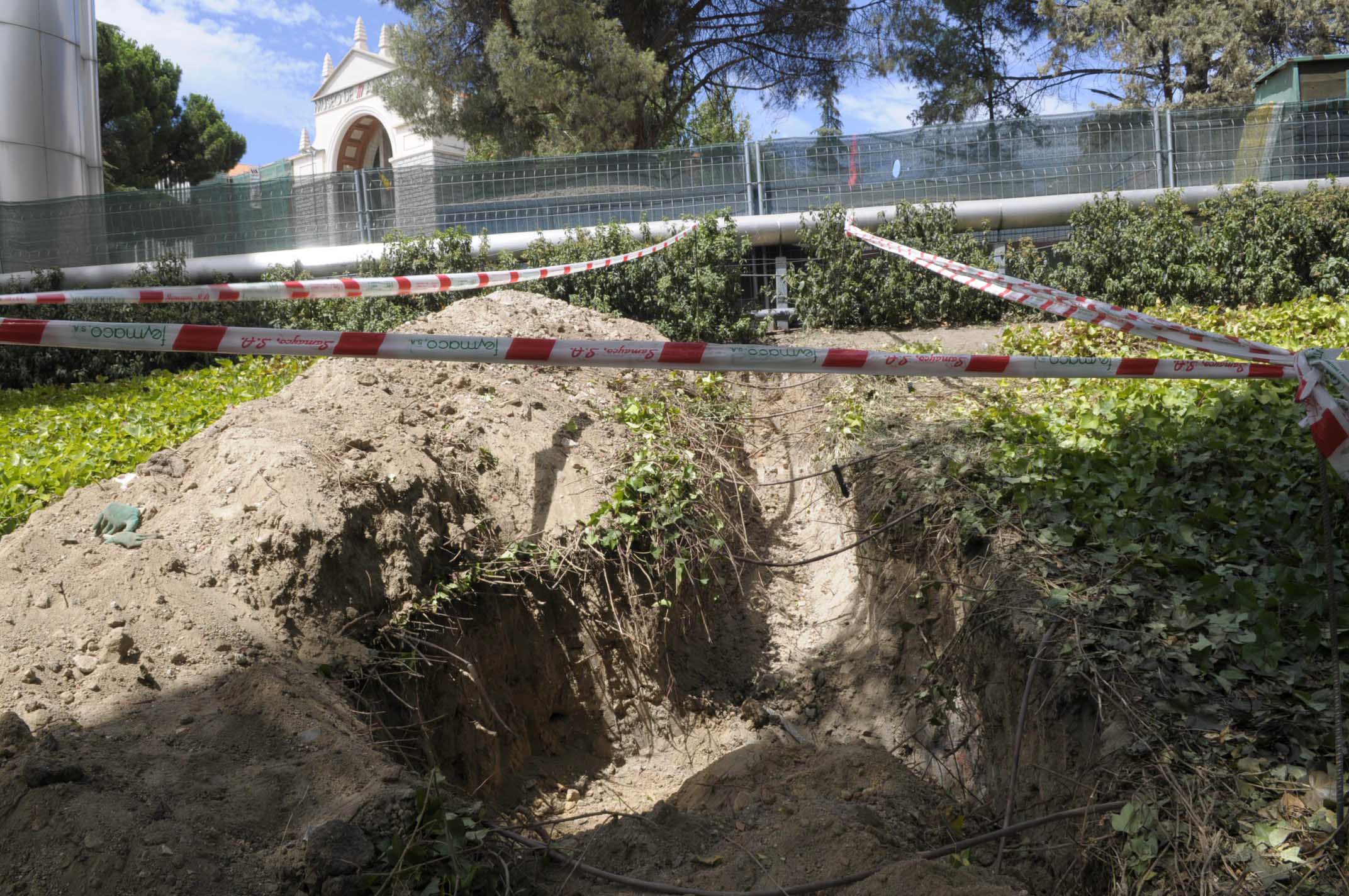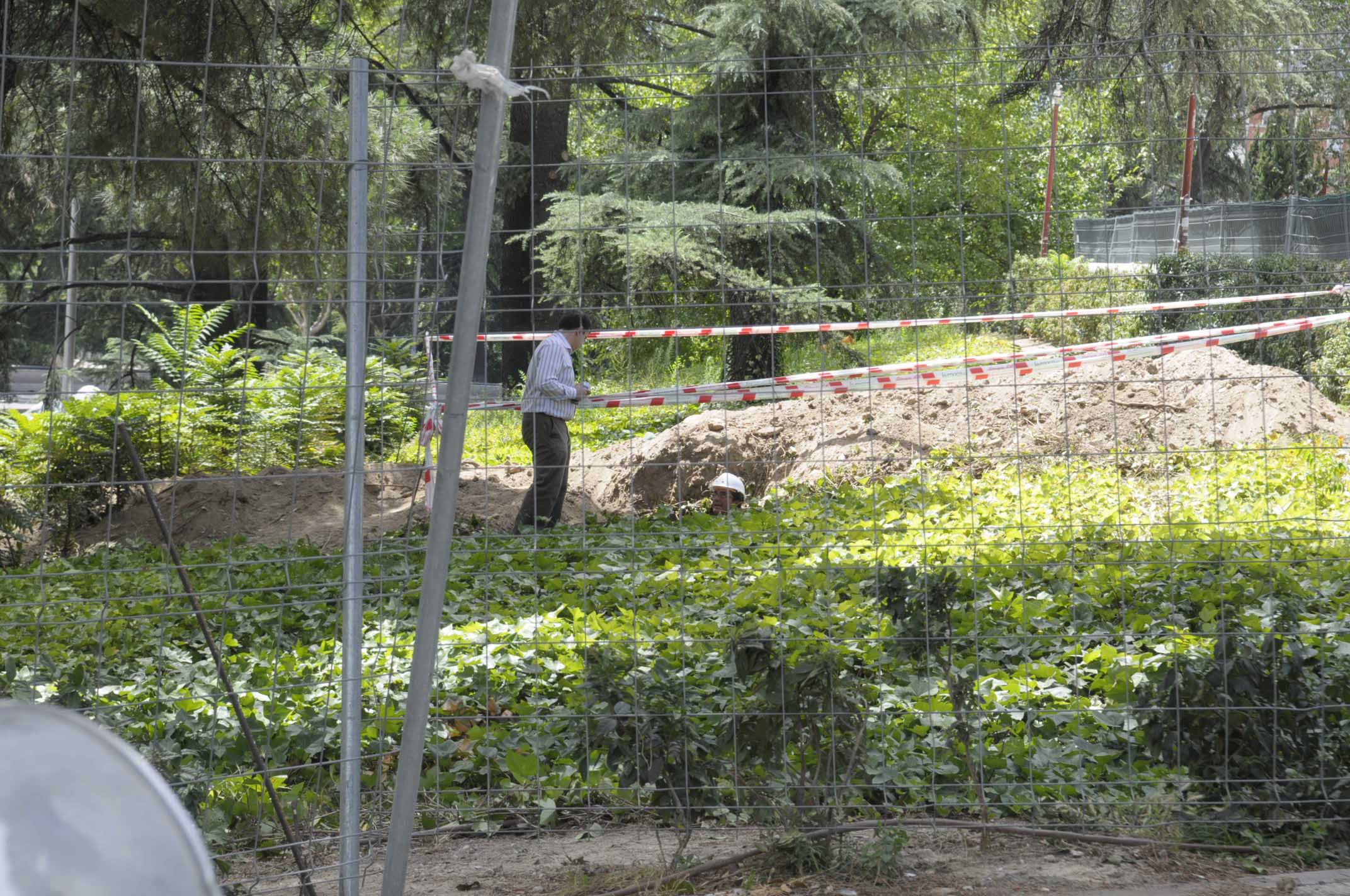 A última hora de la mañana de hoy, unos obreros han encontrado restos humanos en una zanja junto al Faro de la Moncloa. Las fotos corresponden a la zona donde se ha producido el hallazgo.
