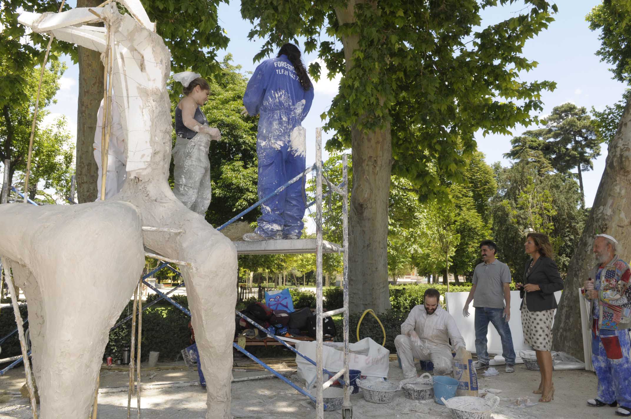 Juan Ripollés regalará una de sus personales e imaginativas esculturas a la Ciudad de Madrid el próximo 28 de junio. Ese día se pondrá punto final a la exposición del artista castellonense “Universo Humano”, instalada en El Retiro –paseo por el que se accede al parque desde la plaza de la Independencia–. El escultor ha comunicado su decisión este mediodía a la teniente de alcalde y delegada de Medio Ambiente del Ayuntamiento de Madrid, Ana Botella, quien visitaba al artista cuando realizaba un encuentro con 15 alumnos de la Escuela de Arte La Palma que, posteriormente, daría lugar a una escultura creada entre todos ellos. La exposición “Universo Humano” agrupa 20 esculturas de gran formato realizadas en diferentes materiales, recubiertos de cristal de Murano. Son formas dinámicas, desenfadadas e ingenuas, fuertemente influenciadas por el mundo de los toros, la naturaleza y la mitología en las que no faltan influencias de Picasso. La exposición, que fue inaugurada el pasado 1 de abril, ha sido prorrogada casi veinte días más ya que estaba prevista su clausura el 10 de junio/.