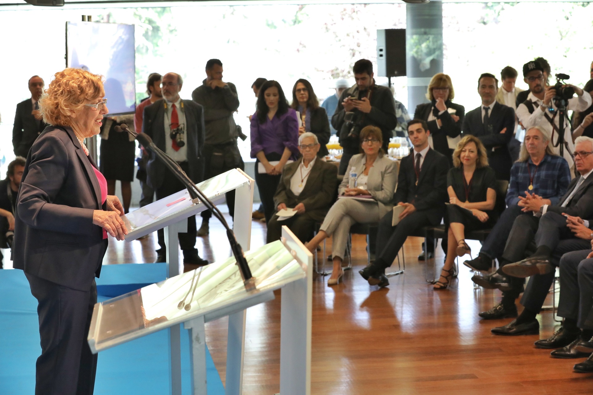 “Este acto es muy familiar. Sacamos los álbumes de fotos y nos tomamos después el chocolate con personas corrientes que hacen maravillas”, ha dicho Manuela Carmena refiriéndose a los galardonados, a los que ha agradecido a cada uno de ellos su esfuerzo profesional, su solidaridad y el pasear el nombre de Madrid, ciudad abierta, por el mundo para hacerla más internacional.