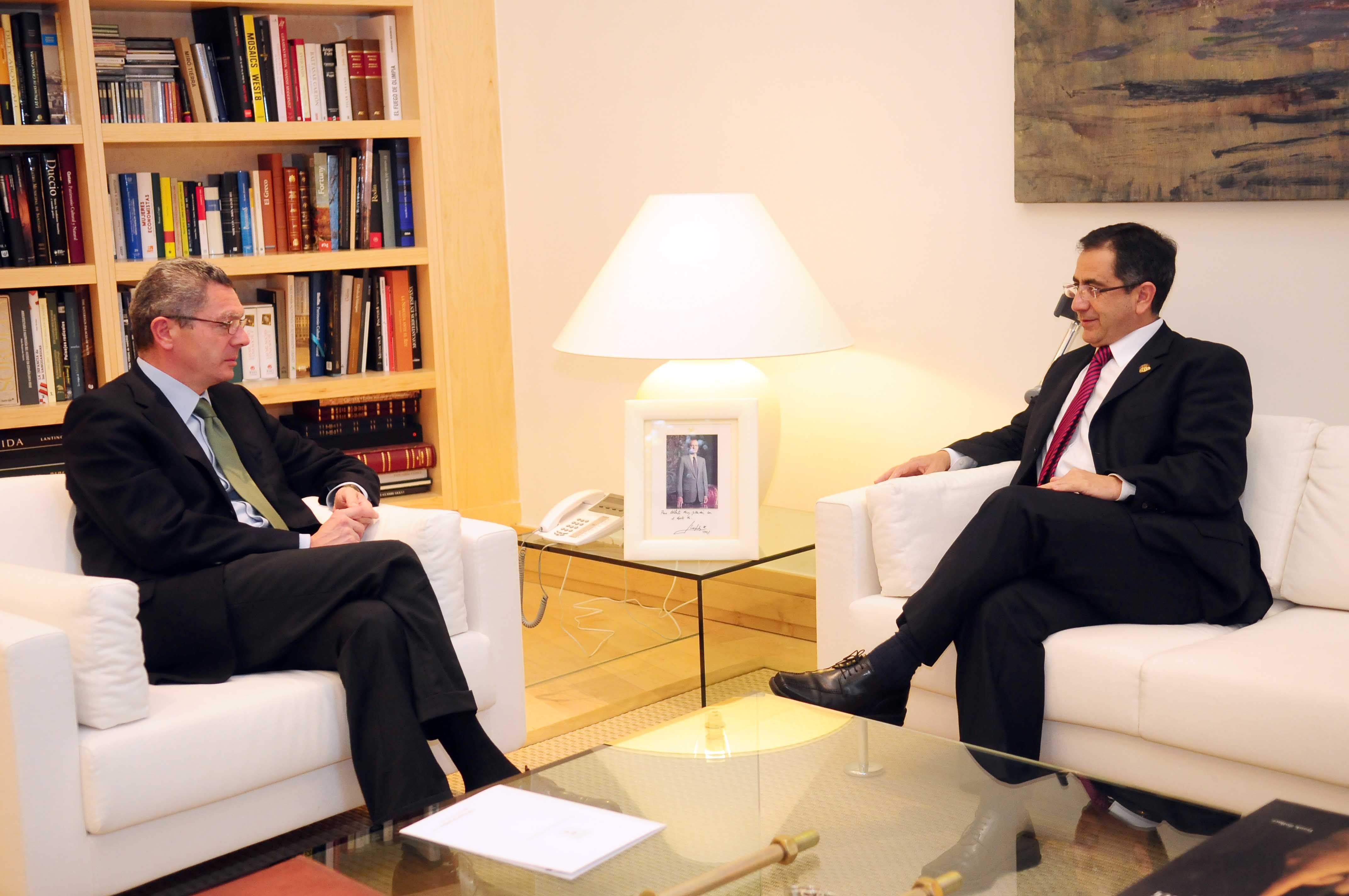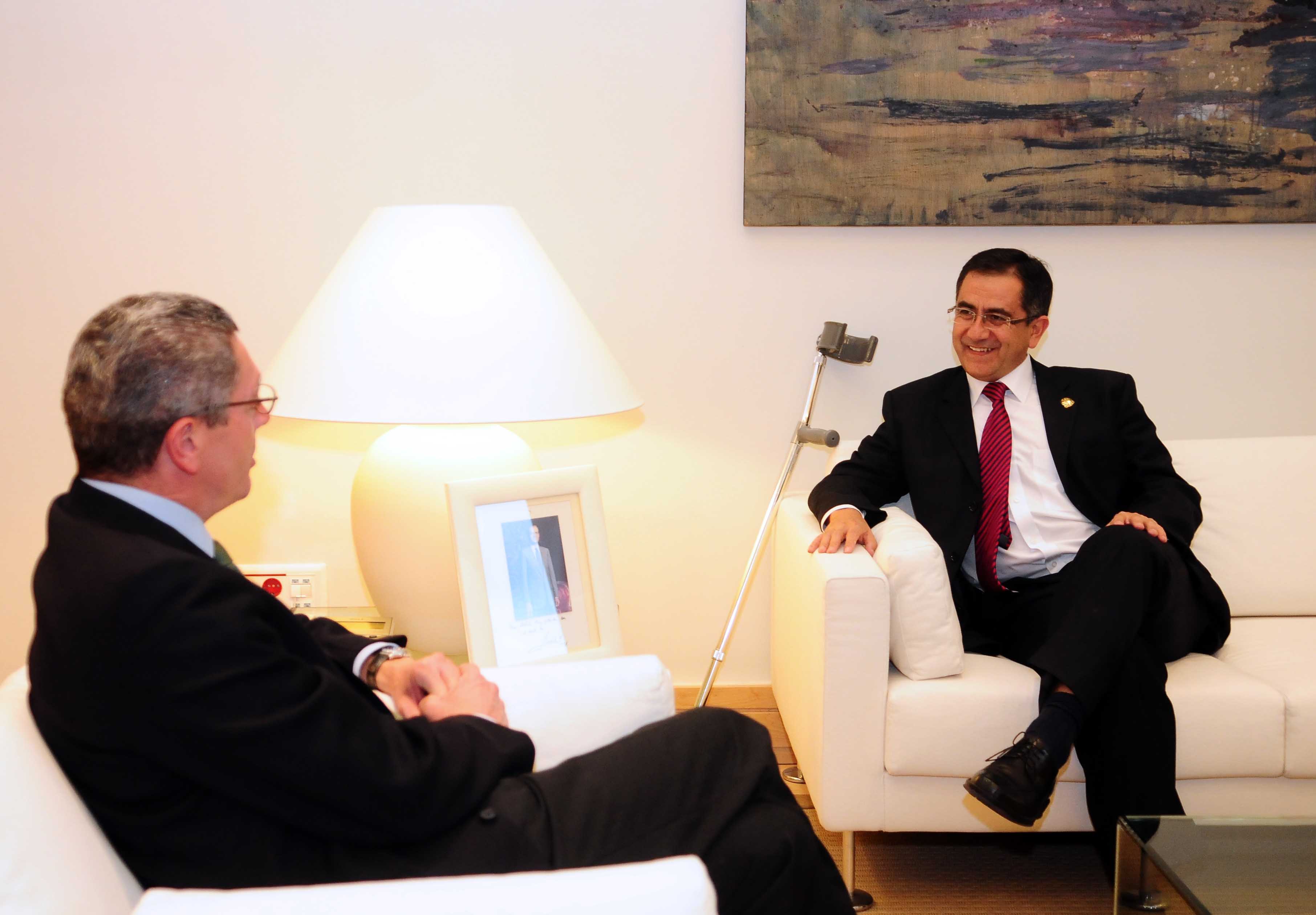 Los alcaldes de Madrid y Quito, Alberto Ruiz-Gallardón y Augusto Barrera, respectivamente, durante la reunión que han mantenido hoy en el palacio de Cibeles