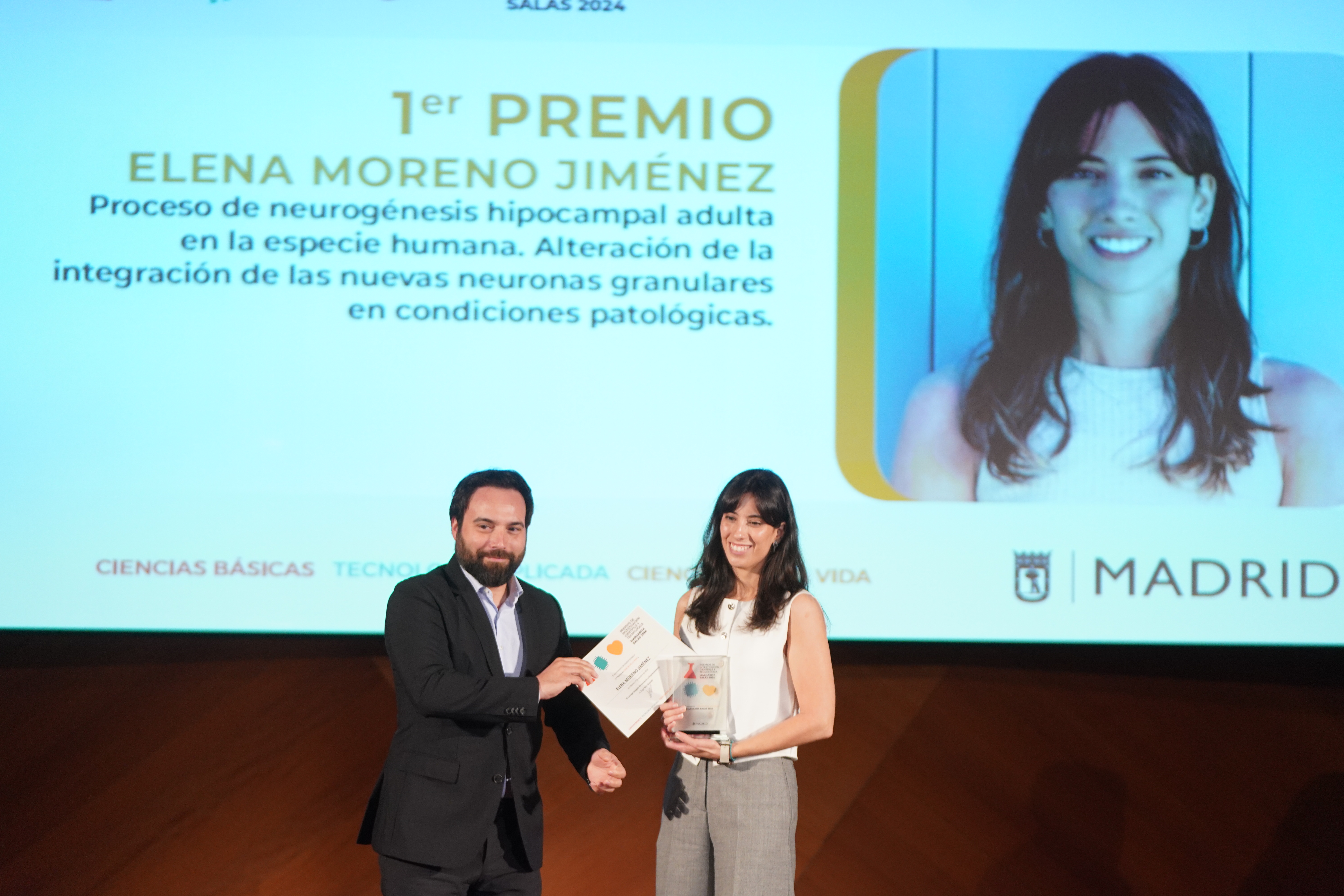 Elena Moreno Jiménez, con el proyecto ‘Proceso de neurogénesis hipocampal adulta en la especie humana. Alteración de la integración de las nuevas neuronas granulares en condiciones patológicas’, ha resultado ganadora del primer premio en la categoría de ciencias de la vida. Los hallazgos de esta tesis doctoral sugieren que