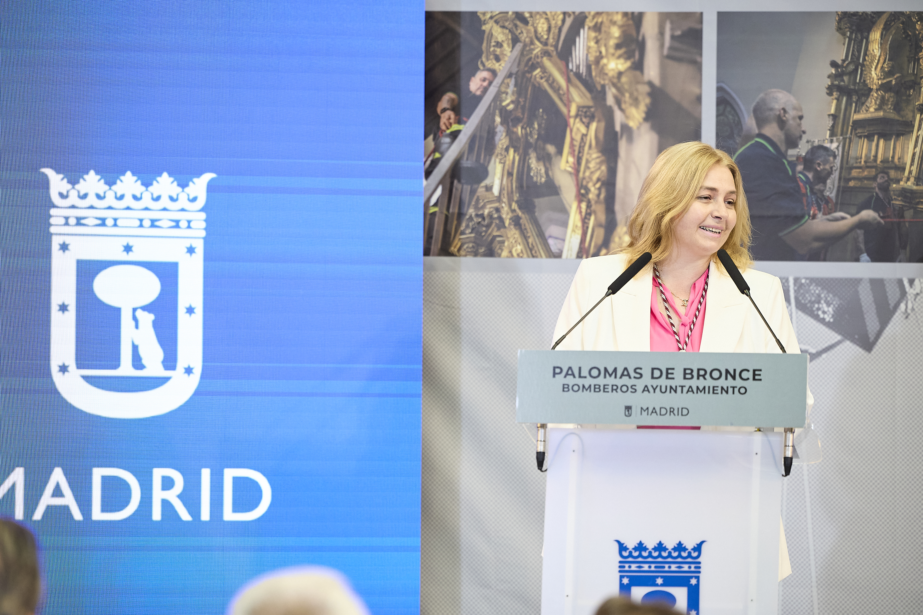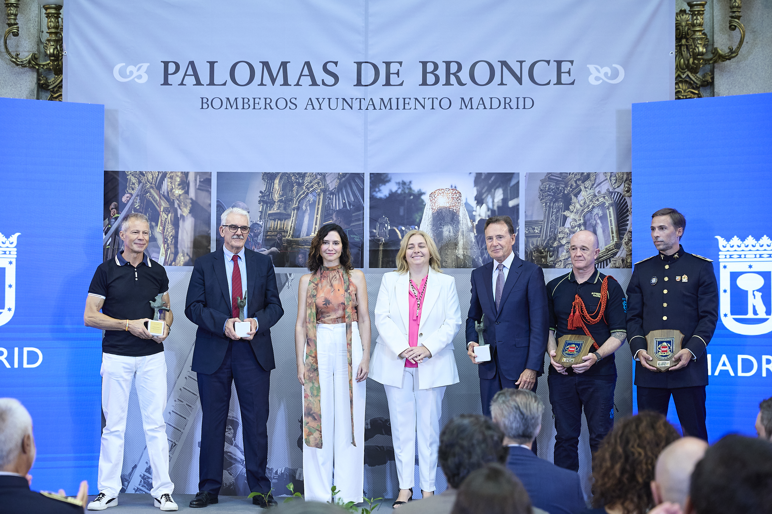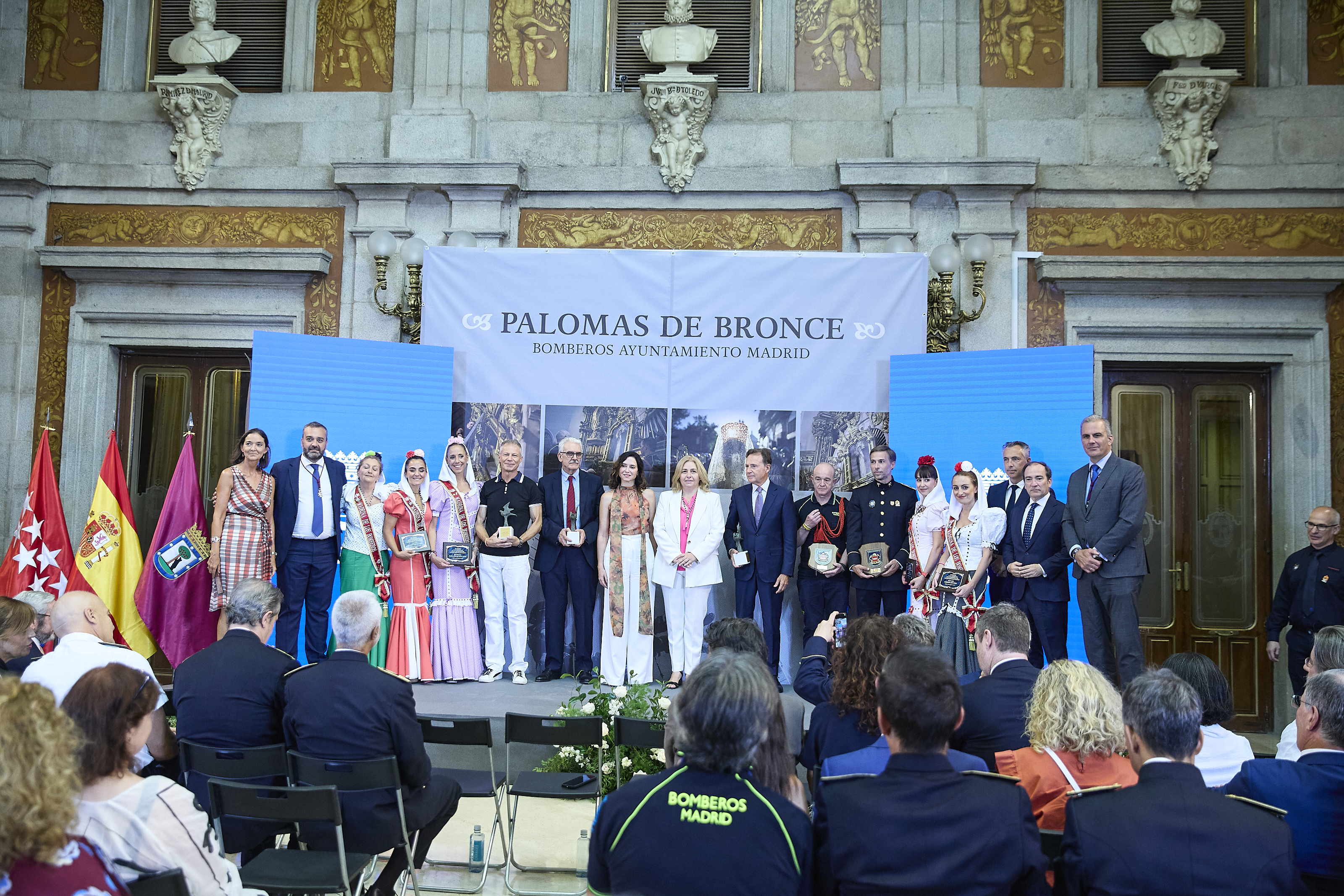 Sanz ha hecho entrega de las ‘Palomas de Bronce-Bomberos de Madrid 2025’, que este año han recaído en Alfredo Vaquerizo Rodríguez, sargento jubilado con más de 40 años de servicio, reconocido por una trayectoria profesional de dedicación al Cuerpo de Bomberos; en Madrid Salud, por su 25º aniversario y la labor que desempeñan en la ciudad de Madrid, además de la estrecha colaboración que mantienen con el Cuerpo de Bomberos -el reconocimiento lo ha recogido el gerente, Antonio Prieto-; y en Matías Prats Luque, por sus 50 años de labor de servicio público desarrollada en sus informativos.