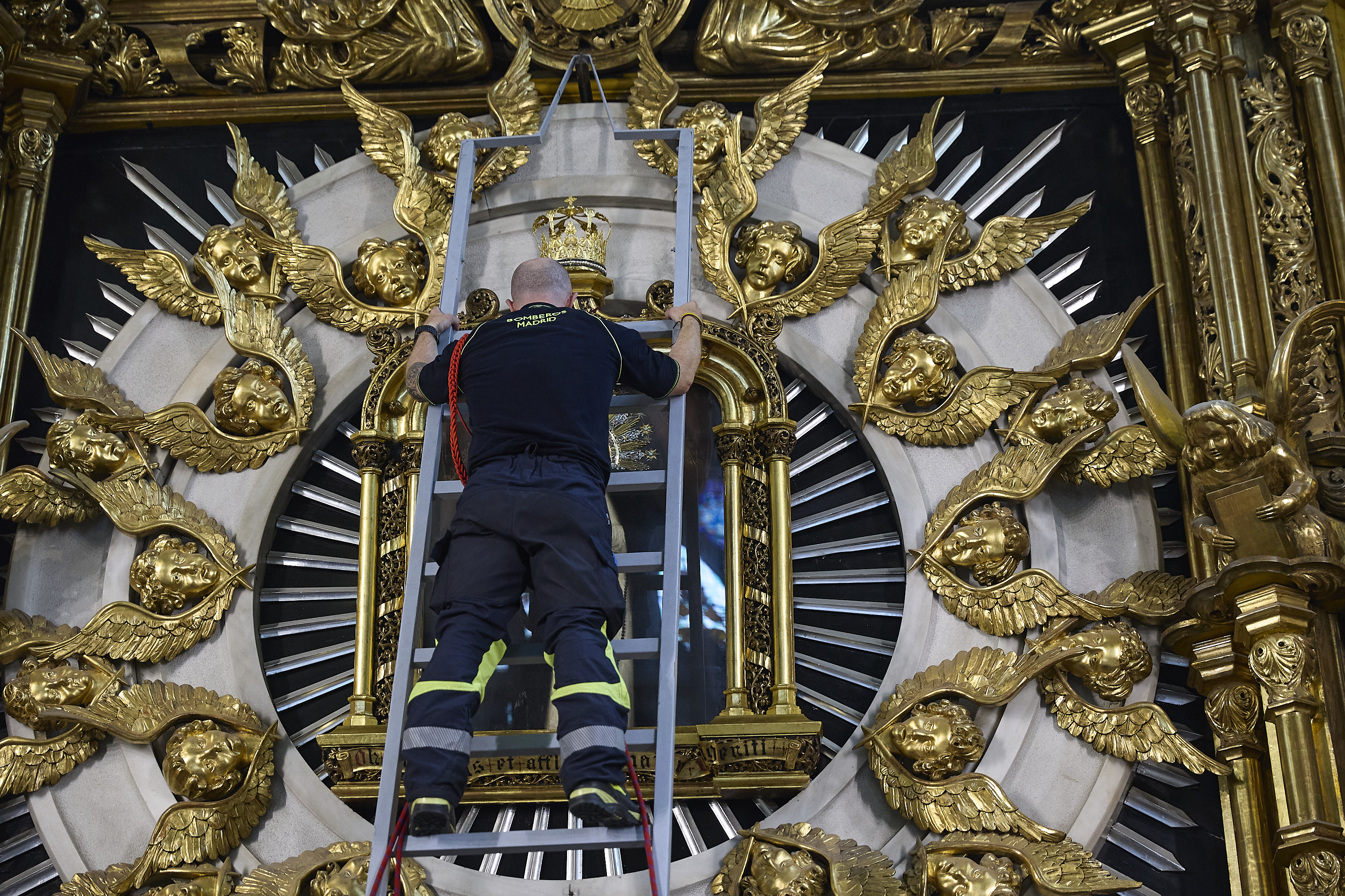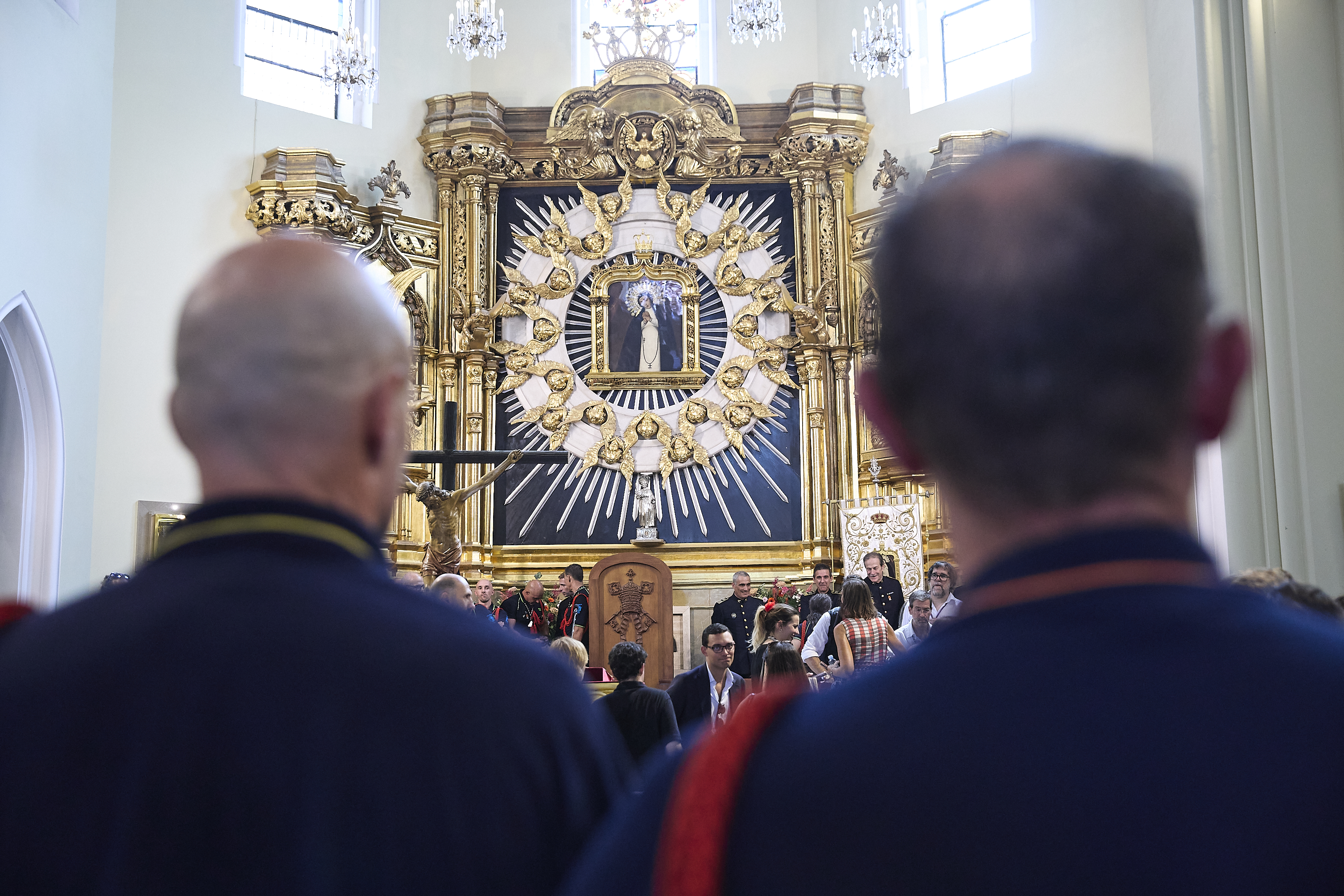 Al acabar el acto, la vicealcaldesa y alcaldesa en funciones y parte de la comitiva se han dirigido a la Iglesia de la Virgen de la Paloma, en cuya fachada han realizado la ofrenda floral, antes de asistir a la tradicional misa. Tras finalizar la ceremonia religiosa se produce uno de los momentos más esperados de la jornada, el descenso del cuadro de la Virgen de la Paloma, que está en el Altar Mayor.