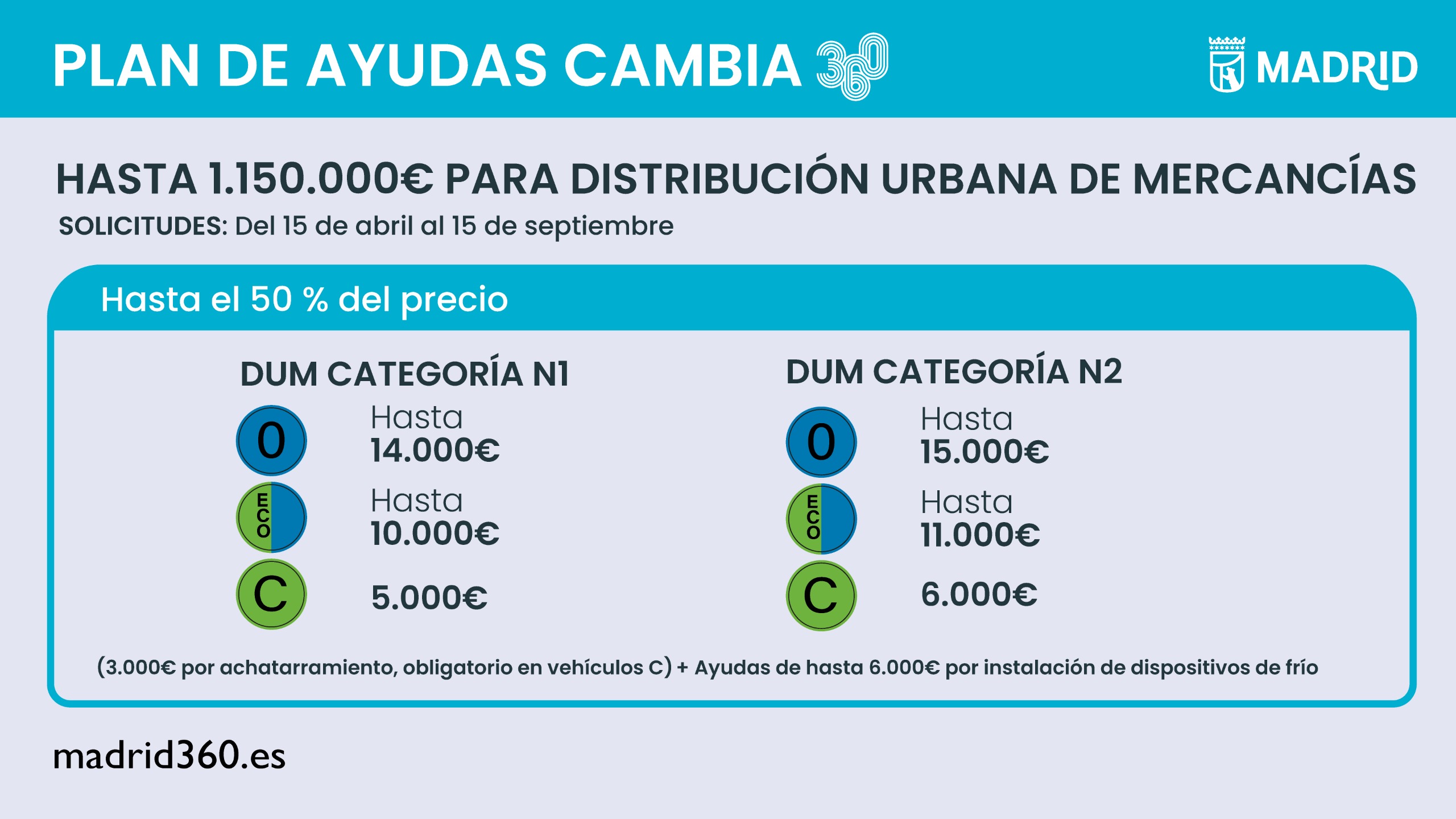 Las ayudas para DUM cuentan con 1,15 millones de euros de financiación, concediéndose hasta 14.000 euros por solicitante. Para las categorías N1, se podrán obtener 11.000 euros si se compra una furgoneta o camión con clasificación ambiental CERO emisiones, 7.000 si es ECO y 5.000 si es C. Si se achatarra un vehículo A o B, se añadirá un incentivo de 3.000 euros, mientras que el achatarramiento es obligatorio en el caso de comprar un vehículo de mercancías con clasificación ambiental C.