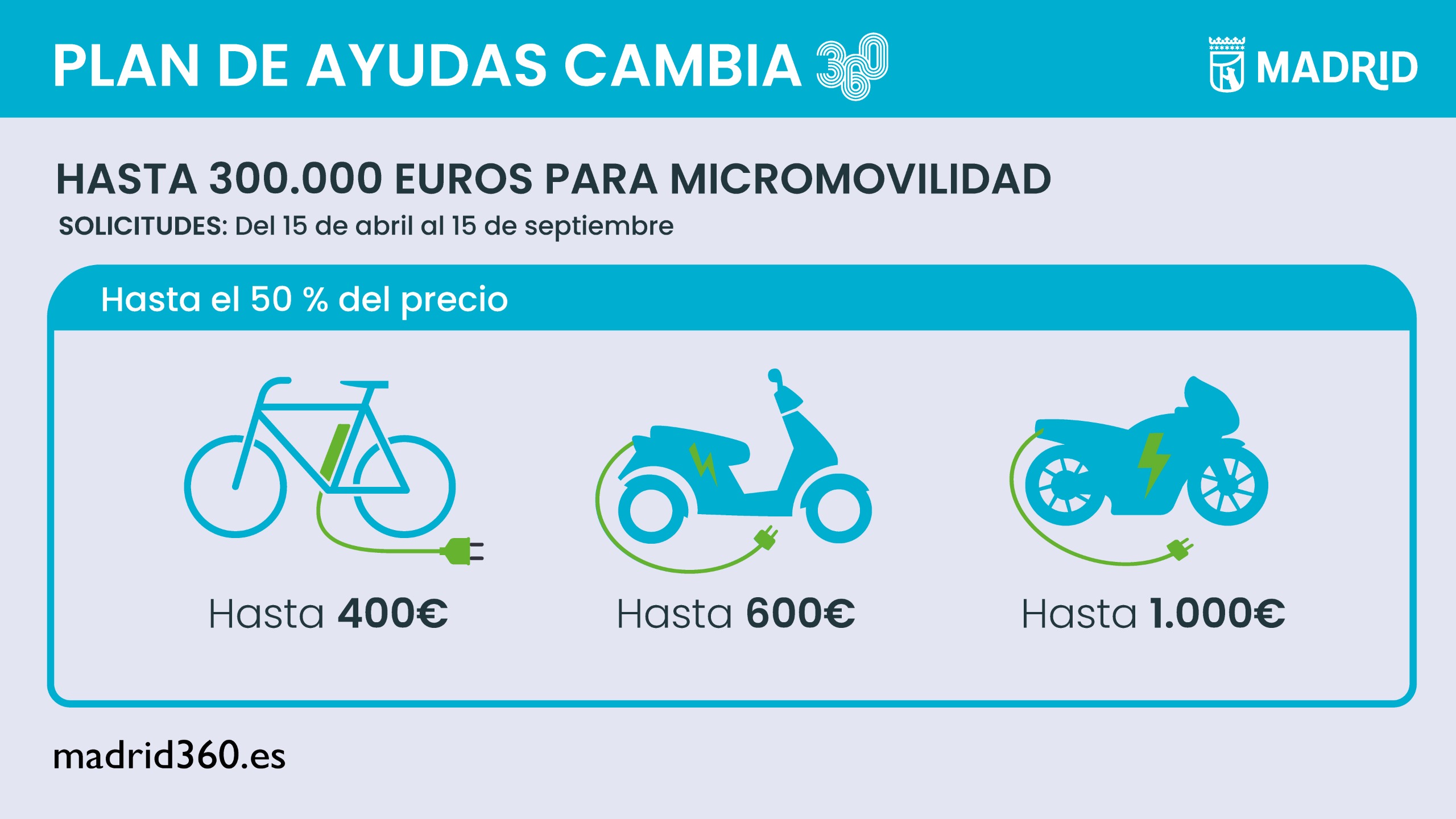 El Ayuntamiento reserva un crédito de hasta 300.000 euros, con un máximo de 2.000 euros por vehículo (financiándose hasta el 50 % del precio), para los vehículos de micromovilidad. Para la compra de bicicletas eléctricas, se establece un límite de ayuda de 400 euros; para ciclomotores eléctricos L1e B, hasta 600 euros, y para motocicletas eléctricas L3e, L4e y L5e, hasta 1.000 euros. Desaparece la financiación para cuatriciclos eléctricos ligeros L6eBP y para cuatriciclos eléctricos pesados, por ausencia de solicitudes.