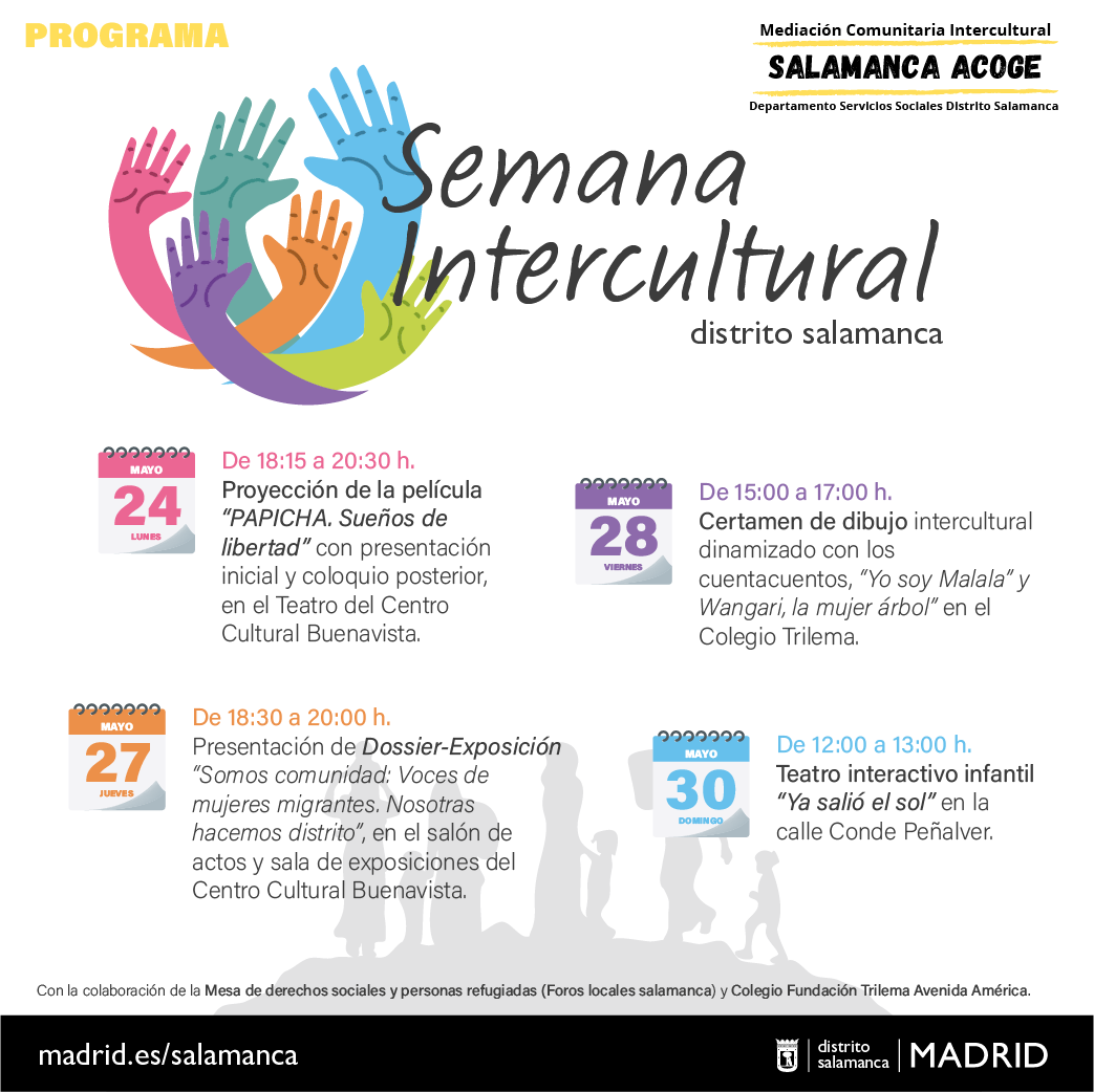 El próximo 24 de mayo, el distrito de Salamanca inicia su Semana Intercultural. Organizada por el Departamento de Servicios Sociales del distrito a través del programa Salamanca Acoge, las actividades tienen como punto de partida este viernes, 21 de mayo, declarado Día Mundial de la Diversidad Cultural para el Diálogo y el Desarrollo por la Asamblea de las Naciones Unidas.