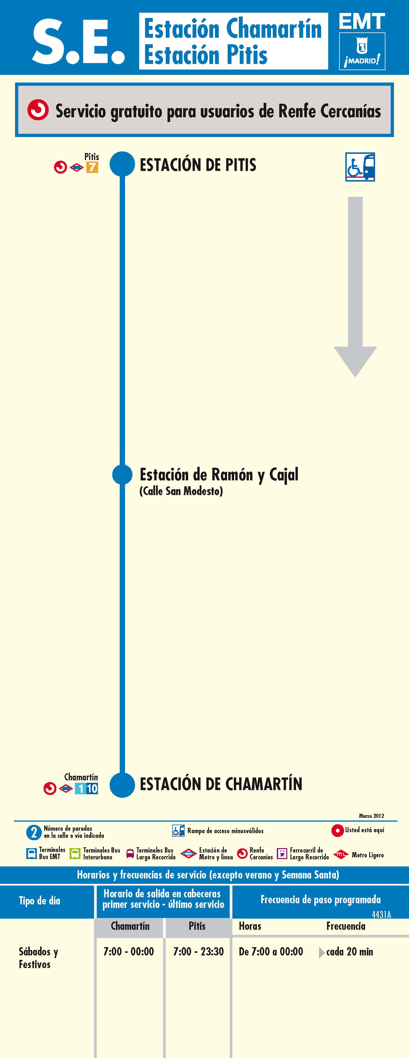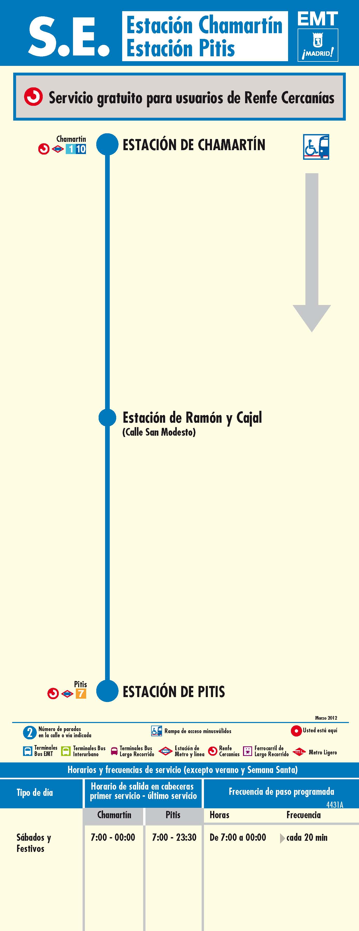 La línea especial de la EMT funcionará con una dotación de tres autobuses y tendrá un intervalo de paso de 20 minutos. Prestará servicio de 7.00 a 24.00 horas (desde Chamartín) y de 7.00 a 23.30 horas desde Pitis. Desde Ramón y Cajal, las últimas salidas se realizarán a las 23.45, dirección Chamartín; y a las 23.15, dirección Pitis.