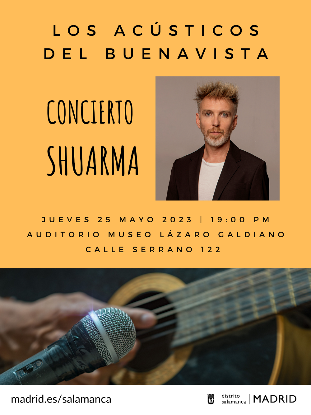 Organizado por la Junta Municipal de Salamanca, el concierto de Shuarma se podrá disfrutar a partir de las 19:00 h en el auditorio del Museo Lázaro Galdiano, con entrada por la calle de Serrano 122. El acceso será libre hasta completar aforo, con apertura de puertas a partir de las 18:30 h. También permite la opción de seguirlo por streaming a través del canal de YouTube Los Acústicos del Buenavista.
