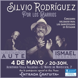 El artista cubano, Silvio Rodríguez, actuará el próximo miércoles, 4 de mayo, en el Auditorio Municipal de Villa de Vallecas acompañado por Ismael Serrano y Luis Eduardo Aute, con el apoyo del Ayuntamiento de Madrid. El concierto solidario para los damnificados en Ecuador es gratuito.