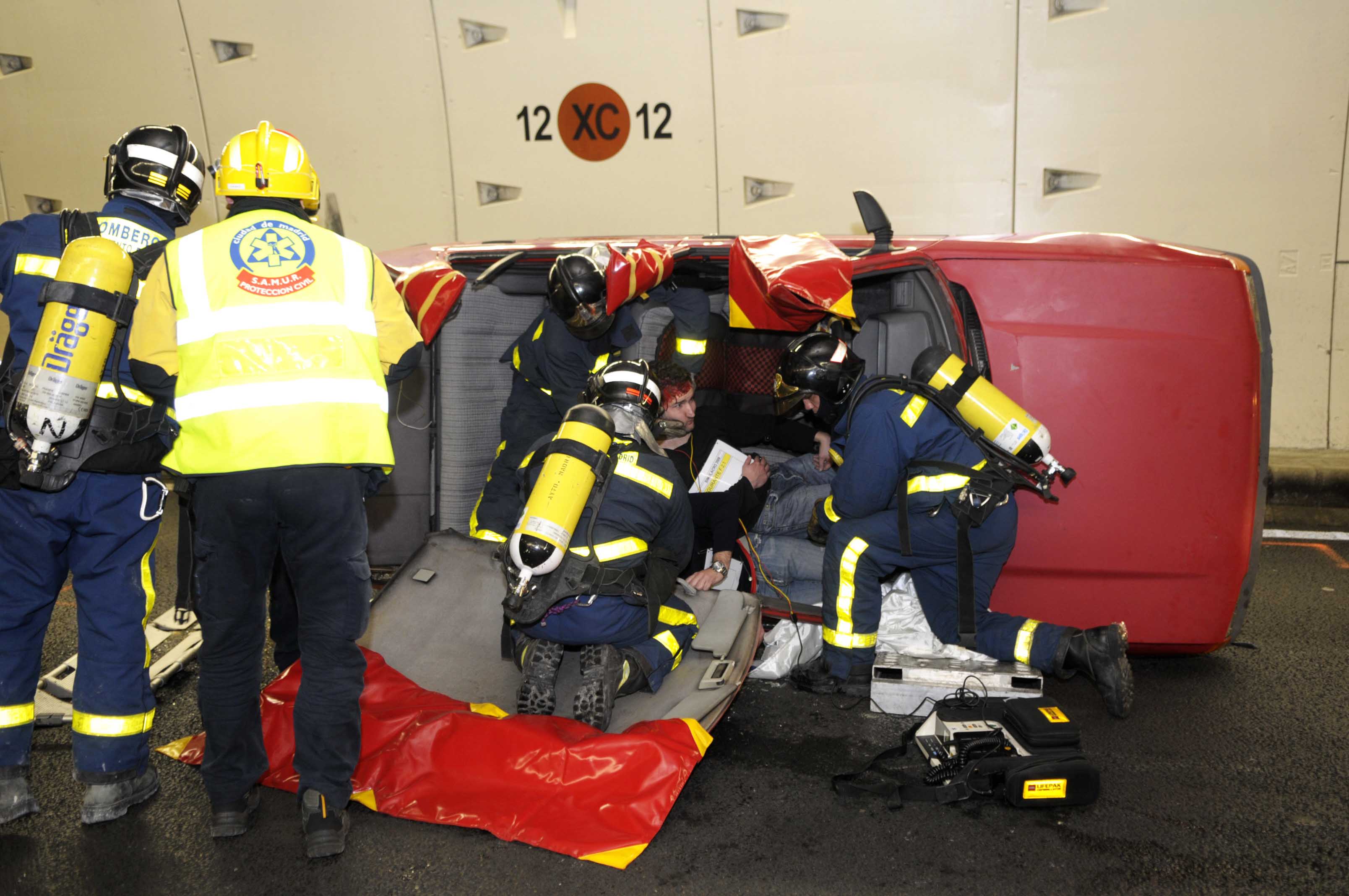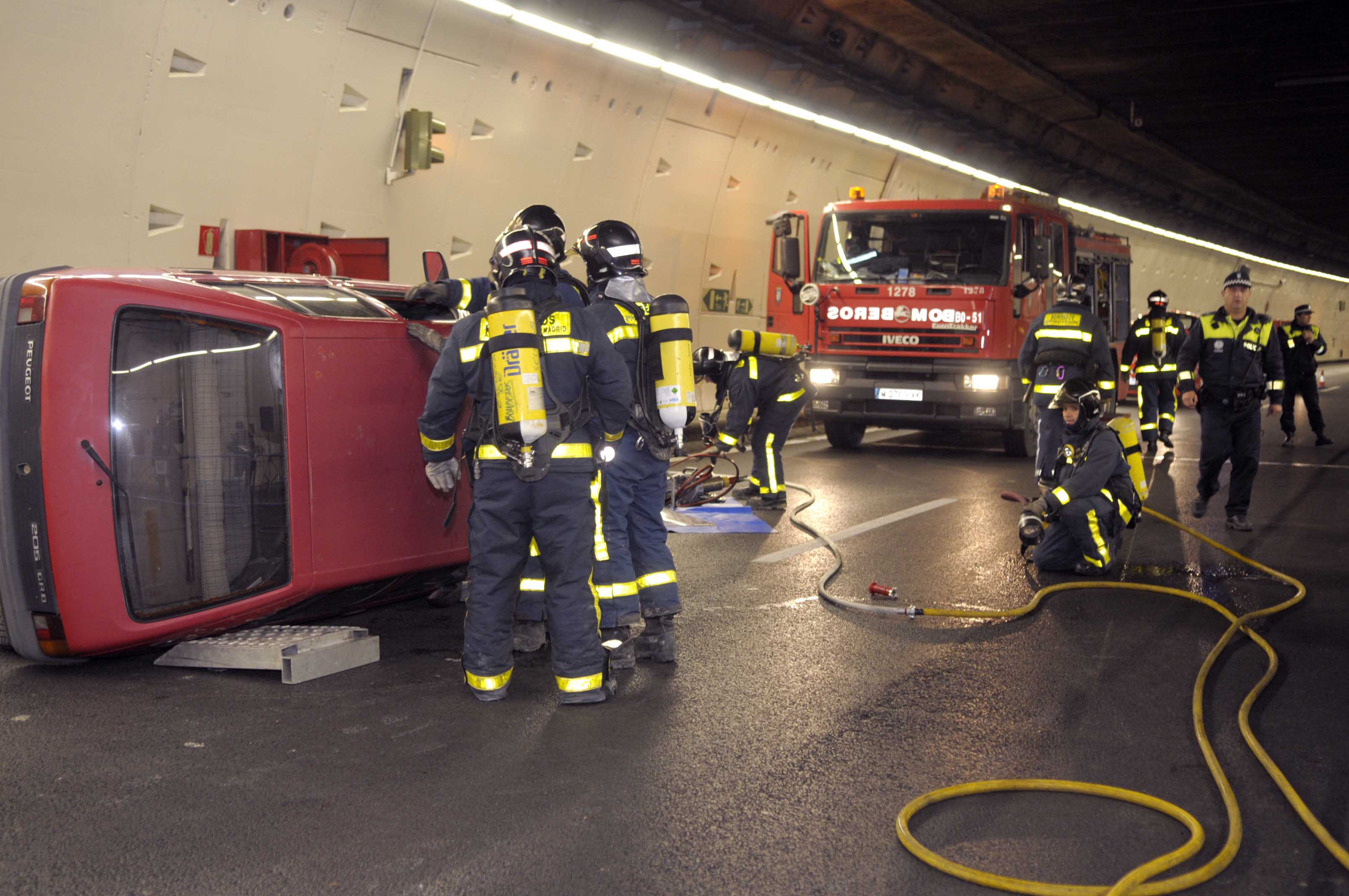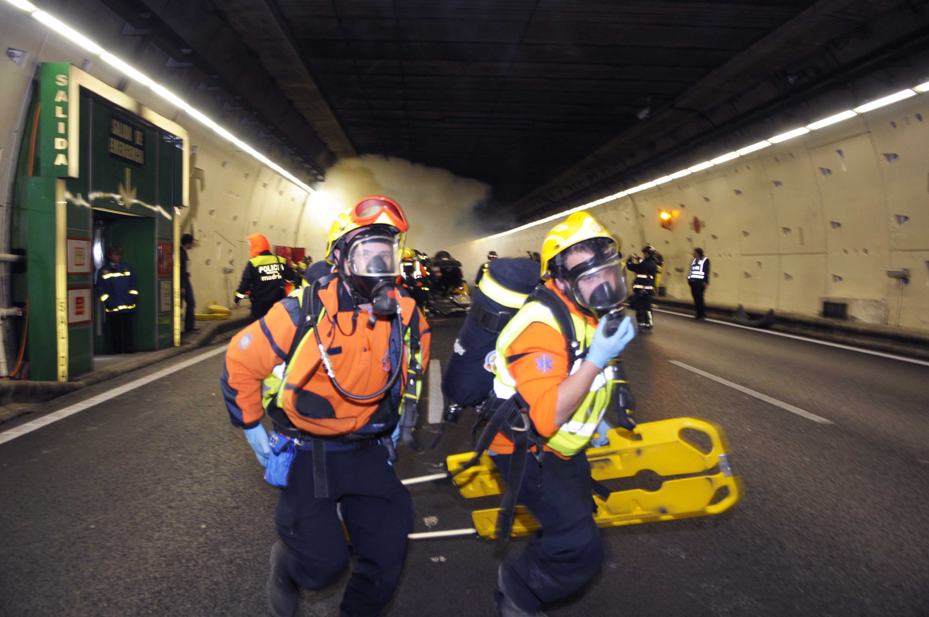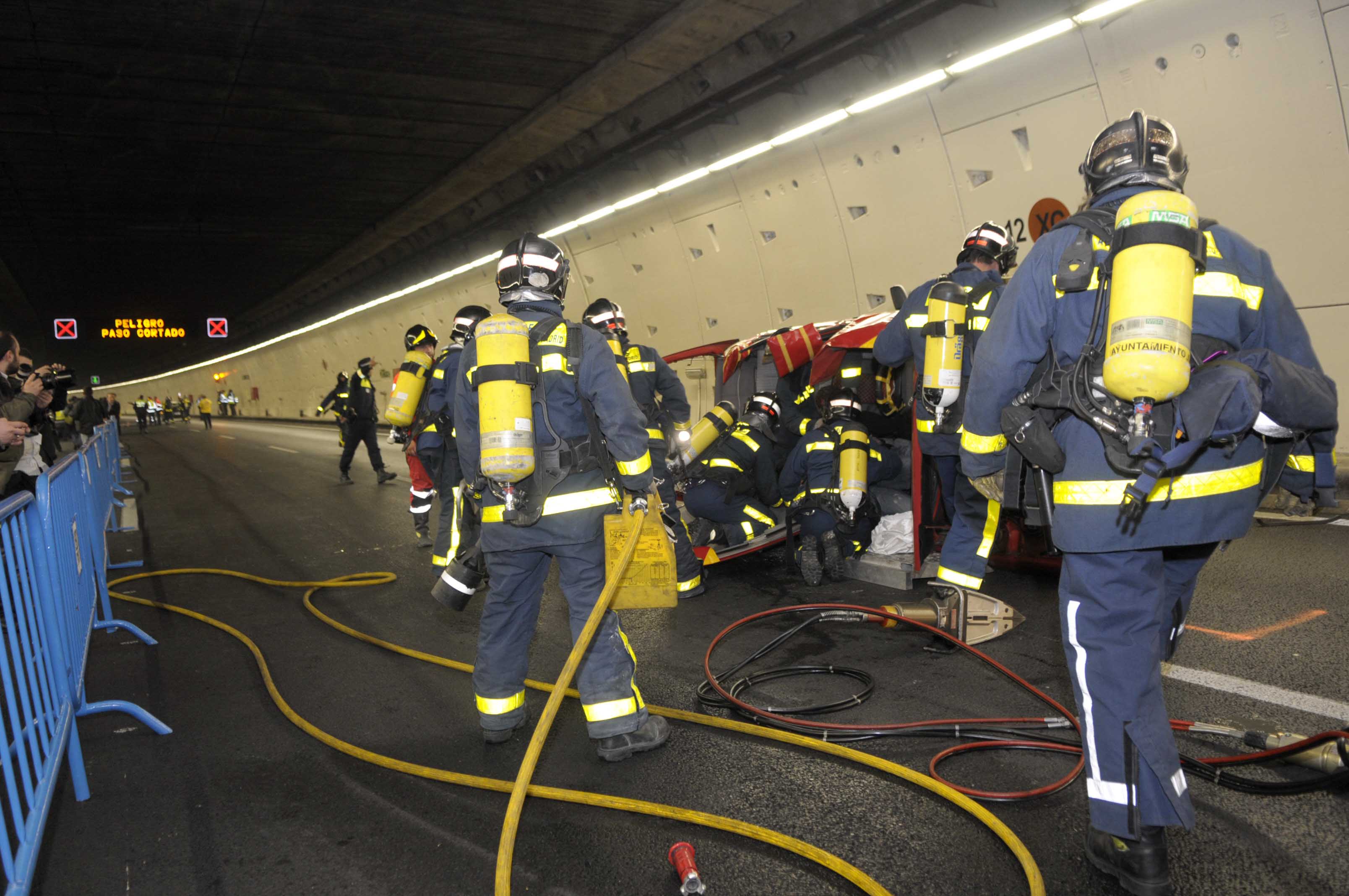Bomberos manda al lugar dos autobombas urbanas pesadas: una de ellas se desplazará por la calzada del túnel siniestrado mientras que la segunda llegará por la galería de emergencia que discurre por debajo. Con ayuda de equipo pesado los bomberos inician las maniobras de rescate de los heridos atrapados en los vehículos accidentados.