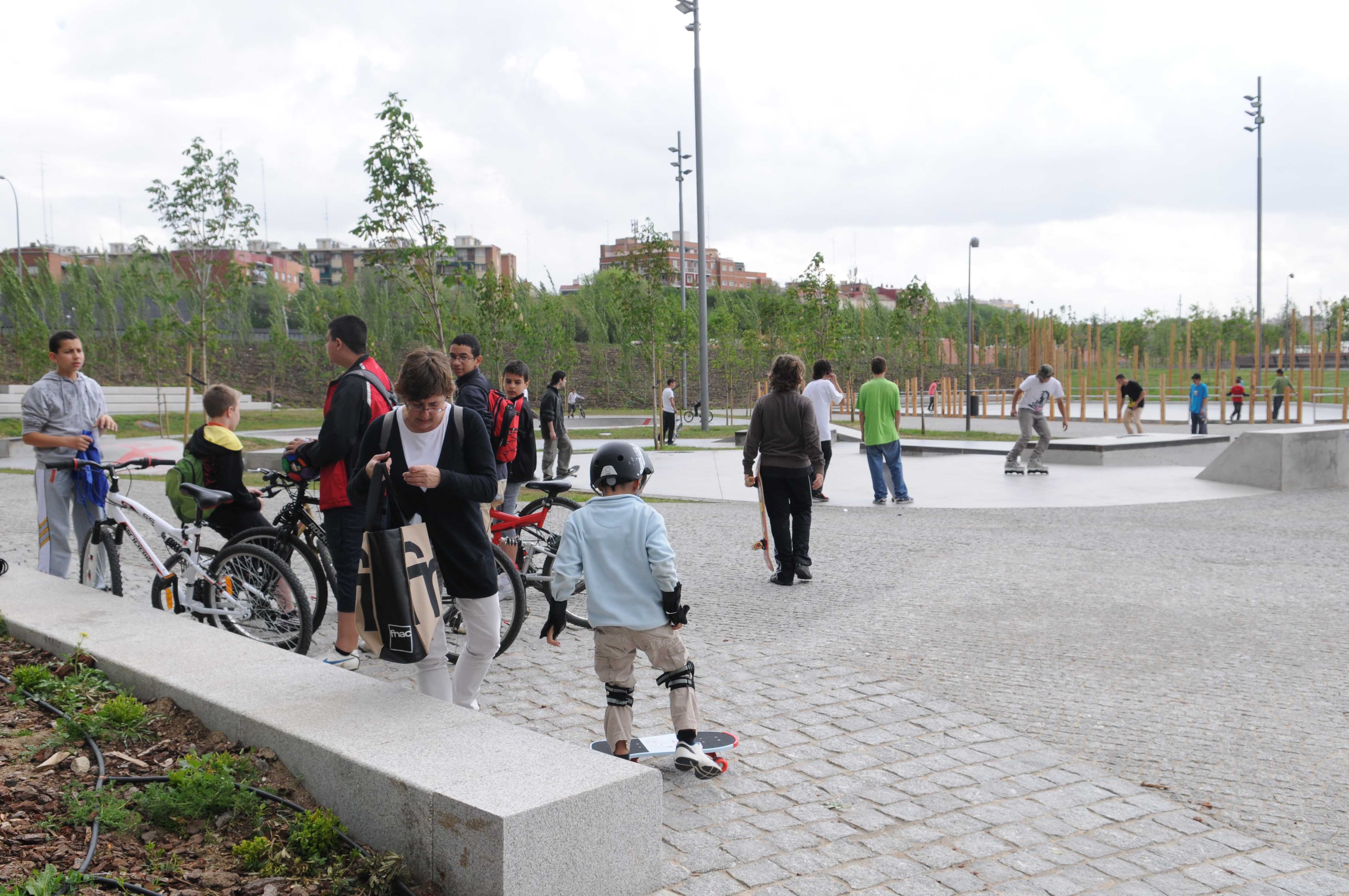 Pese al mal tiempo, las pistas de skate y patinaje, situadas en el parque de la Arganzuela, son algunas de las zonas más concurridas de Madrid Río. En sus 2.315 metros cuadrados, de los que 1.696 corresponden al skate park y 619 a las pistas de patinaje, nunca faltan entusiastas. El skate park está concebido para que los aficionados puedan poner en práctica sus habilidades sobre la tabla a lo largo de los 829 metros cuadrados de superficies curvas y de los 867 de terreno plano. El skate park está dotado de dos bowls: uno cerrado, con espacios cuyas alturas oscilan entre 1,5 y 2 metros; y otro abierto en el que se ubican diferentes elementos como rainbows y dunas de distintas alturas. El recinto permanece abierto todos los días de la semana de 10 a 23 horas.