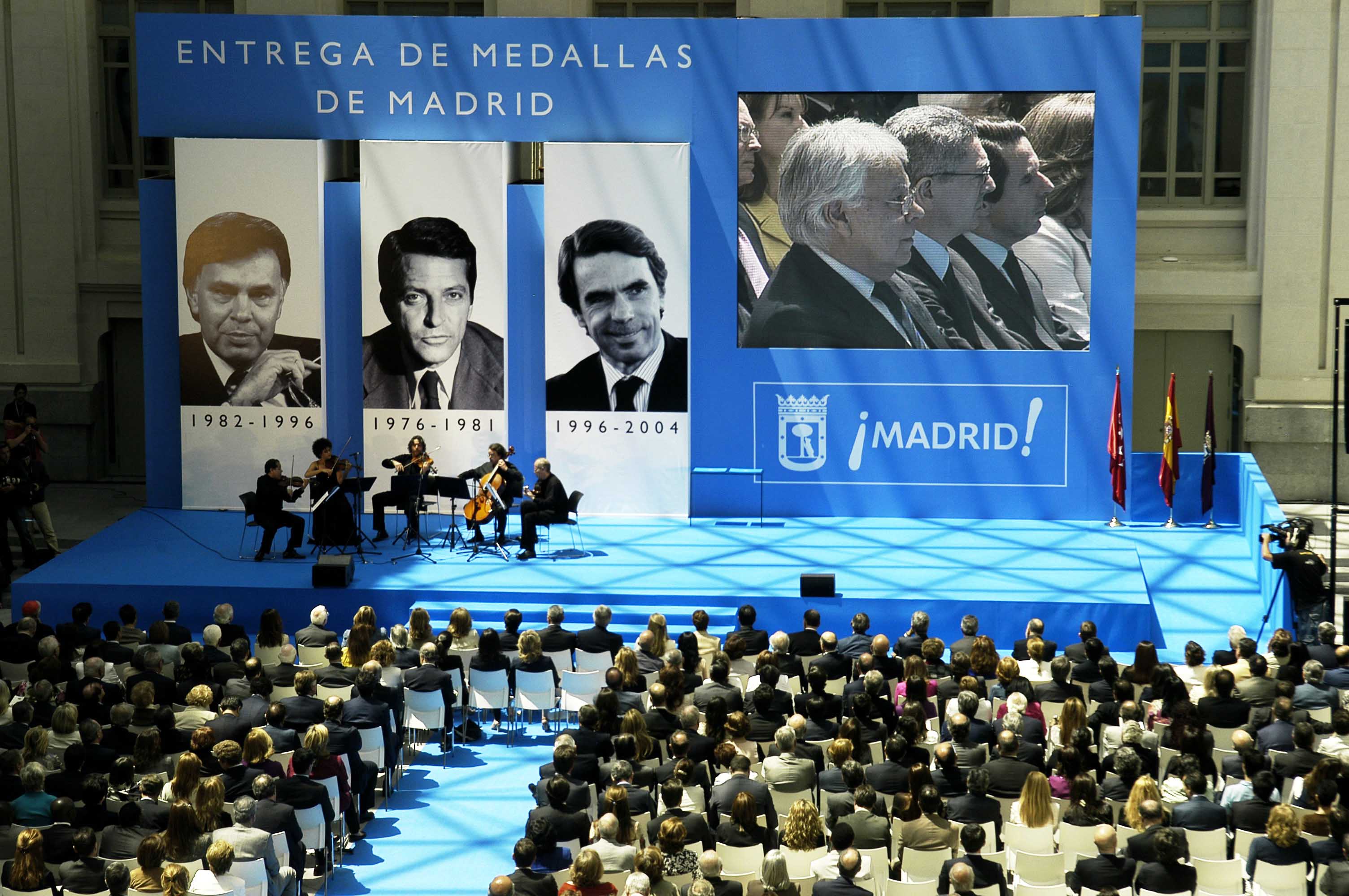 Adolfo Suárez, Felipe González y José María Aznar –junto con Leopoldo Calvo Sotelo a quien recientemente la Ciudad de Madrid rindió un particular homenaje– han sido reconocidos con la Medalla de Madrid. El acto ha sido presidido por el alcalde Alberto Ruiz-Gallardón en el Palacio de Cibeles.