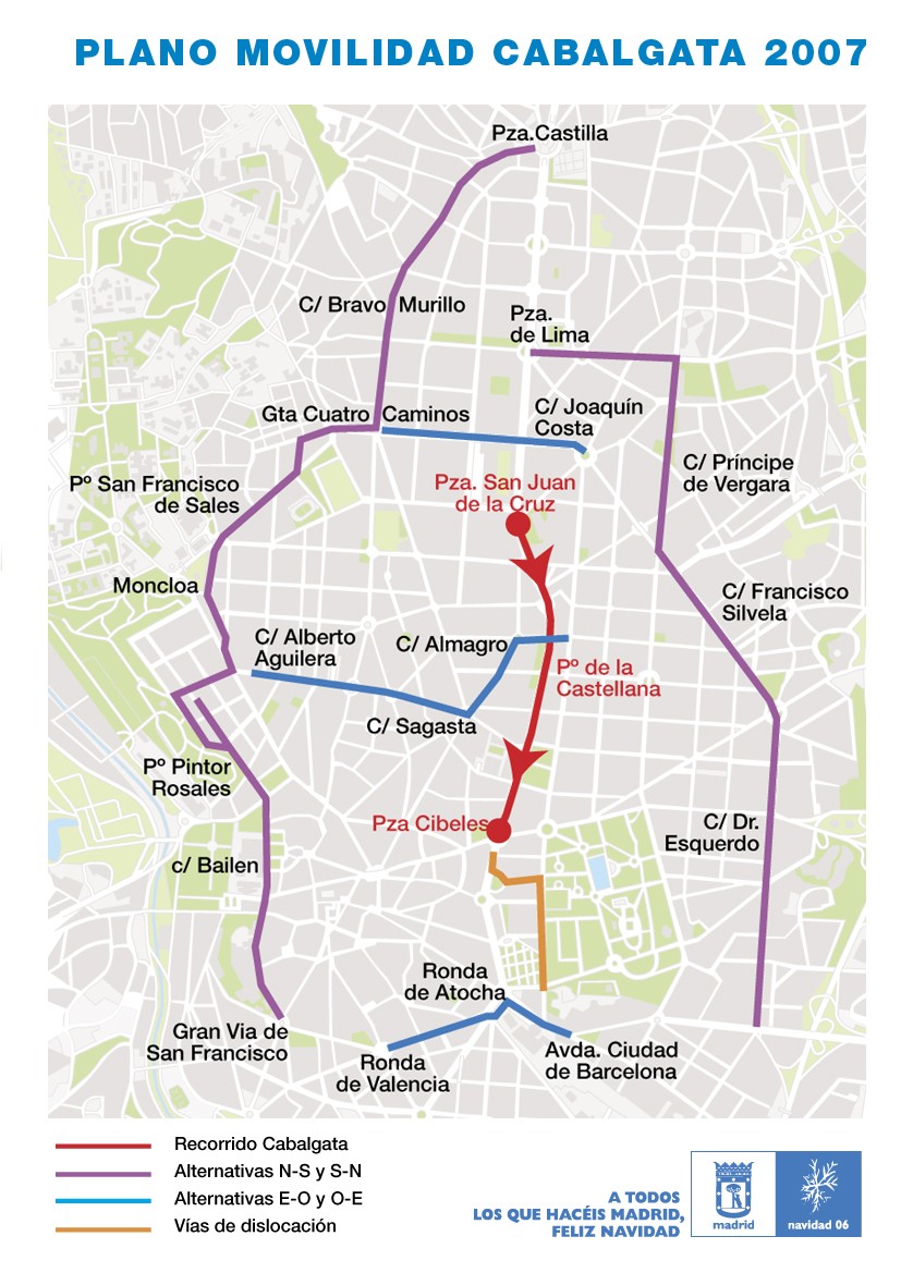 La Cabalgata partirá a las 18,00 horas de la calle de la plaza de San Juan de la Cruz, para continuar por el paseo de la Castellana, plaza de Colón y paseo de Recoletos para finalizar en la plaza de Cibeles.