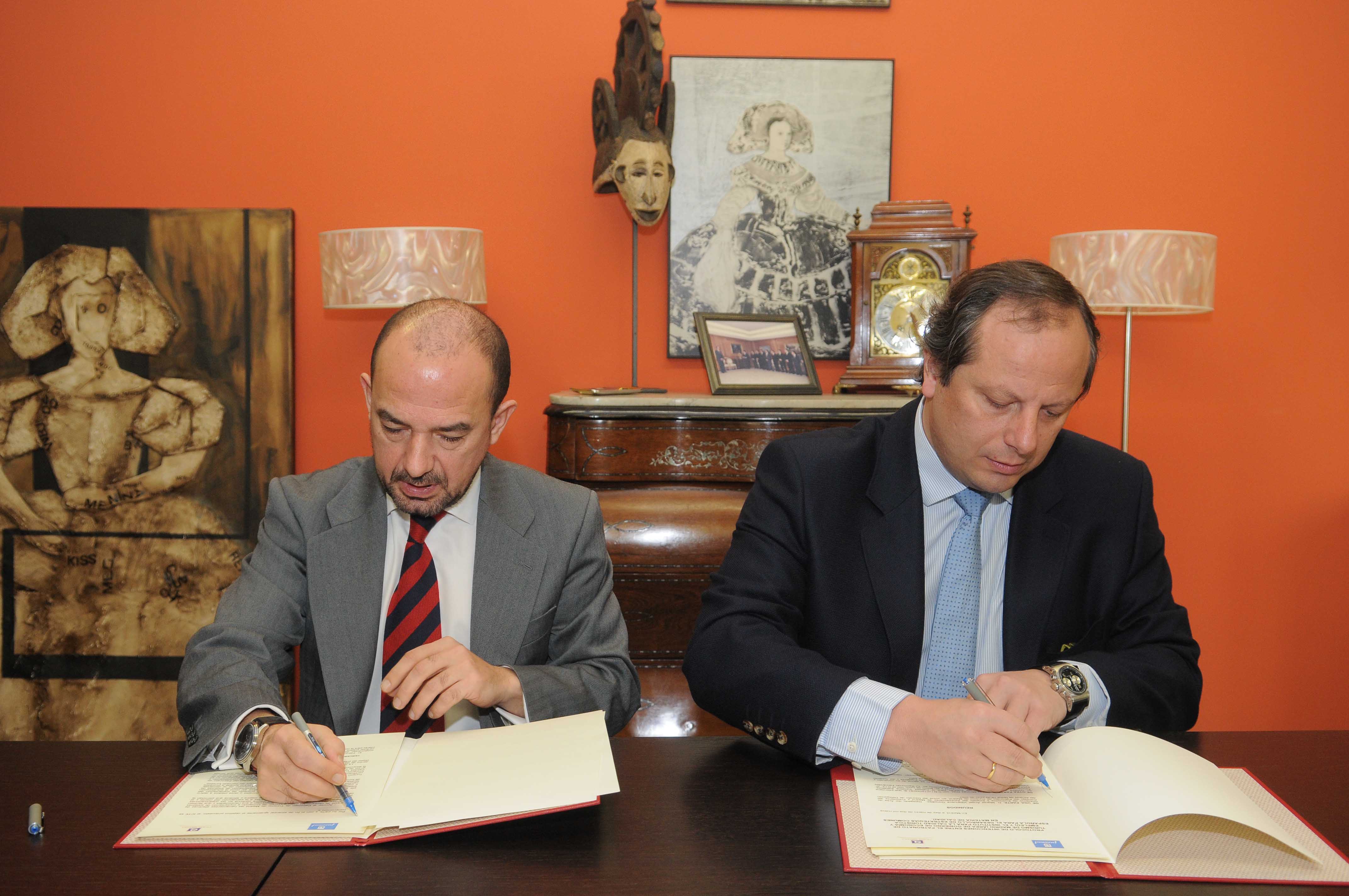 La firma del protocolo ha sido realizada esta mañana por el delegado de Economía y Empleo, Miguel Ángel Villanueva, y el presidente de Instituto para la Calidad Turística Española (ICTE), Miguel Mirones. Ambos, durante la celebración del acto en la sede del Área de Gobierno de Economía y Empleo.