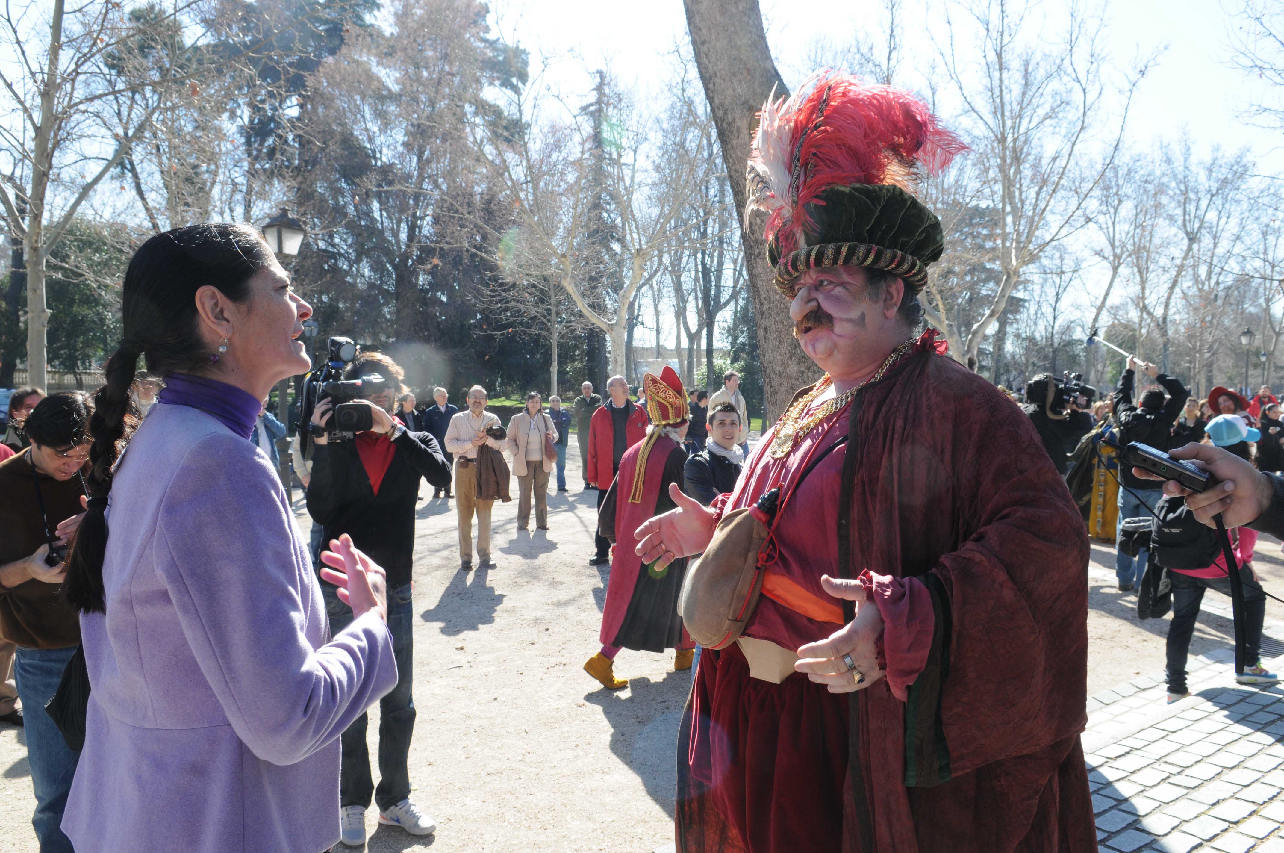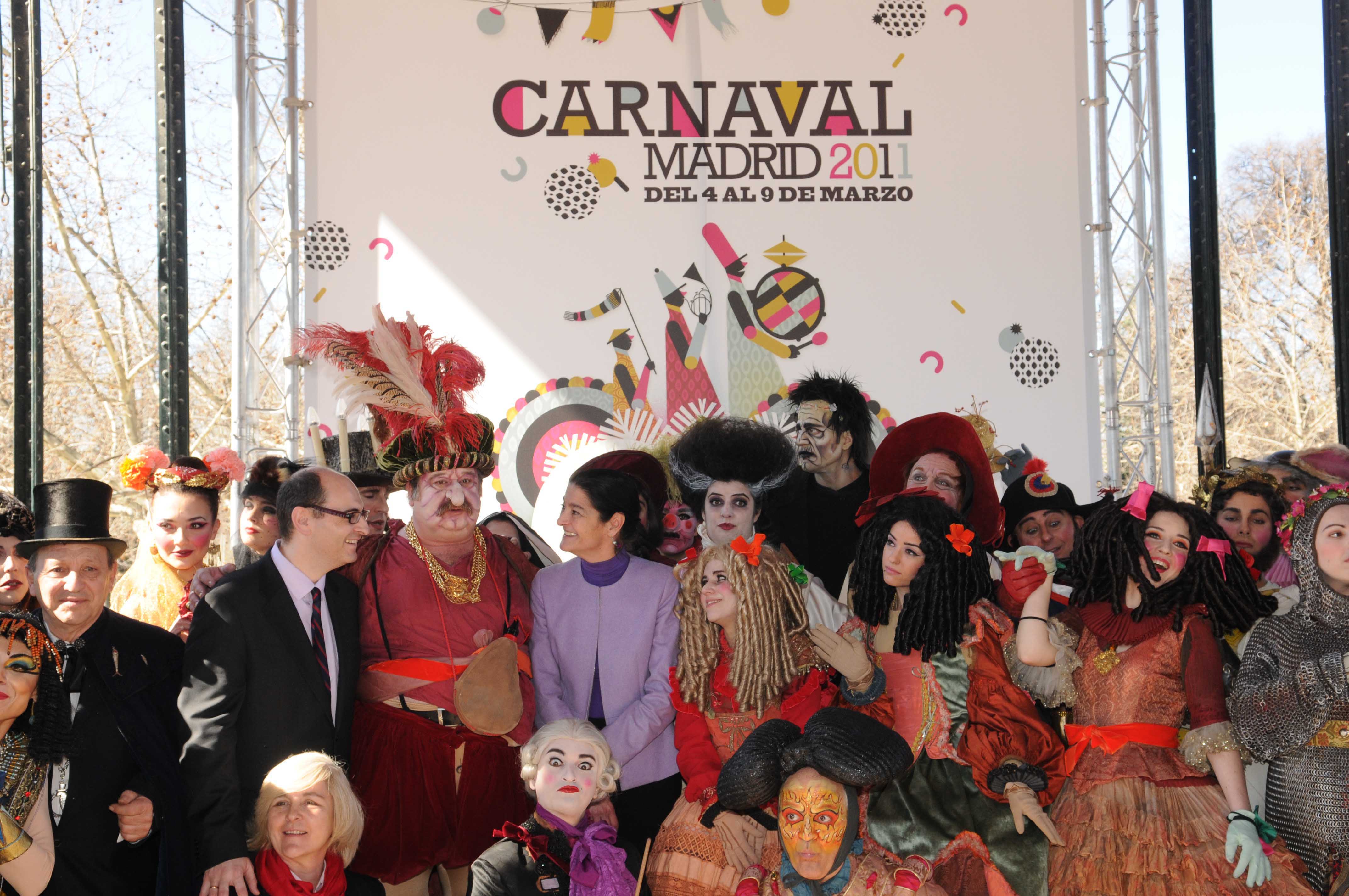 La delegada de Las Artes, Alicia Moreno, entre un grupo de actores caracterizados de "extravagantes personajes" que esta mañana han adelantado en El Retiro el Carnaval 2011, celebración que comenzará el día 4 de marzo. En la presentación también ha estado presente el director general de Actividades Culturales del Ayuntamiento de Madrid, Manuel Lago, y la coordinadora artística del Área, Delia Piccirili.
