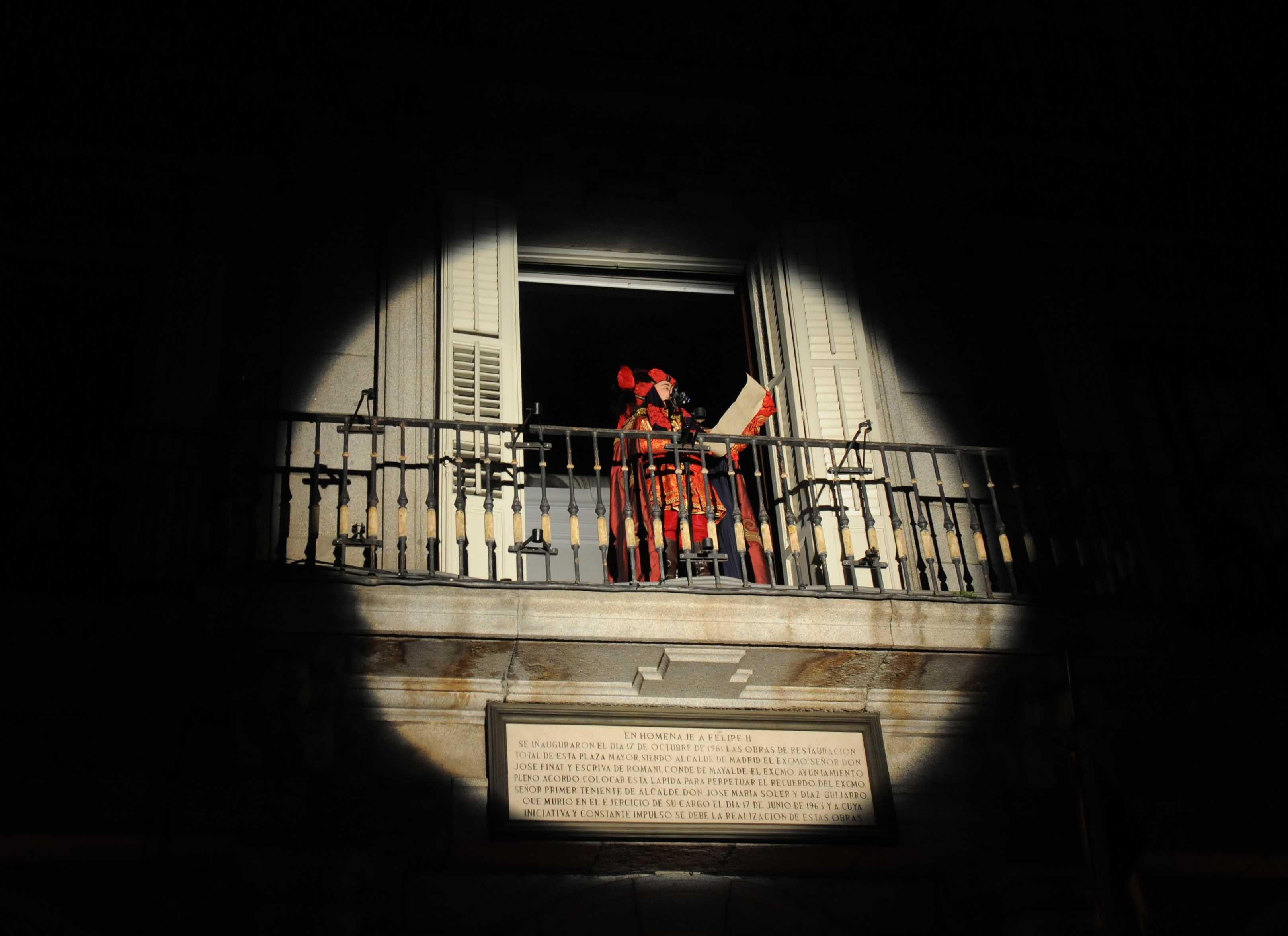 Desde el balcón de la Casa de la Panadería el Mensajero de la Navidad se dirigió a los madrileños promulgando que "la Navidad es el tiempo en el que se funden al calor del cariño las distancias entre generaciones, cuando los mayores revivís los dulces recuerdos de la infancia y los niños aprendéis que la experiencia de vuestros mayores es el gran tesoro de vuestras vidas". Para este personaje de buenas nuevas las luces navideñas "son como el faro que Madrid proyecta hacia el universo para indicar el camino a la Estrella de Oriente en su viaje hacia vuestros hogares y vuestro corazones".
