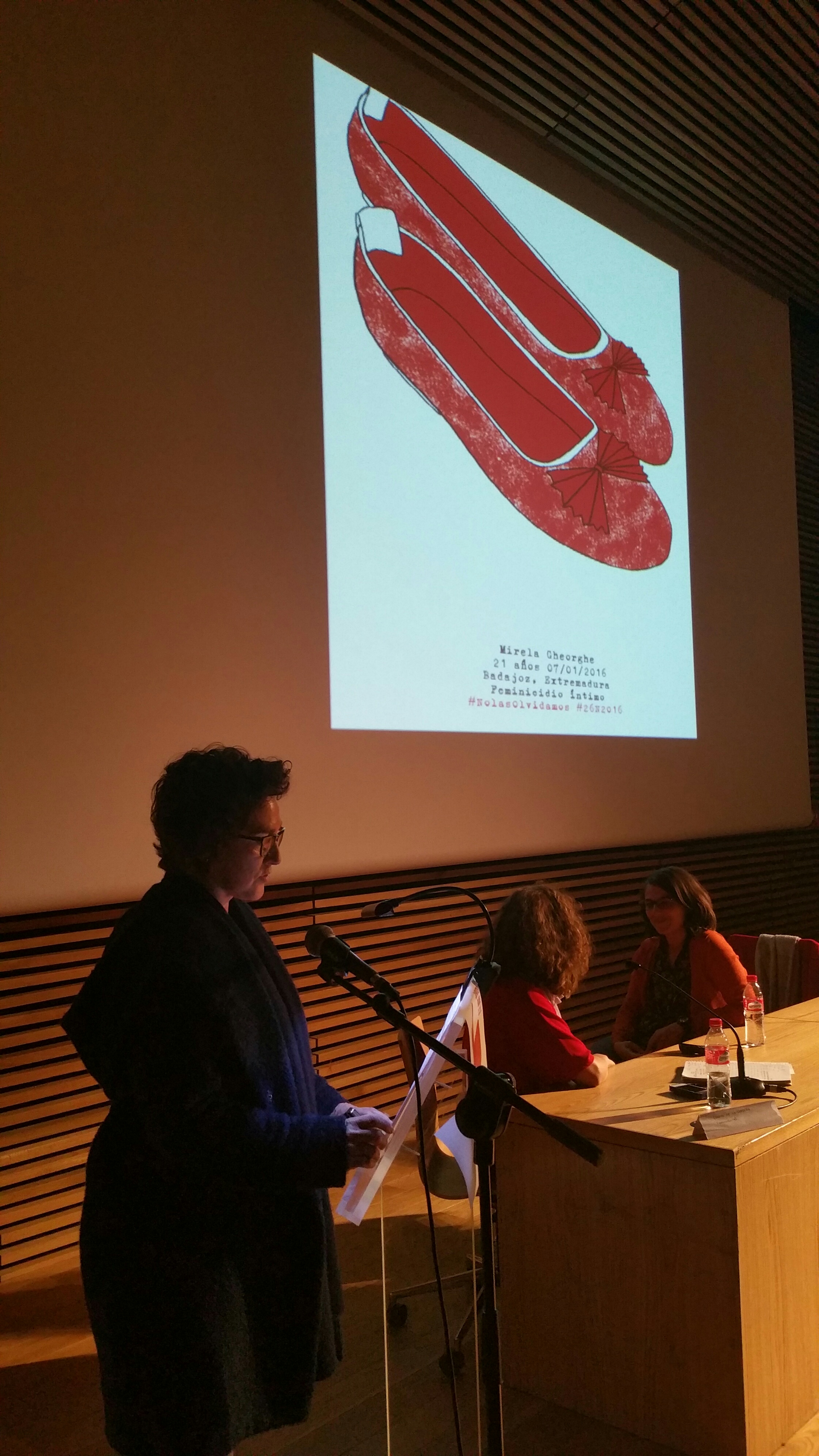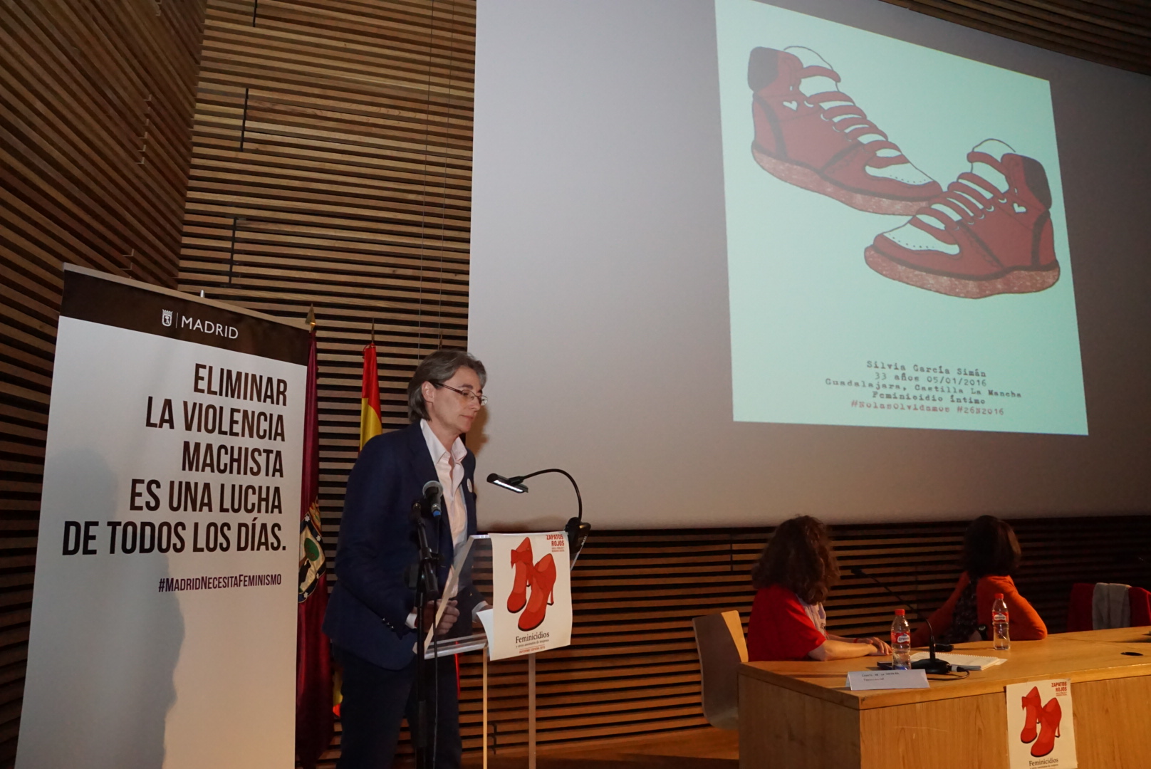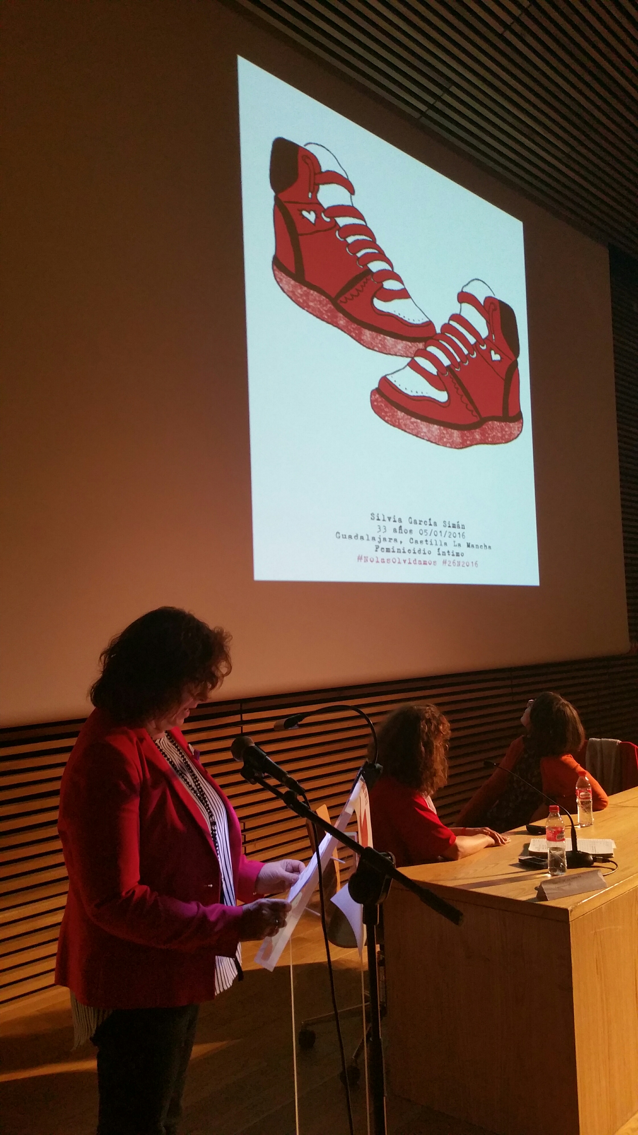 Mientras Marta Higueras, delegada de Equidad, Derechos Sociales y Empleo, leía el nombre, edad y provincia de residencia de una mujer asesinada, en la pantalla del Centro Cultural Conde Duque se podía ver un Zapato Rojo. De esta manera tan simbólica el Ayuntamiento ha querido hoy rendir homenaje a las 92 mujeres a las que, a lo largo de 2016 se les ha arrebatado la vida de forma violenta.