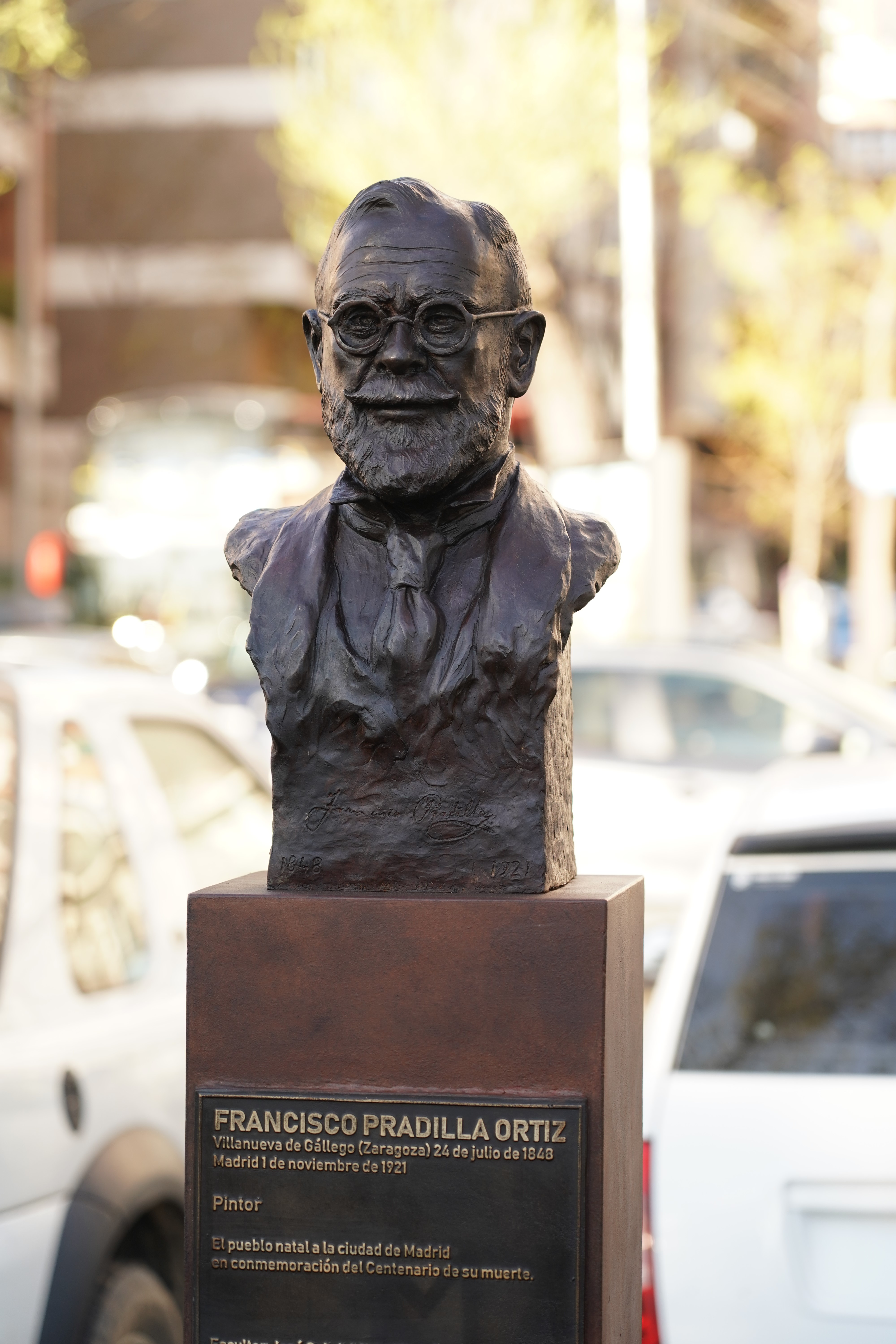 Obra del escultor José Gabriel Astudillo, el busto es uno de los cuatro encargados a este artista madrileño por el Ayuntamiento de Villanueva de Gállego para conmemorar el centenario del fallecimiento de Pradilla. De los otros tres, uno se ha instalado en esa localidad aragonesa y los otros dos han sido donados también a Zaragoza y a Roma, ciudad esta última en la que el pintor se formó y ocupó el cargo de director de la Real Academia Española.