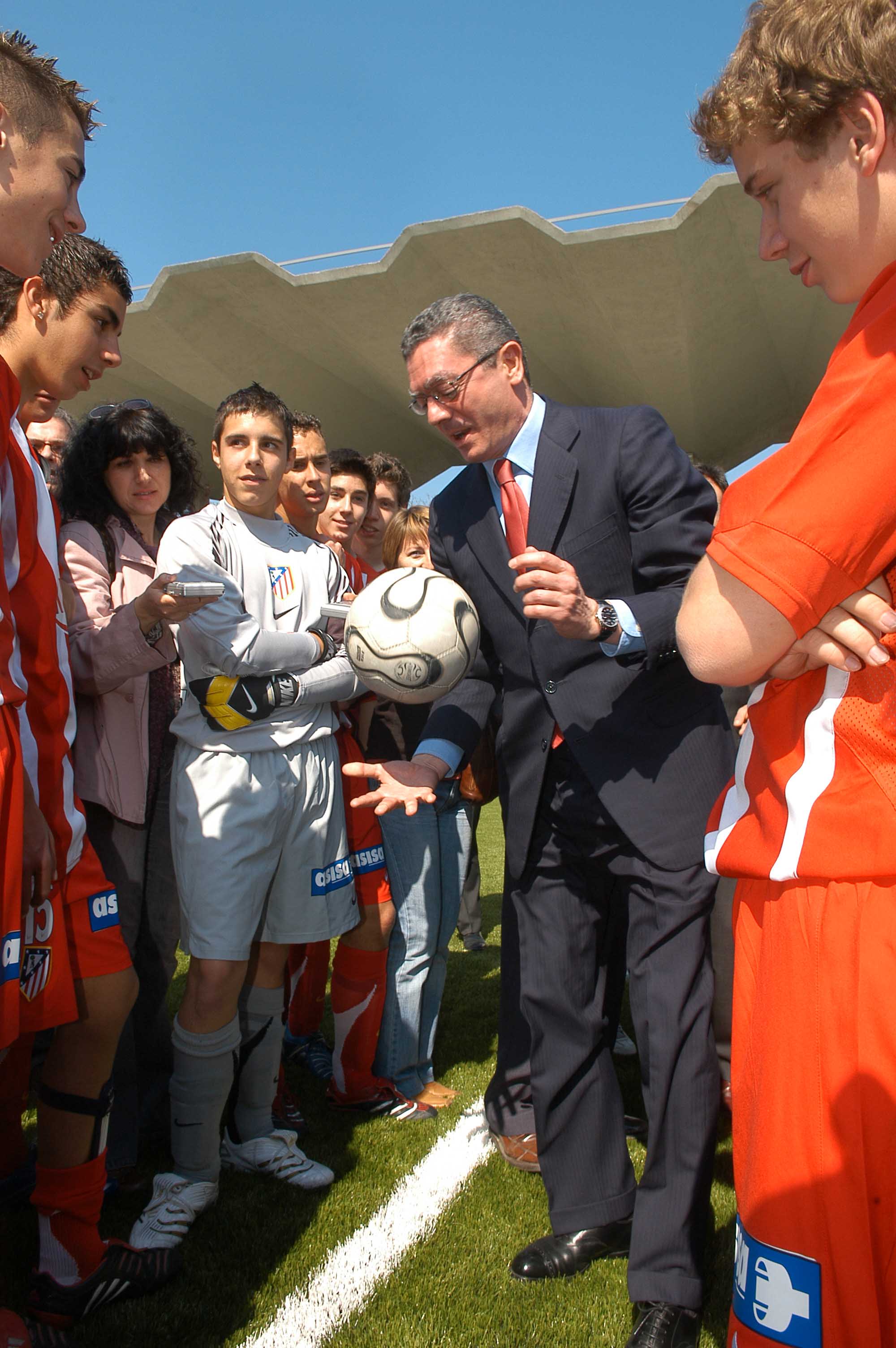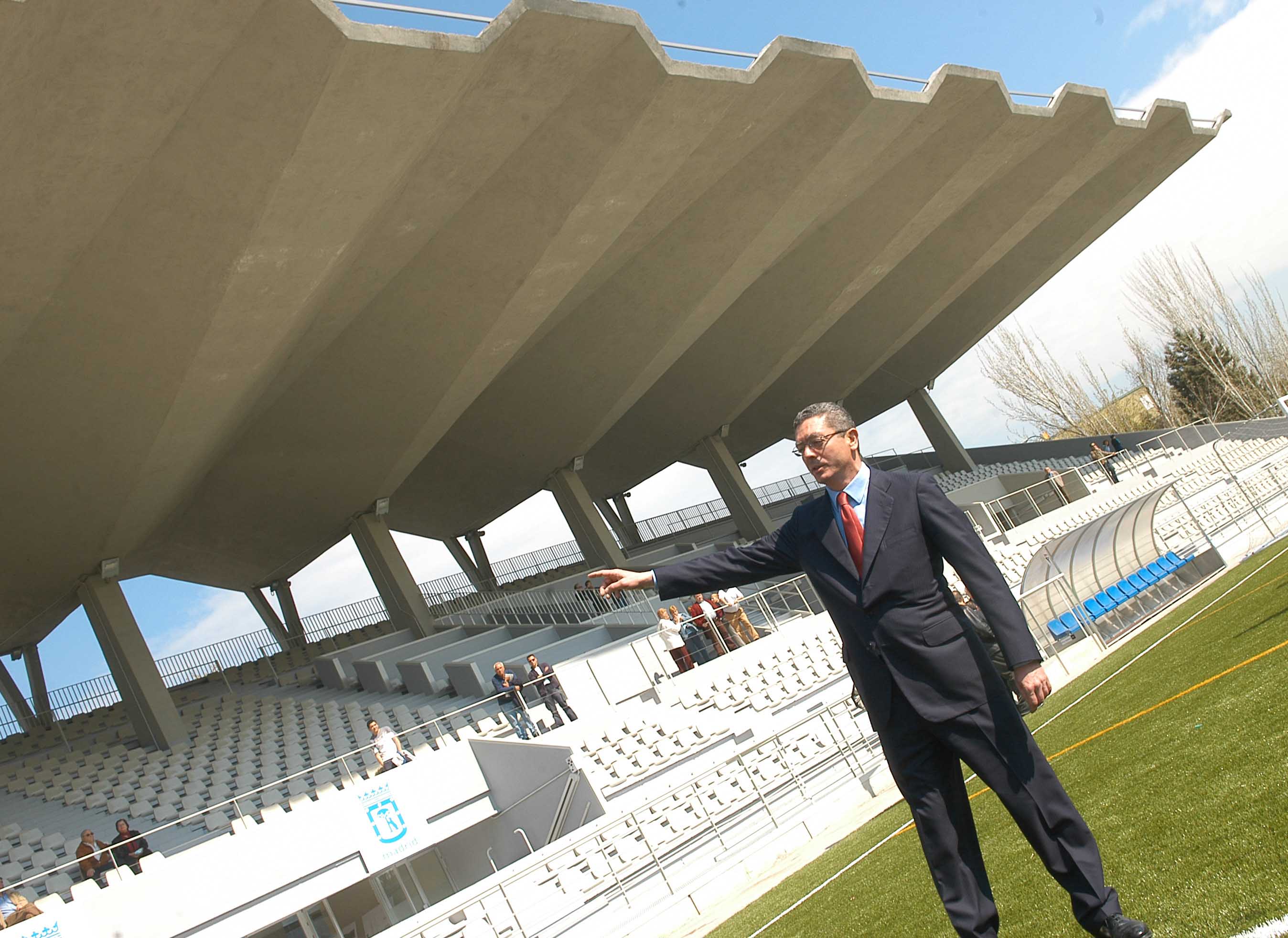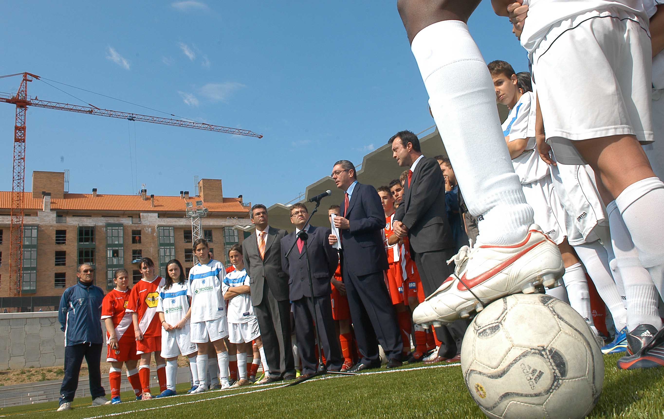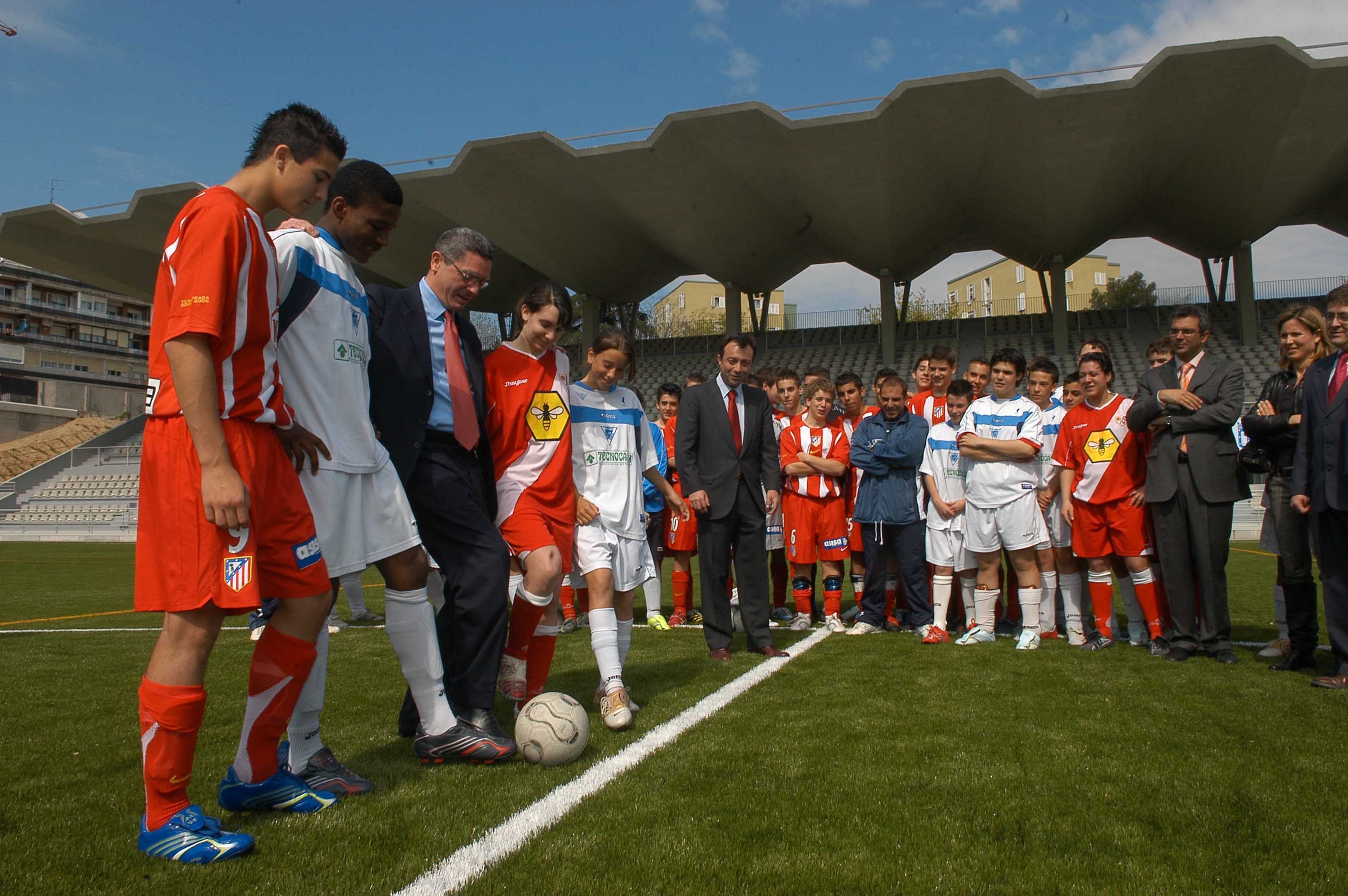 El alcalde de la Ciudad de Madrid, Alberto Ruiz-Gallardón durante la inauguración del del centro deportivo en el antiguo Canóromo que, con un aforo de 4.000 asientos, se convierte en uno de los campos de fútbol más importantes de la ciudad