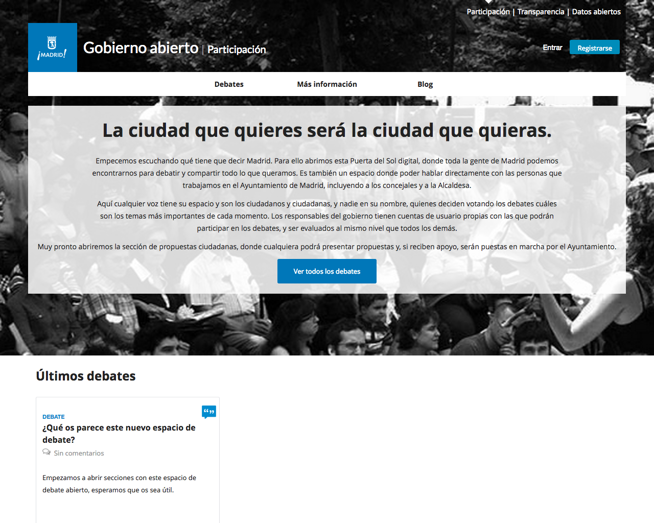 Hoy se ha puesto en funcionamiento el nuevo portal de Gobierno Abierto del Ayuntamiento de Madrid. La web se estructura en tres secciones: participación, transparencia y datos abiertos. Las dos últimas secciones enlazan, por el momento, con las páginas de transparencia y datos abiertos ya existentes, e irán siendo reemplazadas por fases.