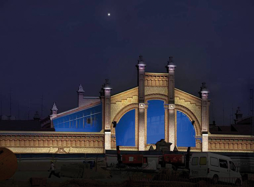 Respecto a los 170 metros de fachada del antiguo Mercado de Frutas y Verduras que dan al río, se les ha dado un baño de color con luz dinámica, con cambios cromáticos que evocan el movimiento y el bullicio que caracterizaba a la antigua actividad en el edificio, utilizando para ello 312 tubos fluorescentes de color de 1´50 metros.