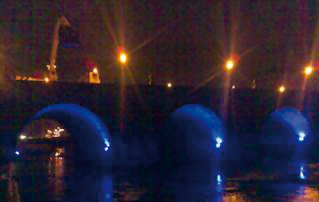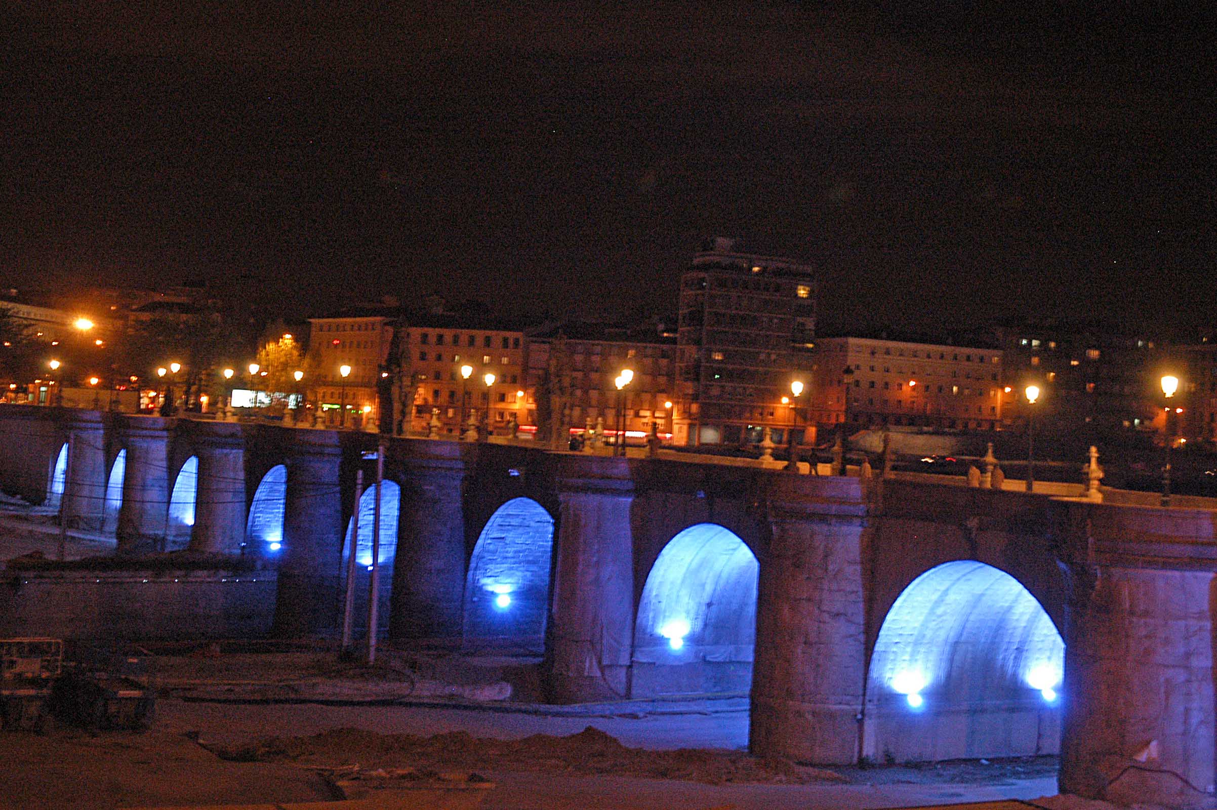 - Las bóvedas de los puentes históricos del Rey, de Segovia y de Toledo se han bañado con luz azul para reforzar la visión nocturna y permitir la visualización del río mediante los reflejos que la luz de las bóvedas produce en el agua