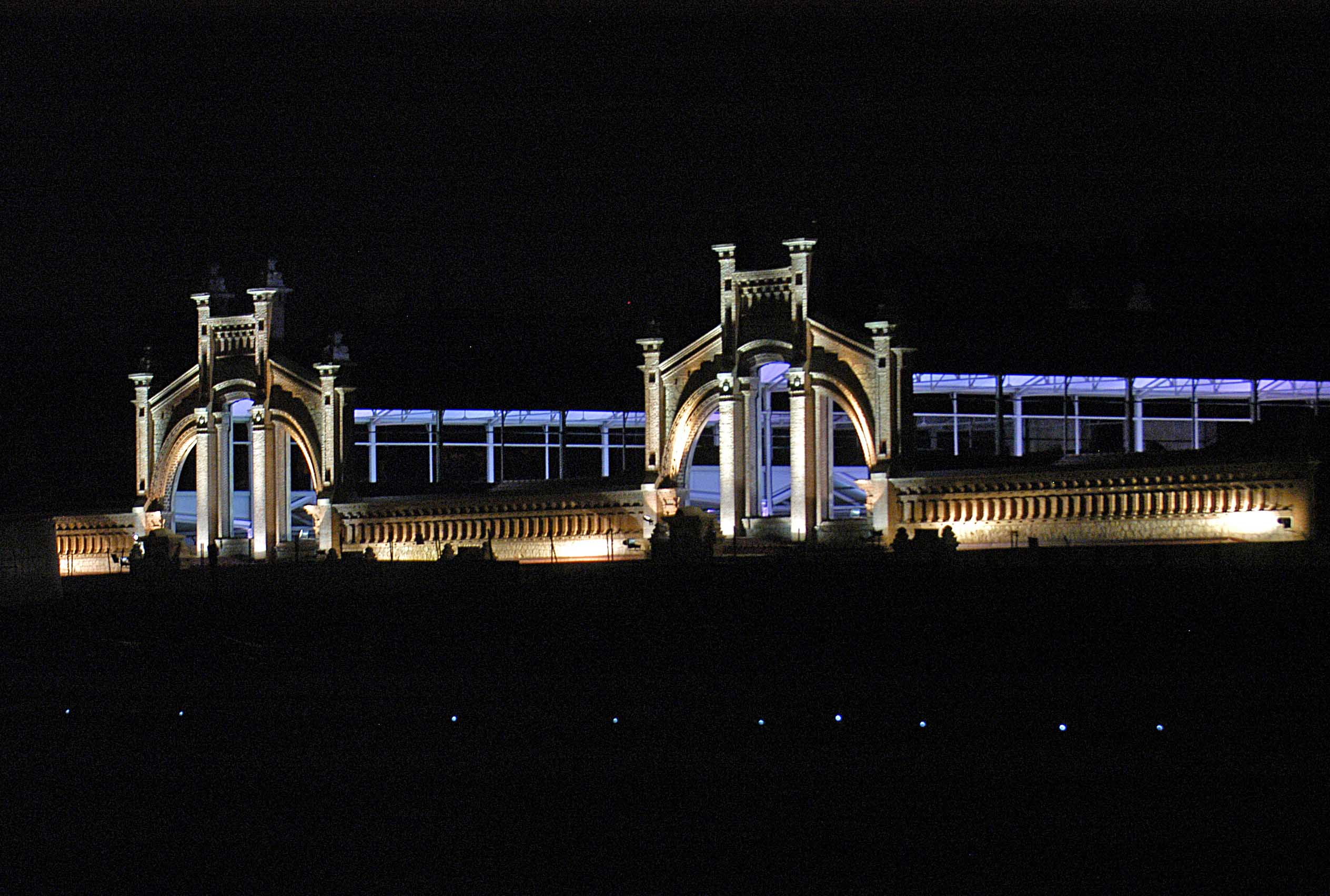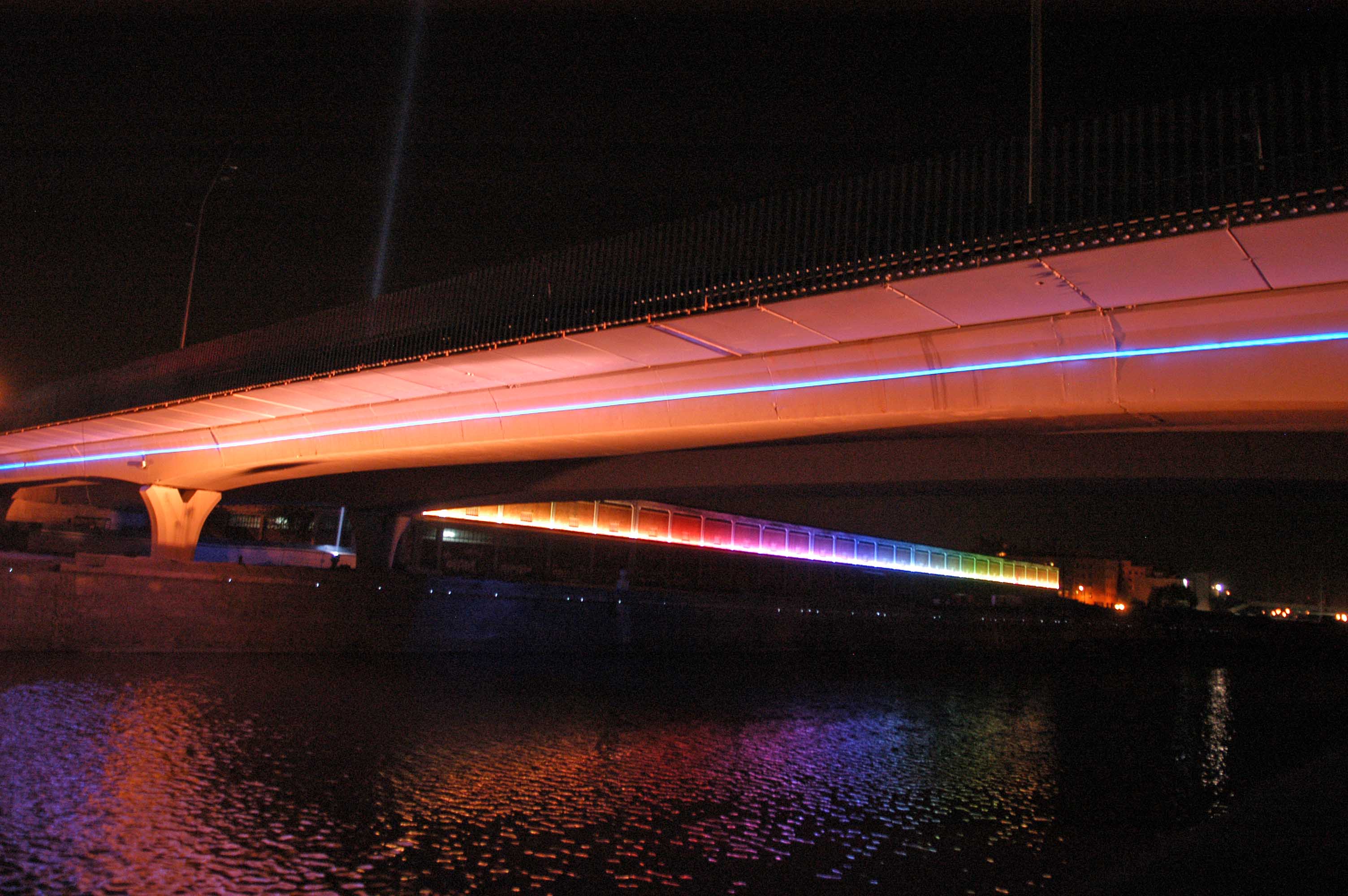 - En los puentes modernos de San Isidro, de Praga y de la Princesa se ha colocado a ambos lados una línea de luz azul de 900 metros· Se ha prestado una especial atención a los edificios singulares del entorno: el Matadero y el antiguo Mercado de Frutas y Verduras