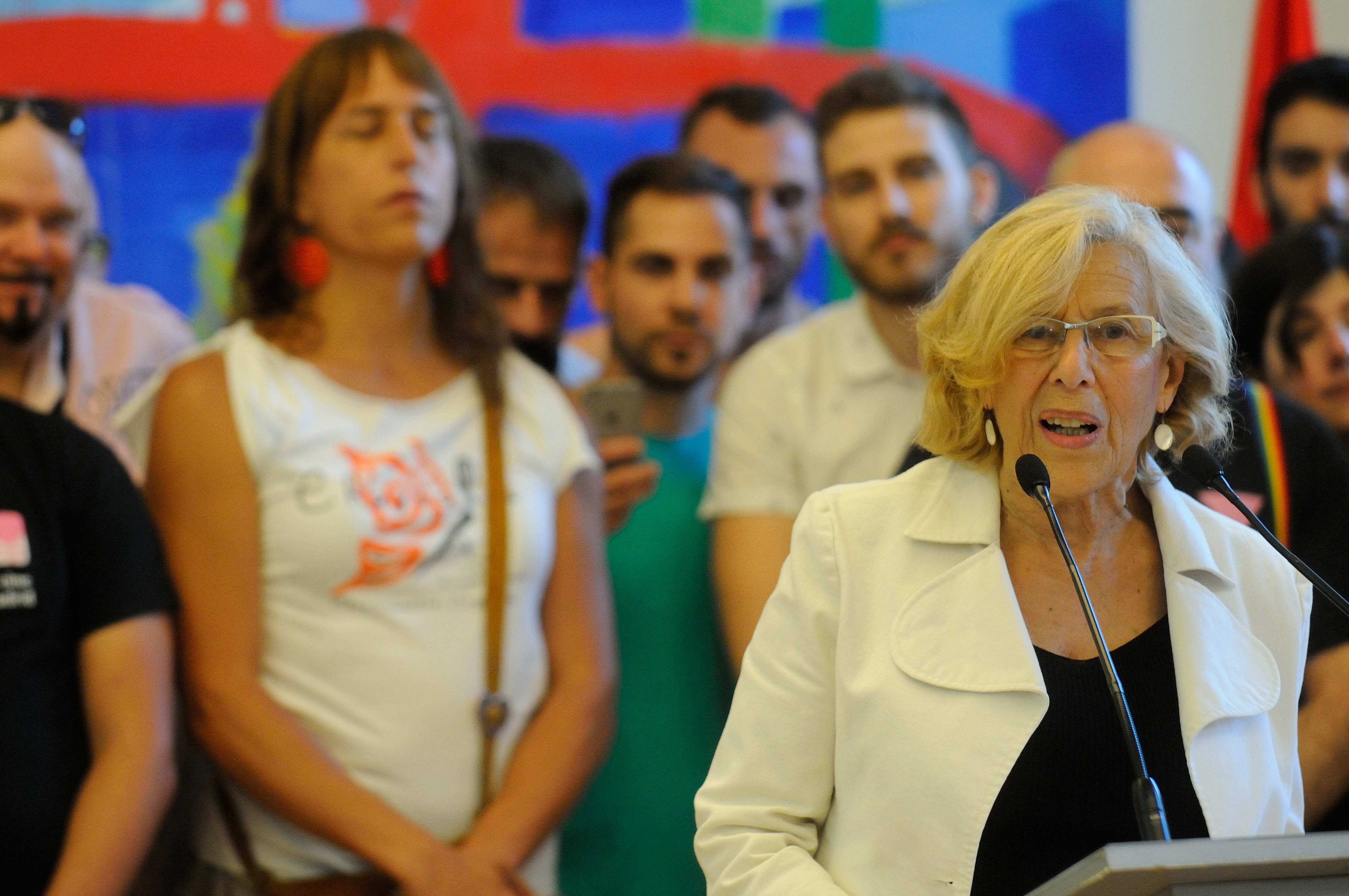 La alcaldesa, Manuela Carmena, ha presidido el acto de izado de una bandera arcoíris en la sede del Ayuntamiento y el despliegue de otra en la fachada de Cibeles.