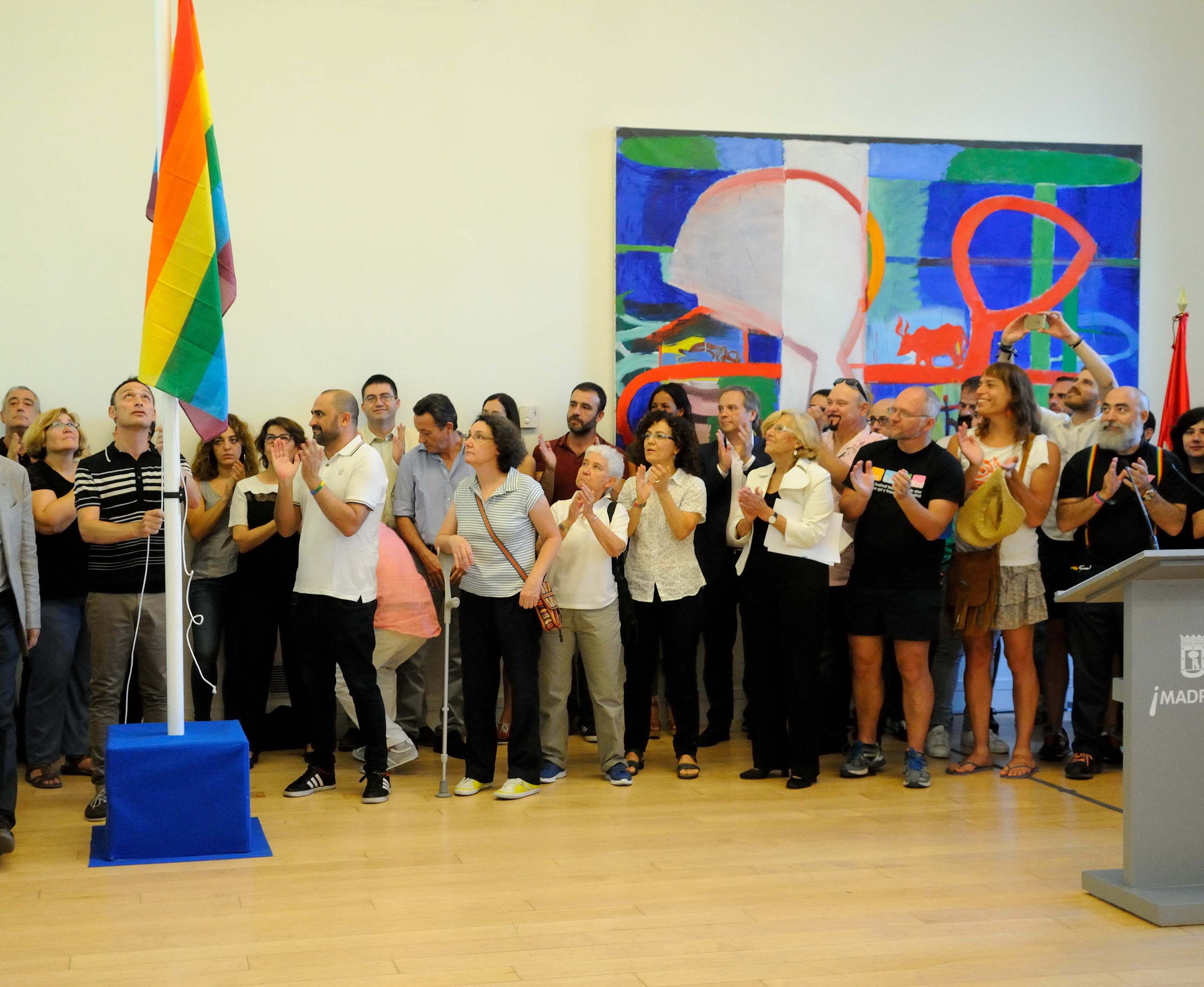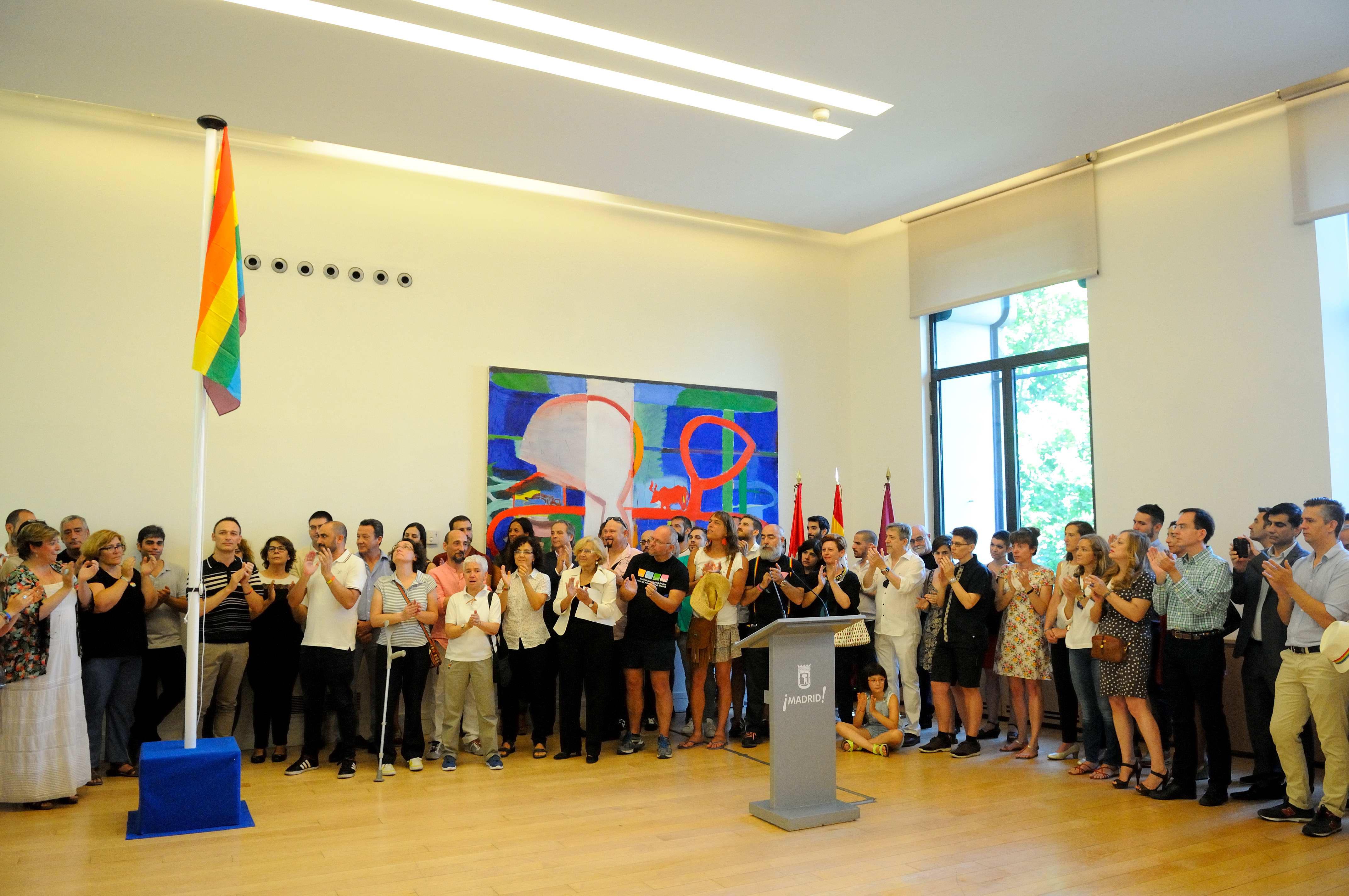 Antes del despliegue de la bandera en la fachada, Manuela Carmena, ha presidido en una de las salas institucionales de Cibeles la izada de una bandera arcoíris a cargo del viudo de Pedro Zerolo, Jesús Santos, en un acto en el que han participado concejales de todos los grupos municipales del Ayuntamiento. Entre los asistentes han estado Miguel Antonio Carmona, por PSOE, Begoña Villacís, por Ciudadanos e Iñigo Enríquez de Luna, por el PP.