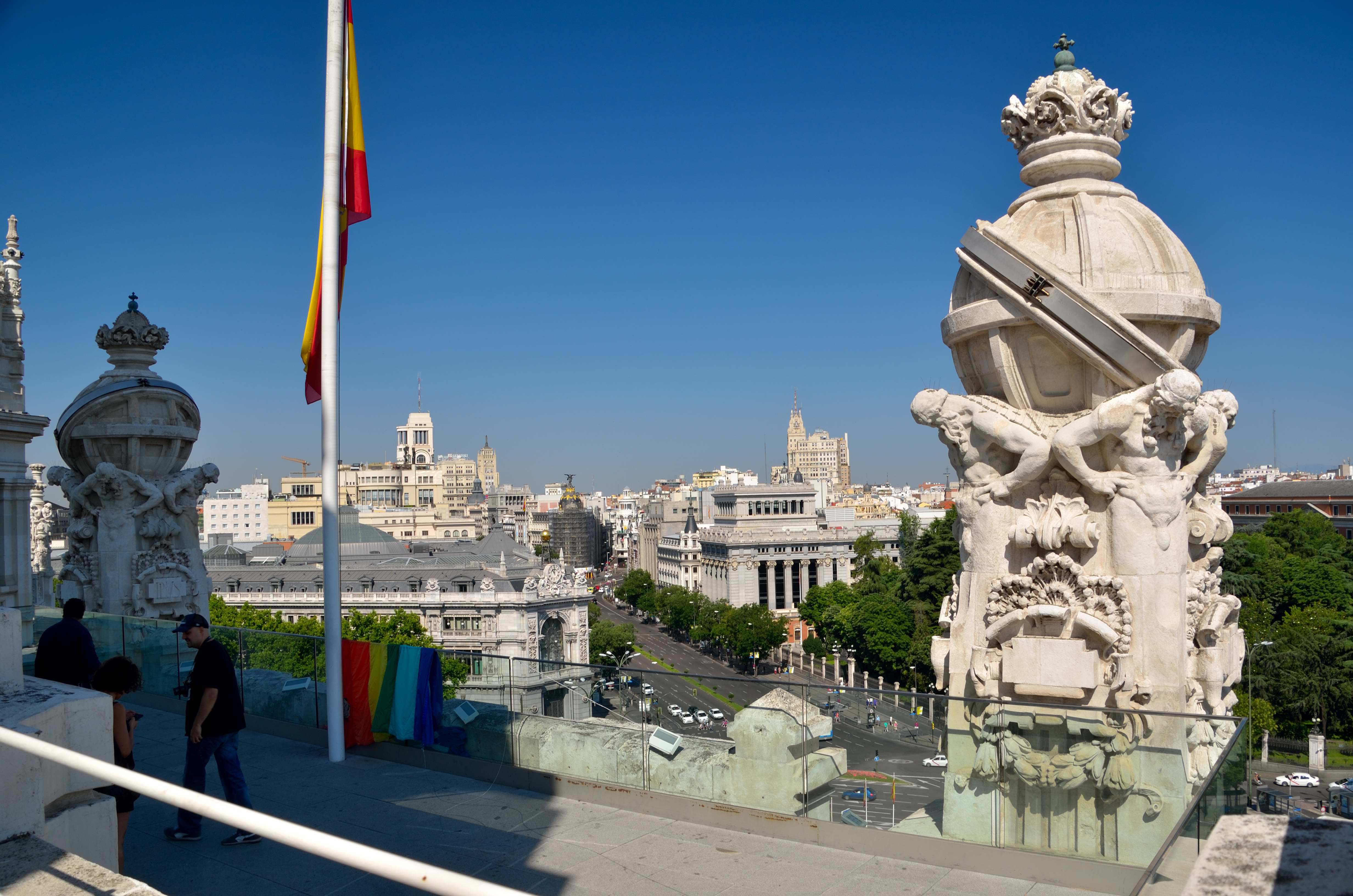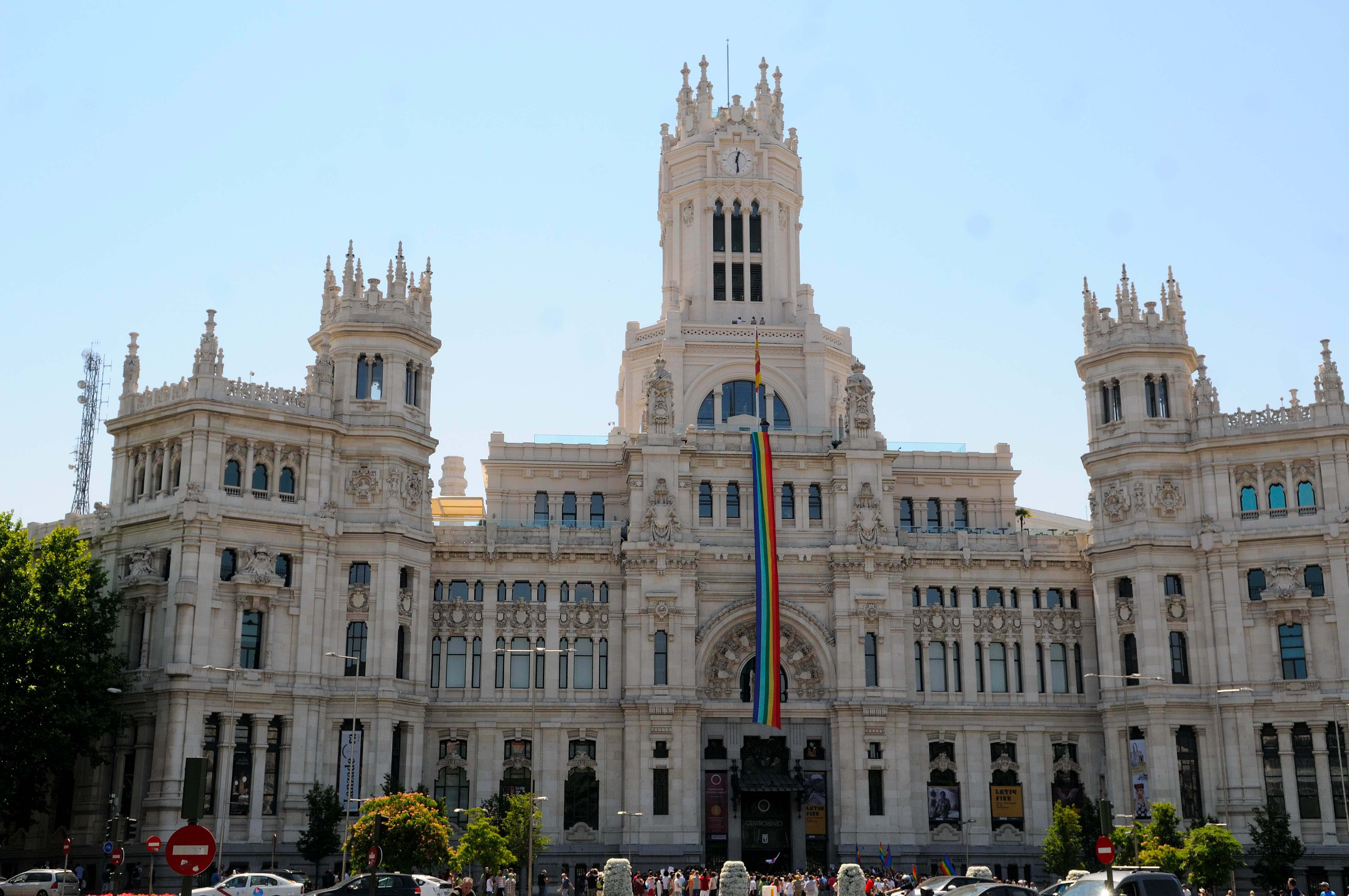 Una enorme bandera arcoíris cuelga desde este mediodía en la fachada del Palacio de Cibeles. Fue desplegada al término de un acto de izada de bandera en la sede del Ayuntamiento en el que participaron representantes de colectivos LGTB y concejales de la corporación.