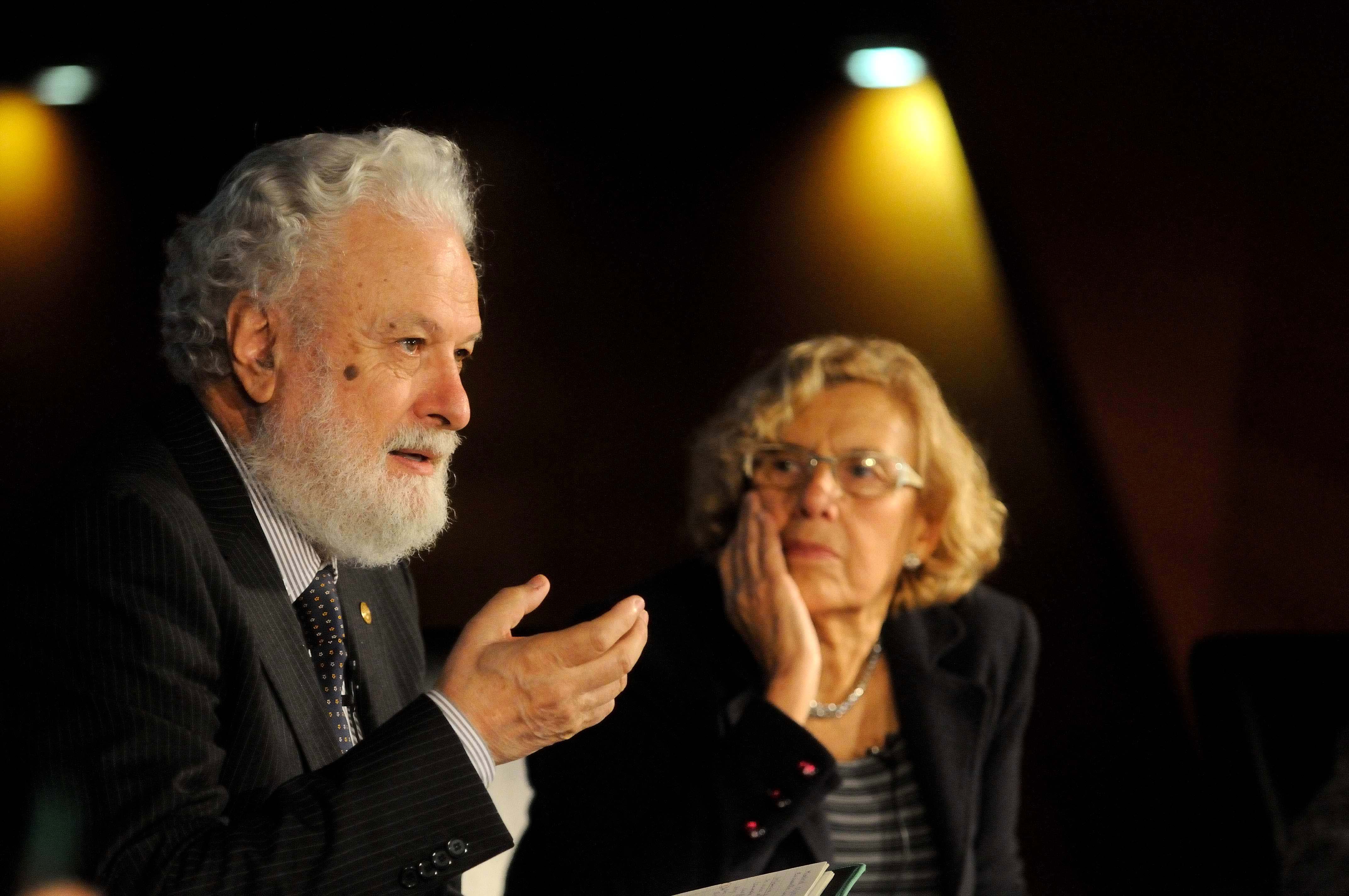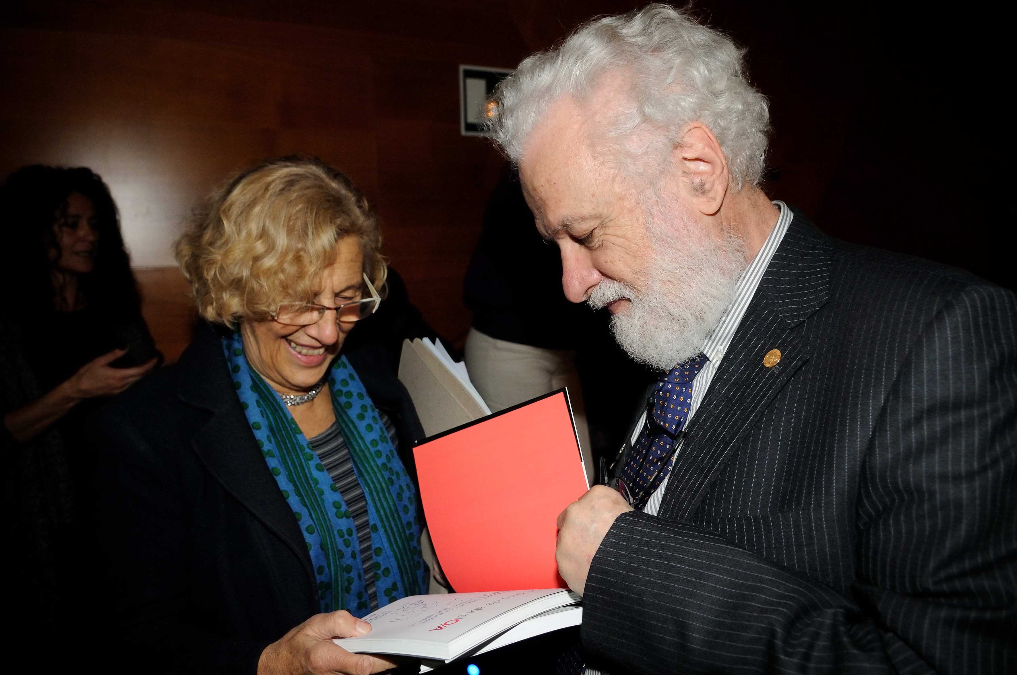 La alcaldesa de Madrid, Manuela Carmena, con el psicopedagogo Francesco Tonucci en el auditorio de CentroCentro Cibeles.