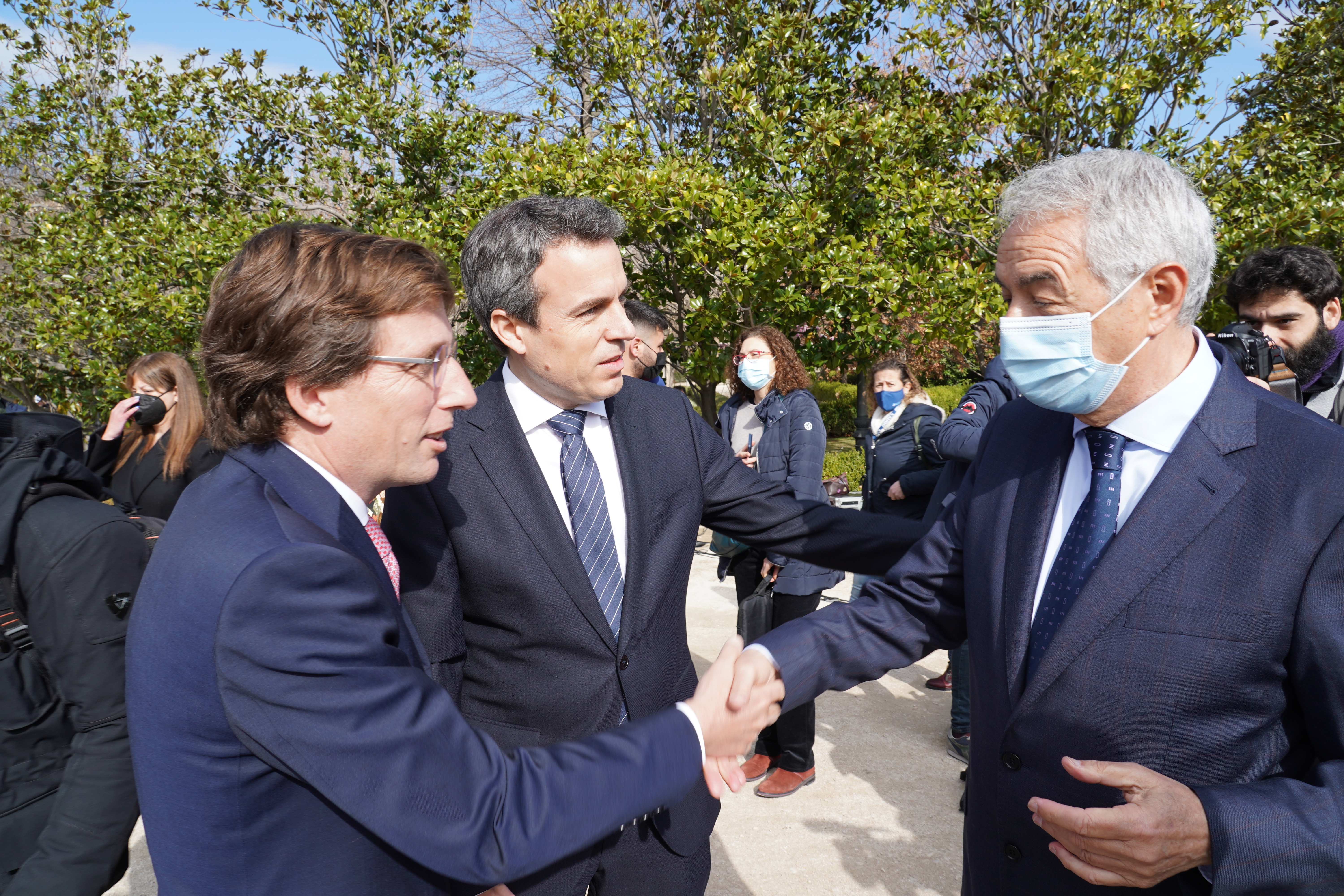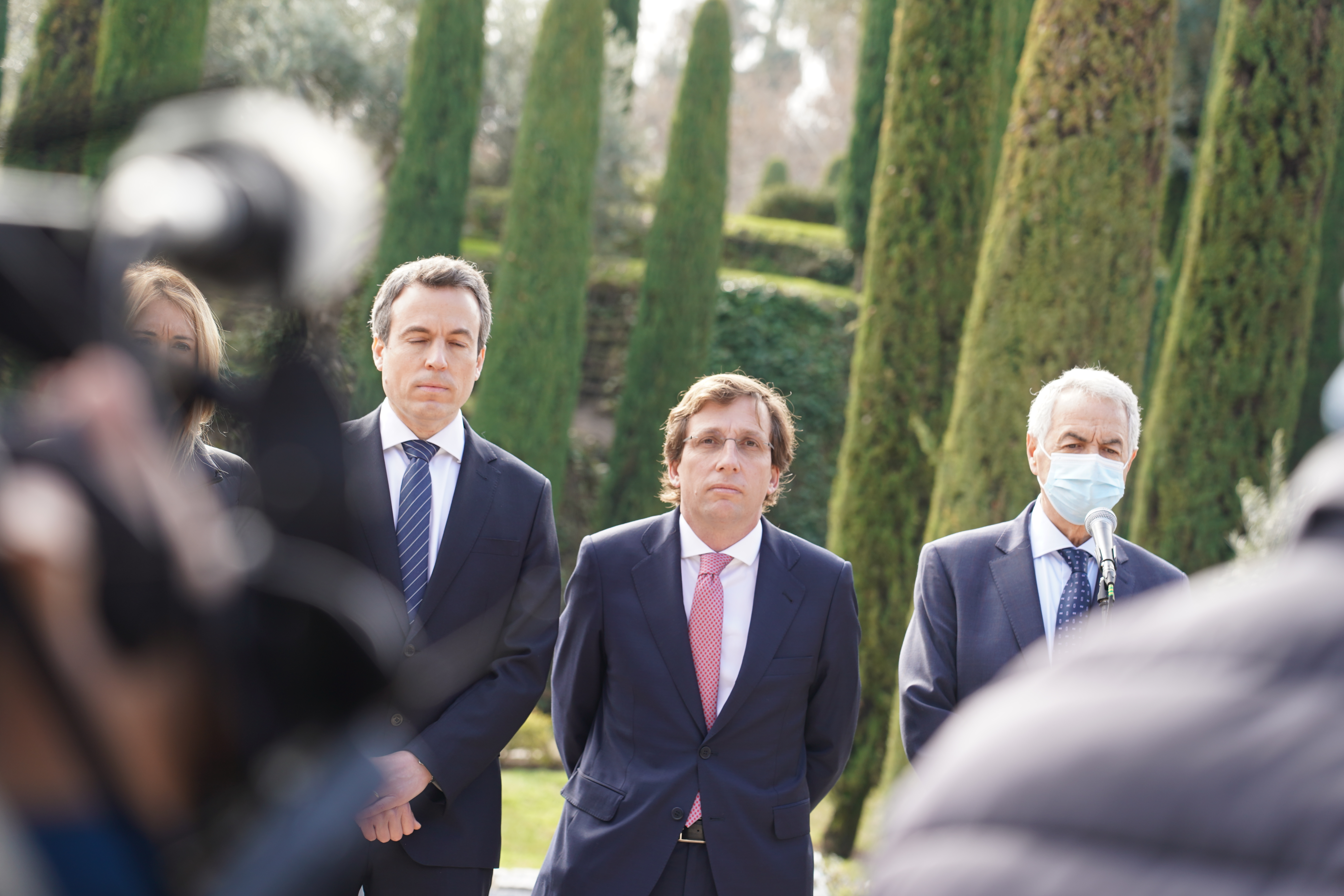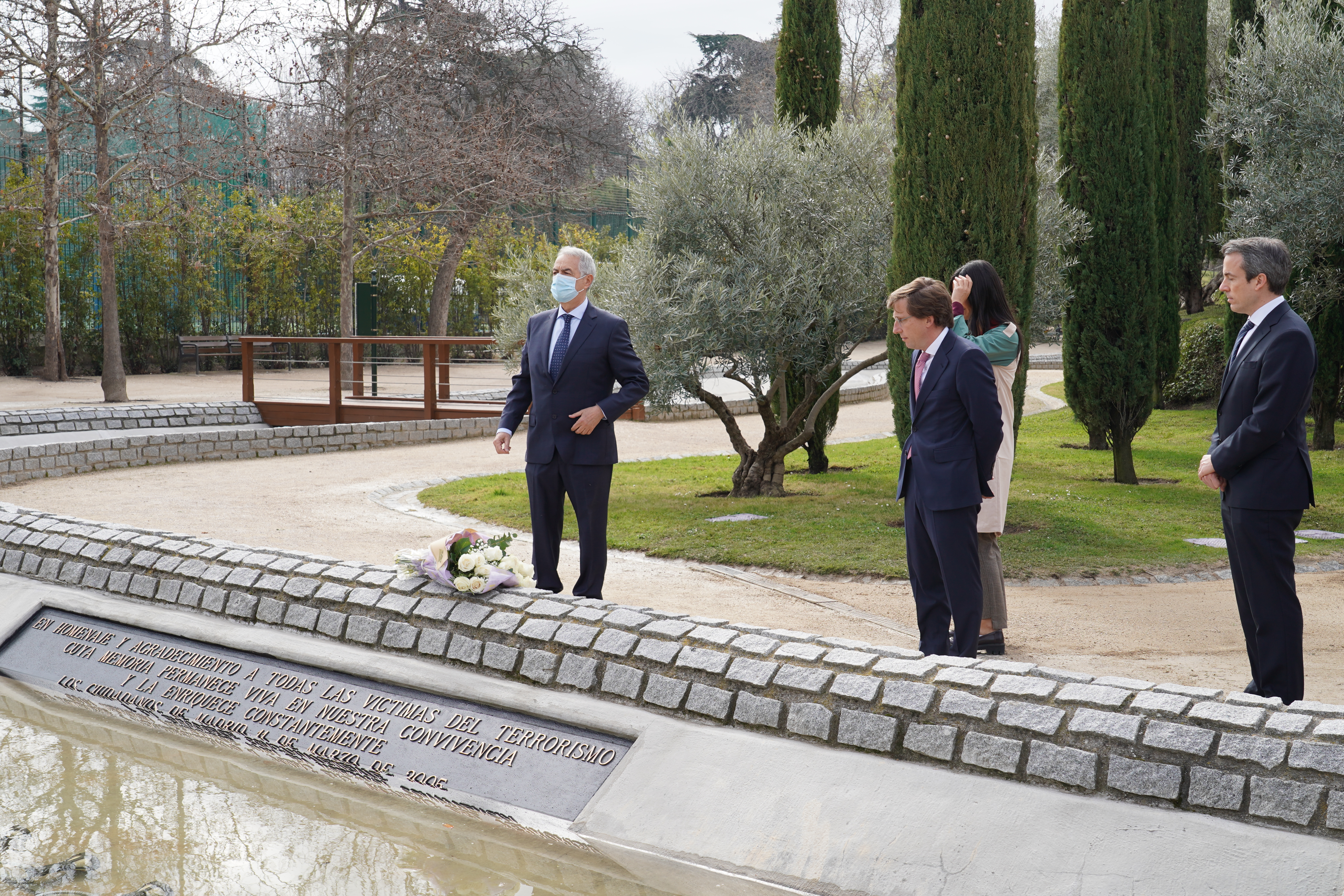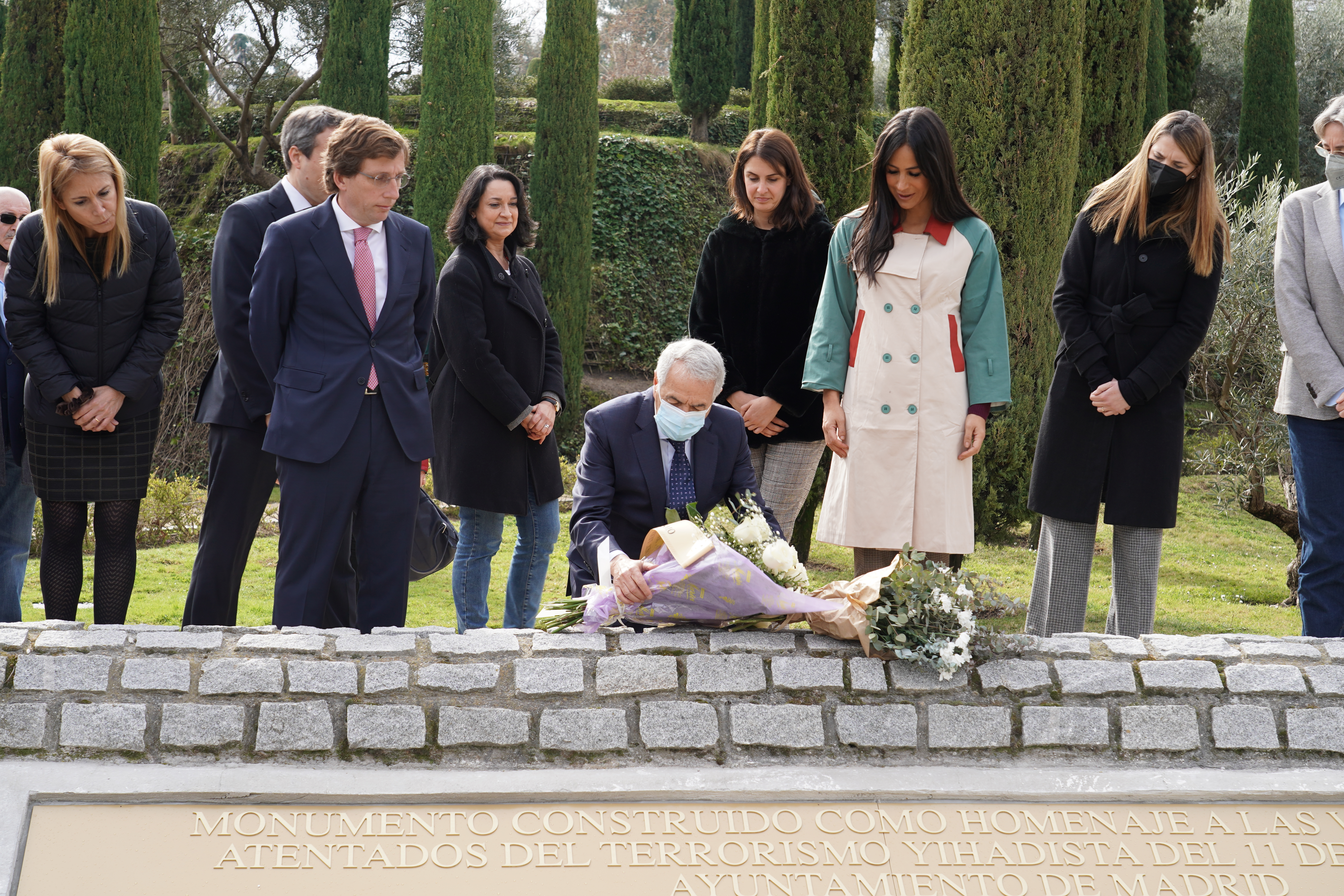 ‘Monumento construido como homenaje a las víctimas de los atentados del terrorismo yihadista del 11 de marzo de 2004’ es la leyenda que reza en la placa conmemorativa que el alcalde de Madrid, José Luis Martínez-Almeida, ha inaugurado hoy en el Bosque del Recuerdo del parque de El Retiro junto a la vicealcaldesa, Begoña Villacís; el concejal del distrito, Santiago Saura, representantes de los grupos municipales y el presidente de la Asociación 11M Afectados del Terrorismo, Eulogio Paz.