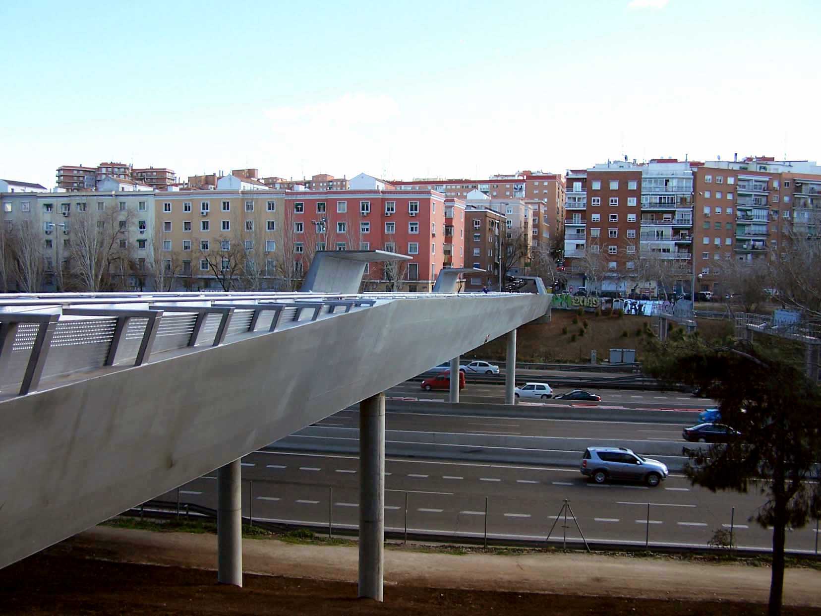 Se trata de una de las seis pasarelas construidas por el Área de Gobierno de Obras y Espacios Públicos en el arco este de la Calle 30, para mejorar la permeabilidad transversal de uno y otro lado de la vía de circunvalación. Una pasarela que se ha resuelto mediante una estructura metálica, integrada por materiales resistentes y funcionales (vigas metálicas y hormigón impreso en la capa de rodadura), cuya estética le da un aspecto continuo y compacto si se observa desde la Calle 30.