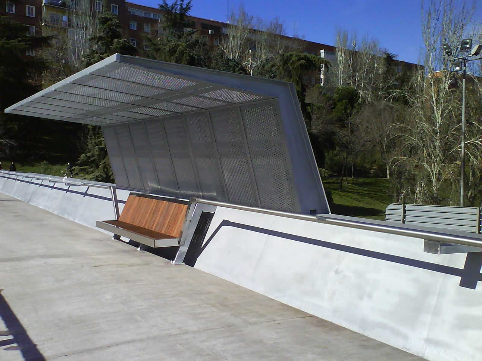 A lo largo de la pasarela, de 5 metros de ancho, también se han ubicado tres zonas de descanso en forma de banco y marquesina, con el fin de ofrecer la posibilidad de paradas intermedias a los usuarios de la misma. Las marquesinas están orientadas de espalda a la dirección de aproximación del tráfico para evitar, en lo posible, el ruido. Además, dos de ellas tienen orientación sur, de manera que el banco esté en zona soleada durante el invierno pero la cubierta proteja de ese sol en verano y también de la lluvia.