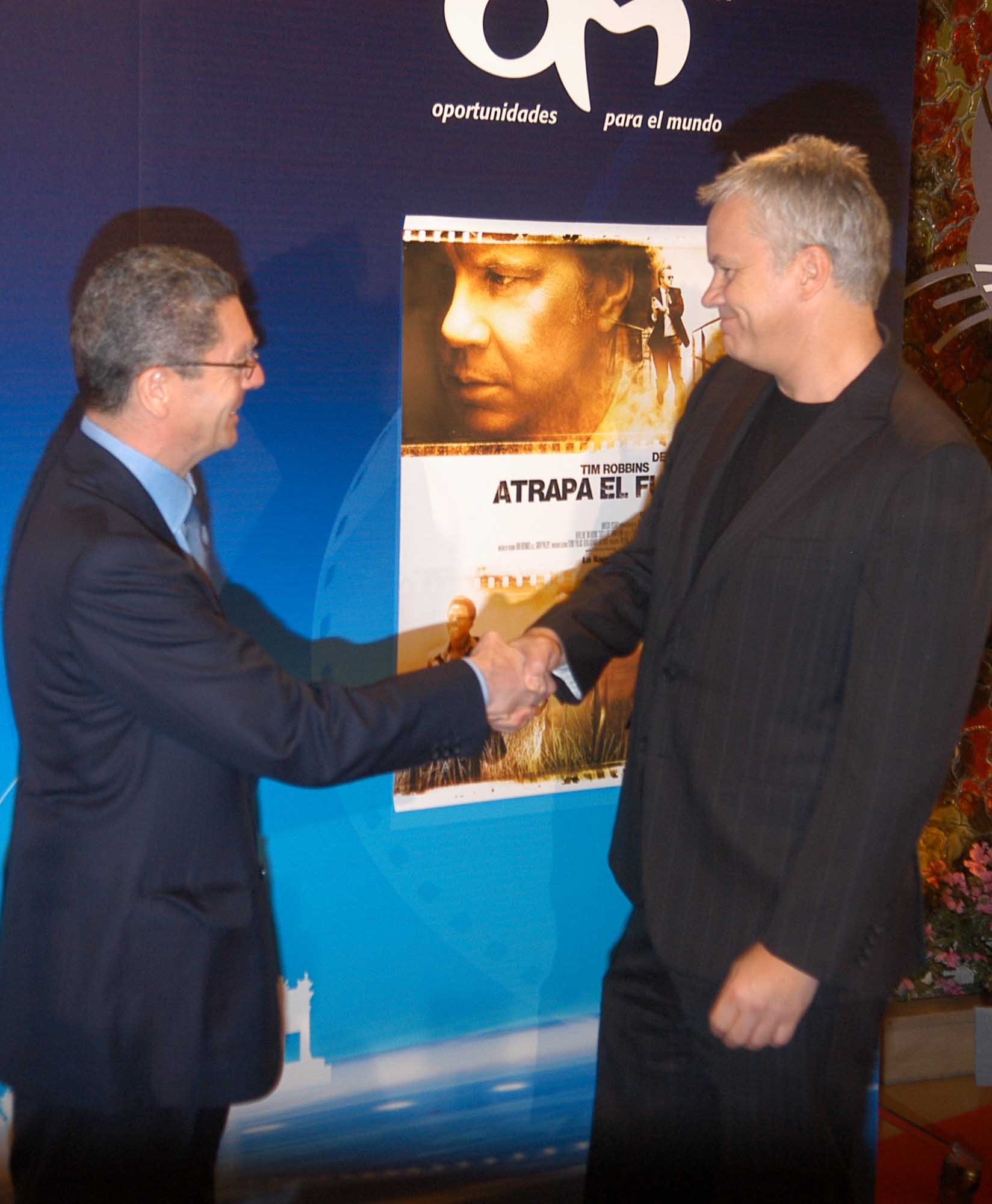 El alcalde, Alberto Ruiz-Gallardón, y el actor Tim Robbins durante la inauguración del primer Festival Internacional de Cine Solidario de Madrid