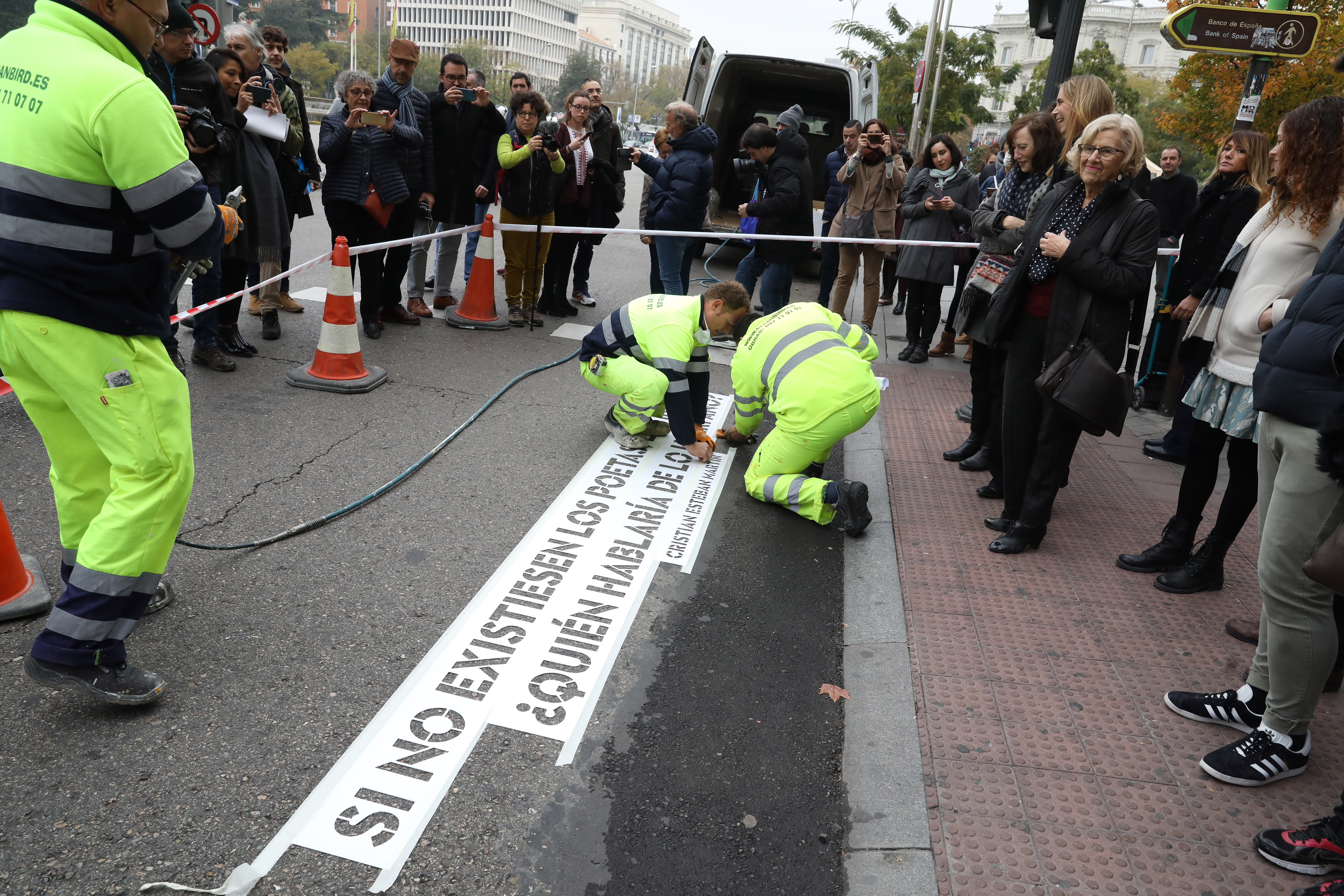 El verso pintado hoy, lunes 3 de diciembre, en el cruce de paseo del Prado con la plaza de Cibeles cierra la fase de creación de ‘Versos al paso’, la iniciativa del Ayuntamiento de Madrid y el colectivo Boa Mistura que ha plasmado 1.100 versos en otros tantos pasos de cebra de toda la ciudad. La alcaldesa de Madrid, Manuela Carmena, ha asistido junto a los miembros del colectivo Boa Mistura a la creación de este último paso de cebra de ‘Versos al paso’, una iniciativa que se enmarca en las acciones del Ayuntamiento de Madrid de fomento de la lectura y transformación del paisaje urbano de Madrid.