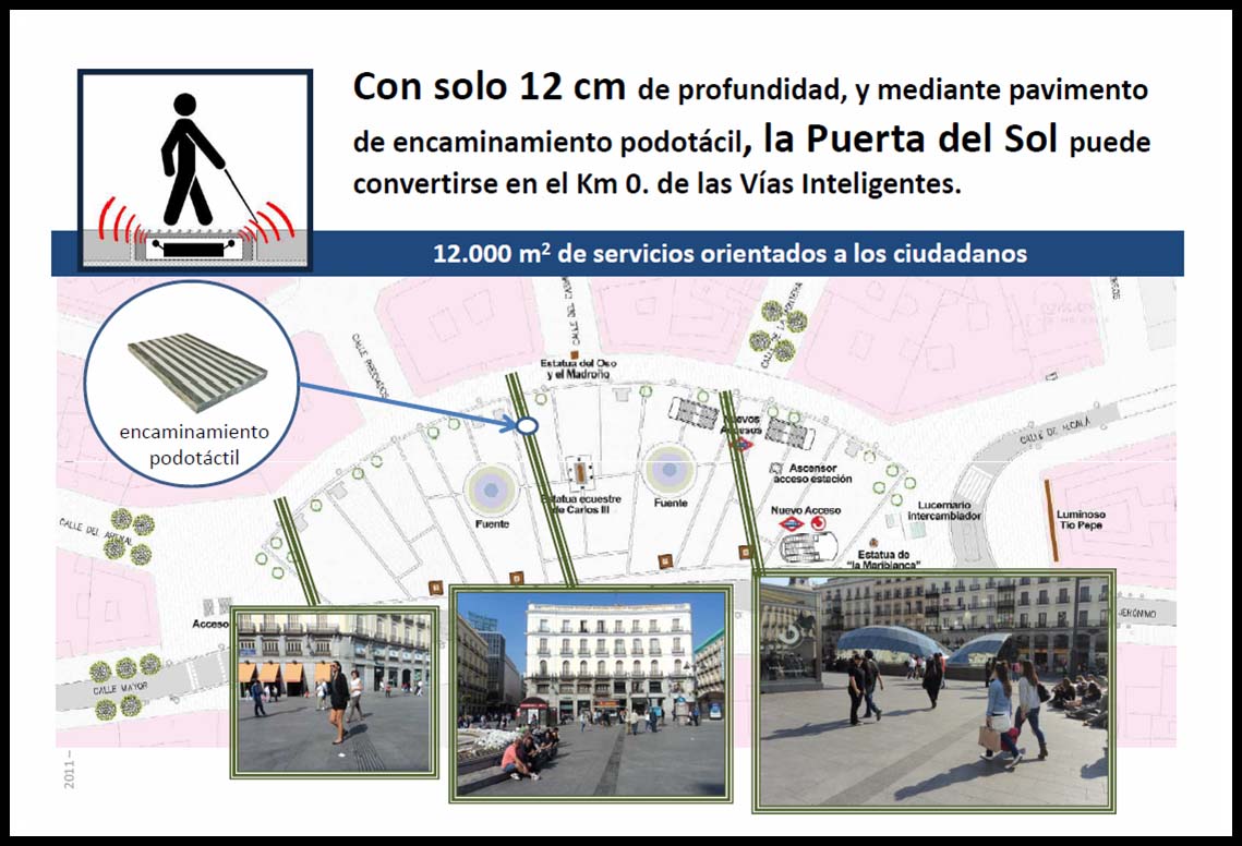 La Vía Inteligente instalada en la Puerta del Sol consiste en un pavimento con base de piedra natural de carbonato cálcico, (en cumplimiento del estándar EPI Tipo A), Consta de tres bandas de 150 metros lineales de pavimento, de encaminamiento podotáctil adaptado a invidentes, con todo el equipamiento electrónico integrado para la prestación de servicios digitales.
