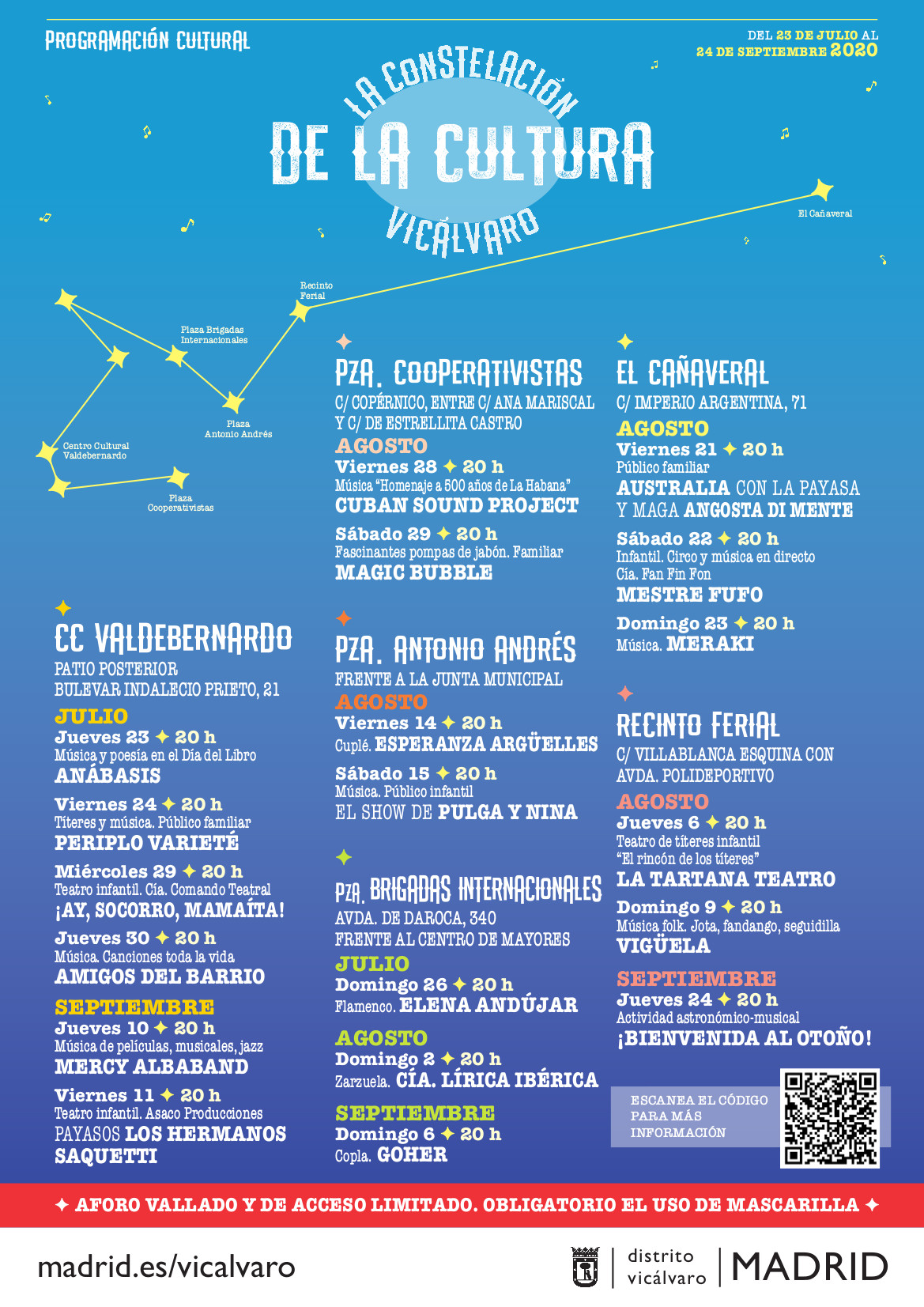 También en horario de tarde, a las 20:00 h, el auditorio de la calle Villablanca acogerá títeres con Tartana Teatro el 6 de agosto y un concierto de Vigüela Folk el 9 de agosto. El periplo estival llega a su fin allí donde comenzó con el cine de verano. El 24 de septiembre se dará la bienvenida al otoño en el recinto ferial con un encuentro de música en directo y observación astronómica bajo el cielo de Vicálvaro.