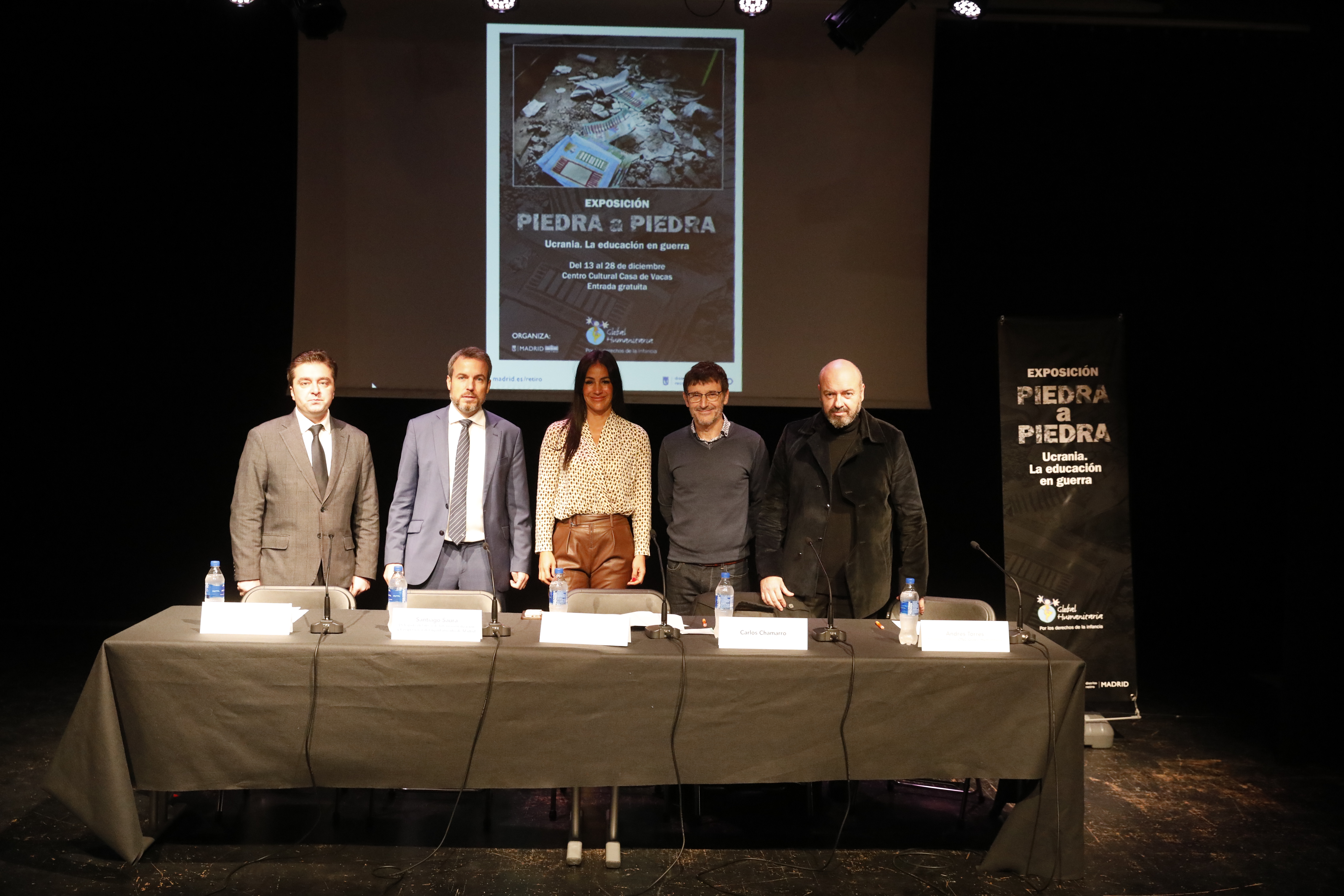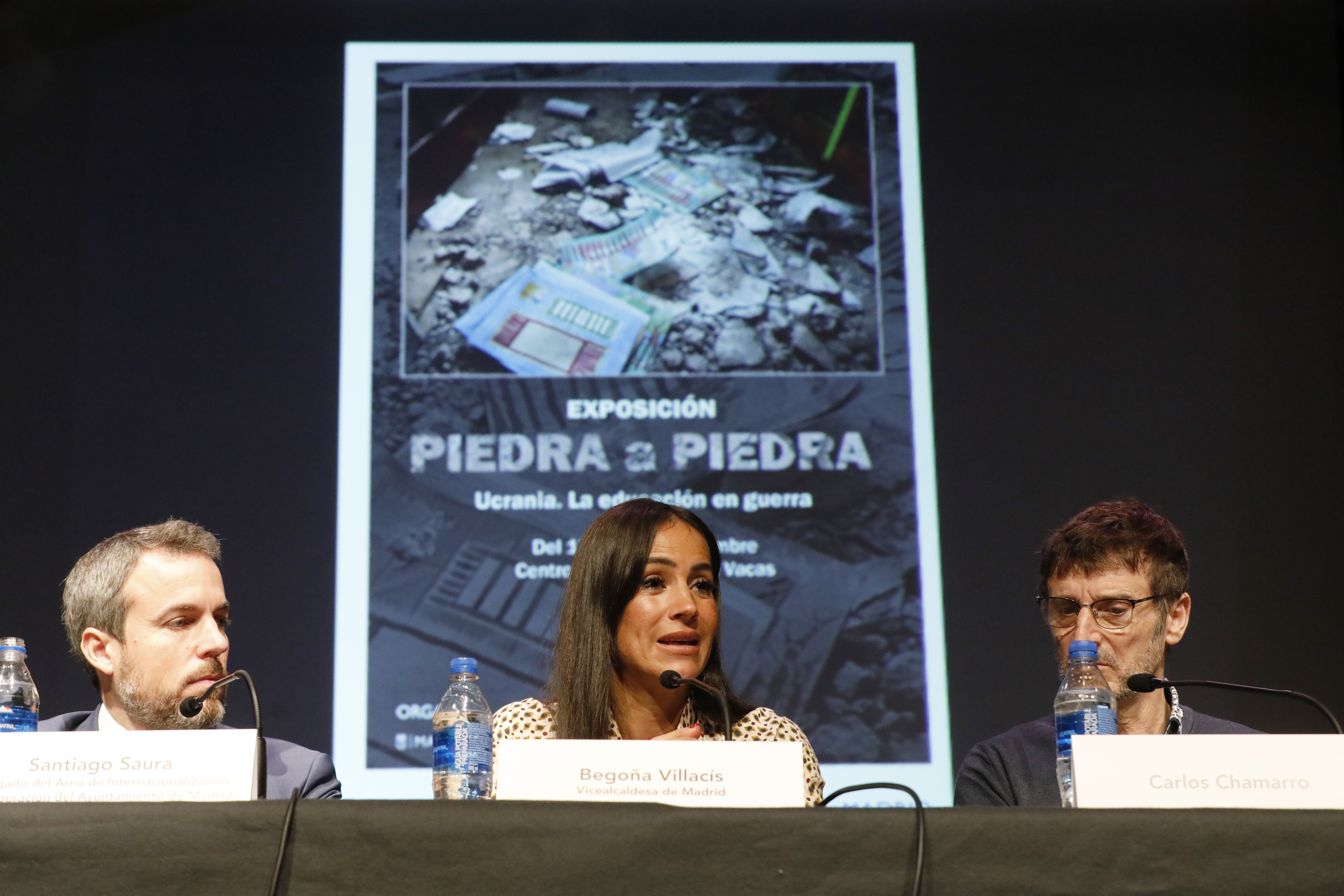 La vicealcaldesa de Madrid, Begoña Villacís, ha inaugurado hoy la exposición Piedra a Piedra, una muestra que persigue sensibilizar y concienciar sobre el impacto que la guerra de Ucrania está causando en la educación de los niños que permanecen en el país, organizada por la ONG Global Humanitaria en colaboración con el Ayuntamiento de la capital.