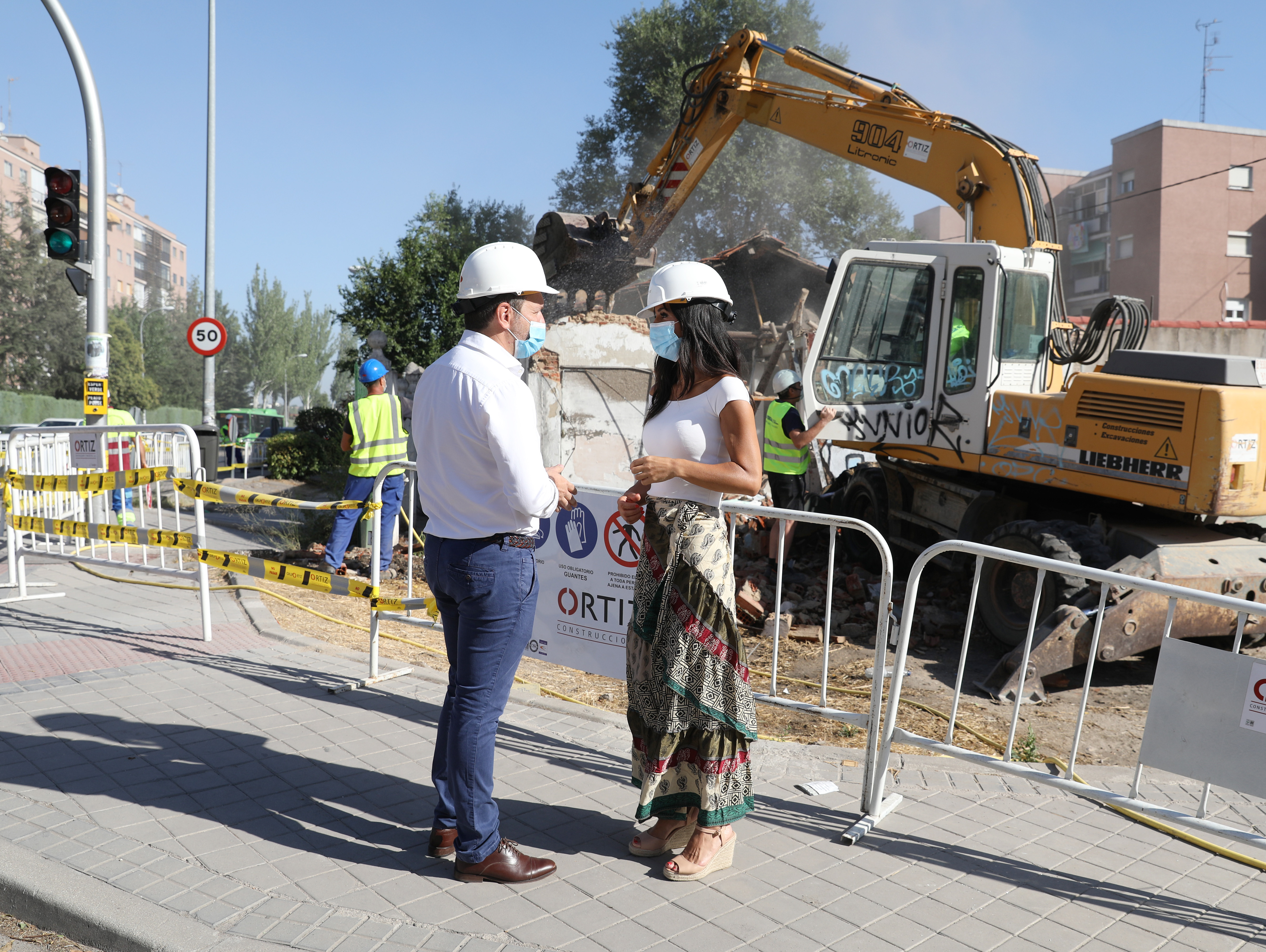La vicealcaldesa de Madrid, Begoña Villacís, junto al delegado de Desarrollo Urbano, Mariano Fuentes, durante la visita a los trabajos de demolición de una casa en la carretera de Carabanchel, en el distrito de Latina.