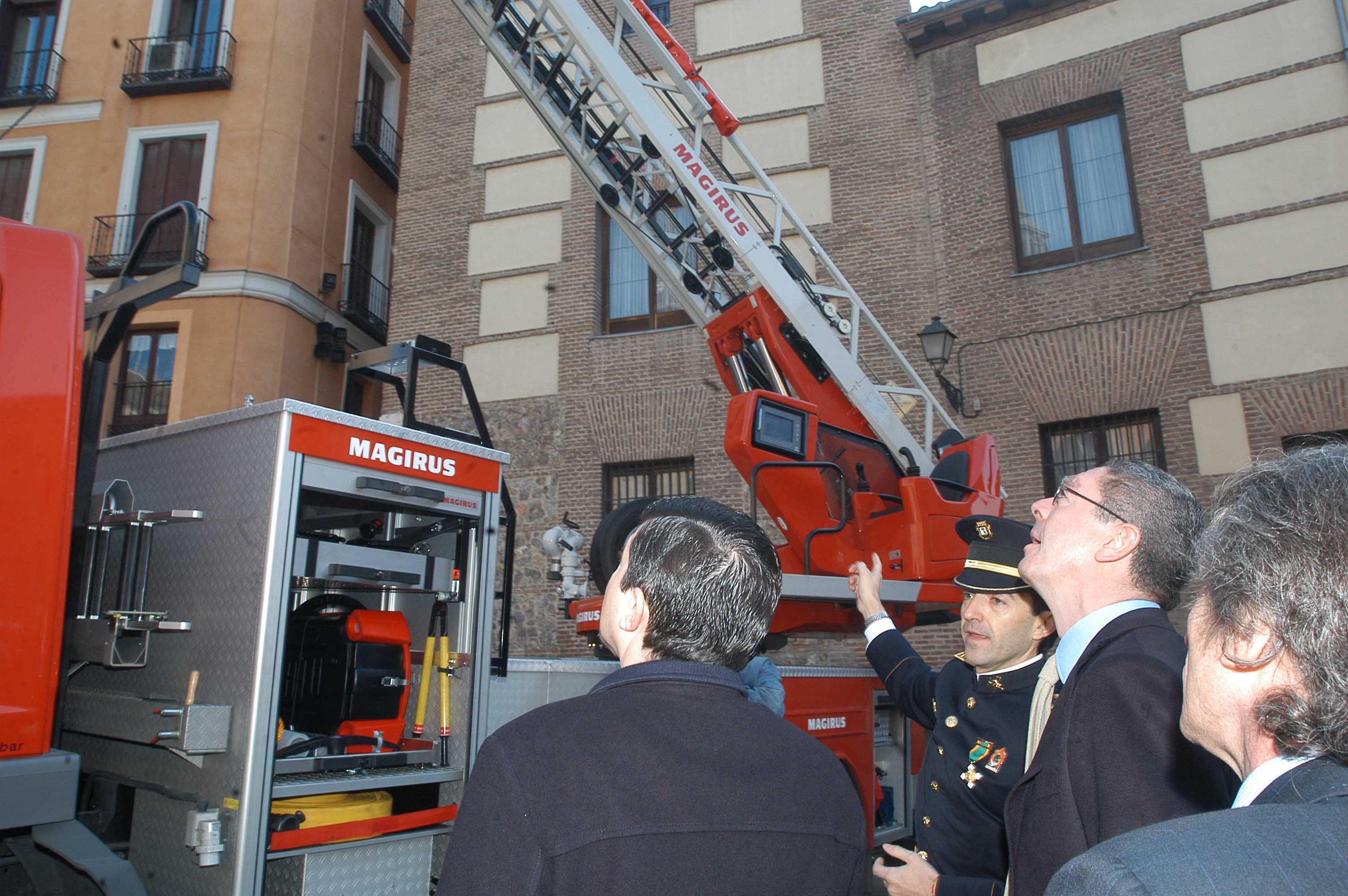 Imágenes de la presentación de los nuevos equipos y material del Cuerpo de Bomberos. Durante un acto celebrado hoy en la Plaza de la Villa, el alcalde de la Ciudad, Alberto Ruiz-Gallardón, ha destacado la vocación y afán de servicio de los bomberos./