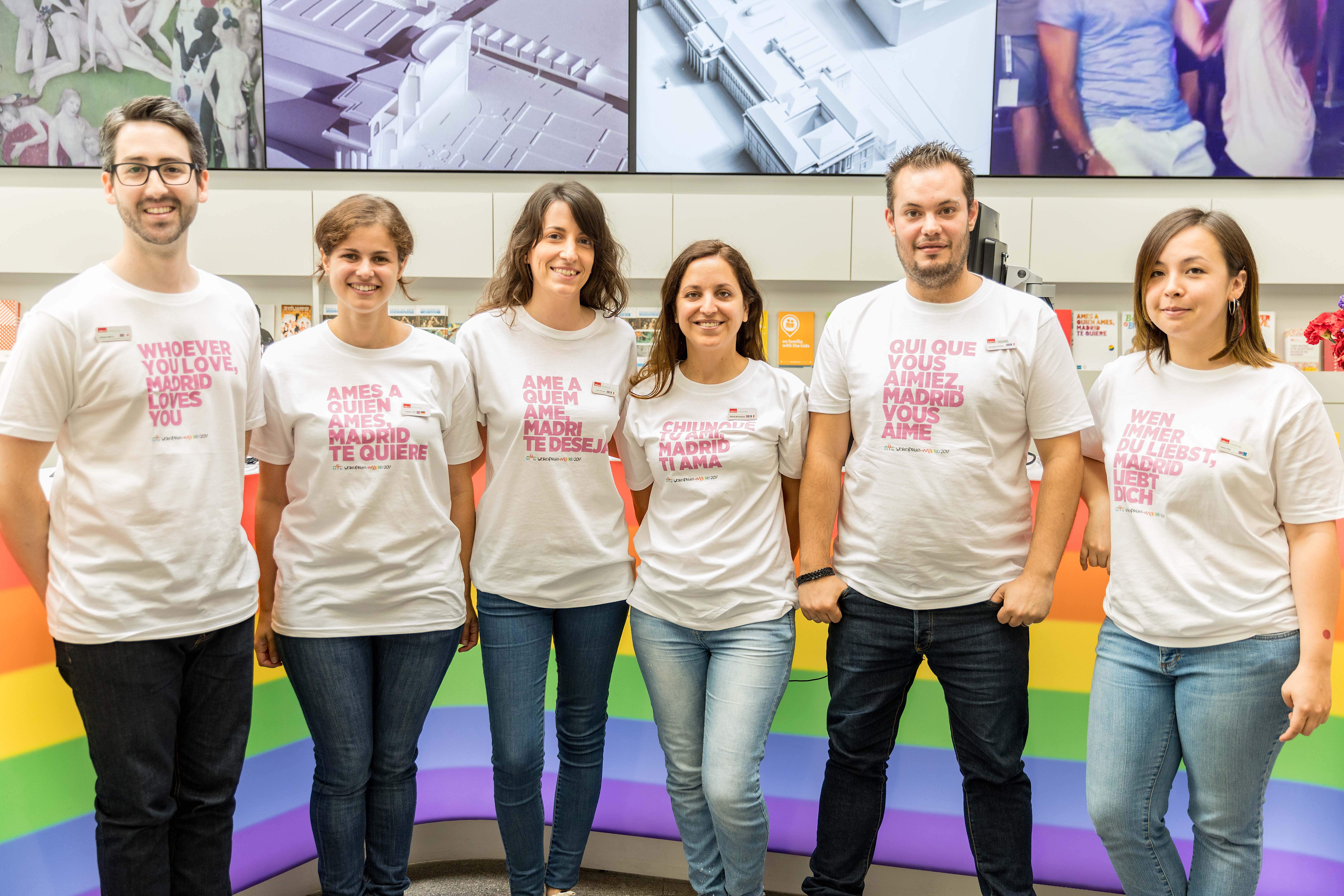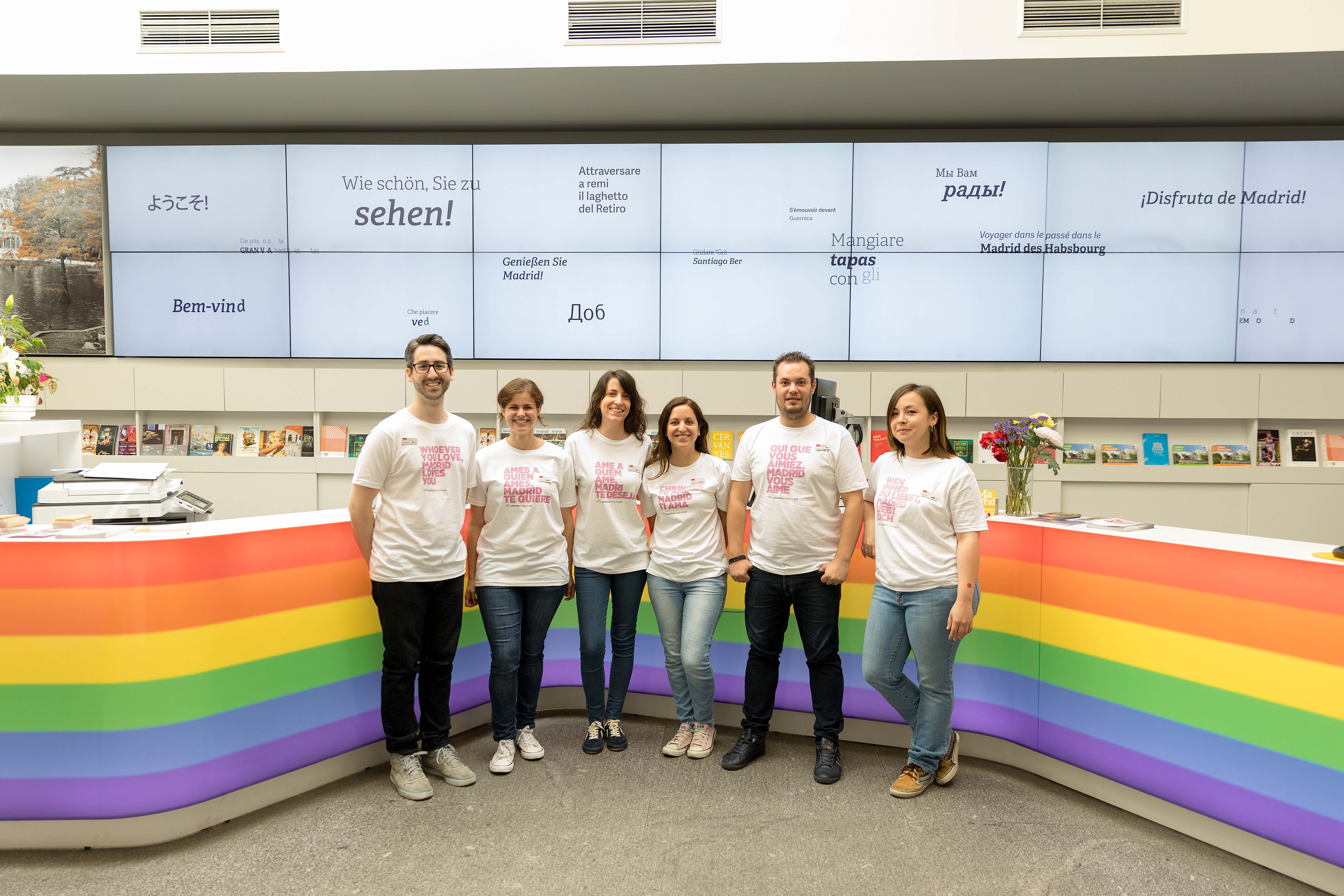 El centro de Turismo de la Plaza Mayor ha cambiado su decoración habitual para transmitir a los visitantes algunas de las señas de identidad de la capital, como destino LGTBI friendly. Los mostradores se ha vinilado con la bandera arcoíris, se ha instalado una iluminación especial y se ha adornado este espacio con flores naturales de los siete colores del arcoíris. Los informadores lucen estos días una camiseta con el lema “Ames a quien ames, Madrid te quiere” en seis idiomas diferentes.