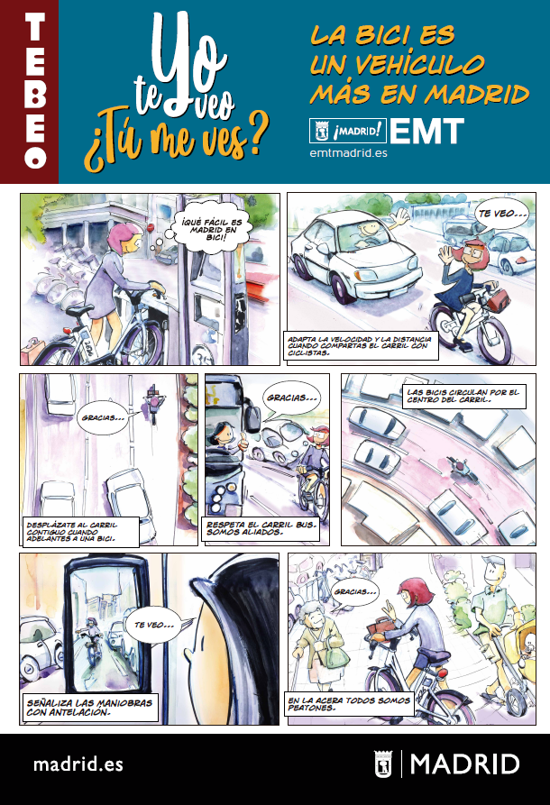 La Empresa Municipal de Transportes (EMT) y el Ayuntamiento de Madrid han lanzado una campaña de concienciación que, bajo el título “Yo te veo. ¿Tú me ves?”, pone de relieve la necesaria convivencia de la bicicleta, como un vehículo más, en la calles de nuestra ciudad y su interacción con el resto de agentes protagonistas de la movilidad en la capital. Esta campaña pretende sensibilizar a conductores, ciclistas y peatones sobre el papel que la bicicleta juega en la movilidad de Madrid.