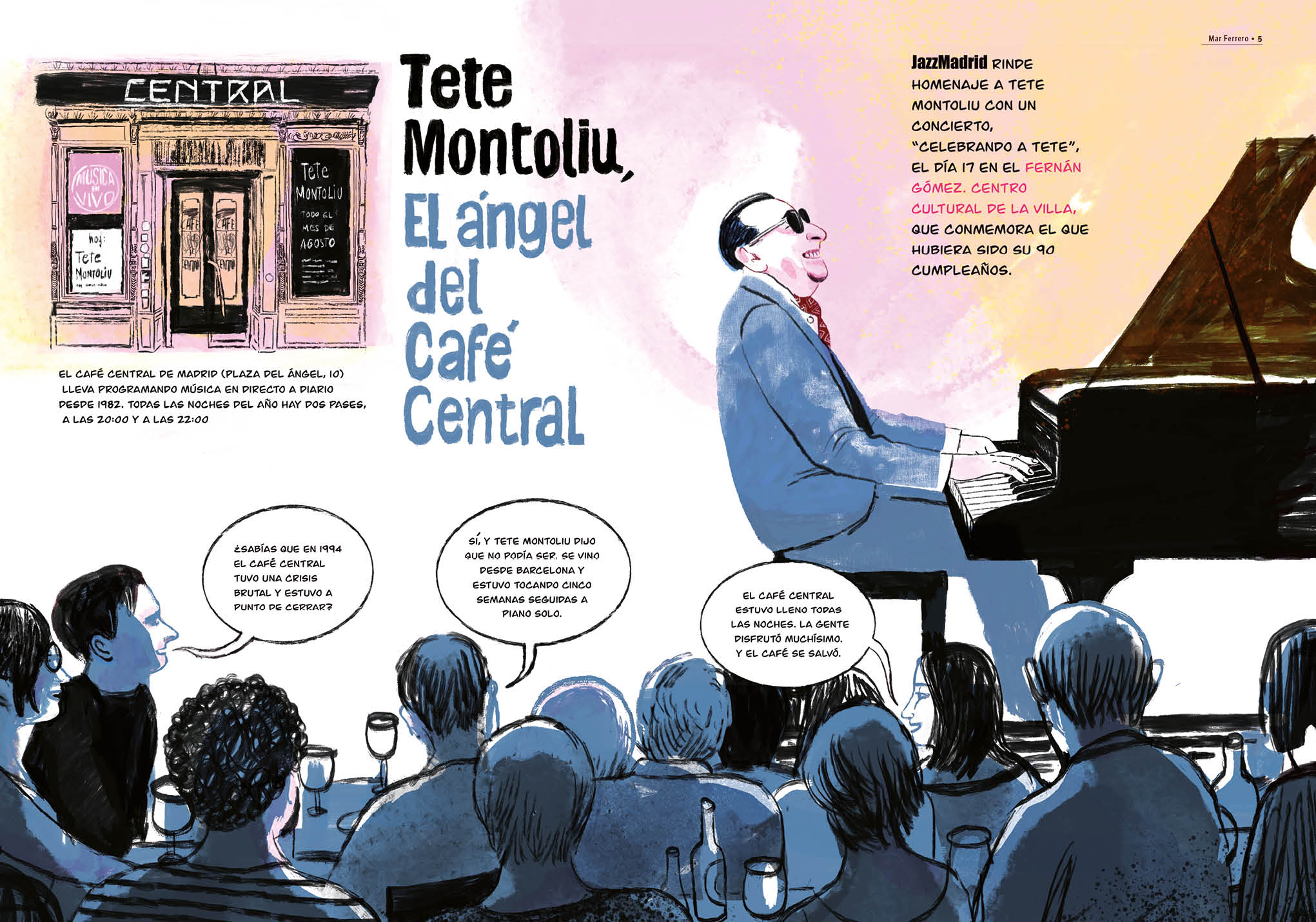 Mar Ferrero recuerda la generosidad del pianista Tete Montoliu, ‘el ángel del Café Central’, que en 1994 actuó cinco semanas seguidas en el mítico café de la plaza del Ángel para ayudar a este templo de la música en directo a superar un momento de crisis. El 17 de noviembre en el Teatro Fernán Gómez. Centro Cultural de la Villa, se rinde tributo al músico en un concierto que conmemora el que hubiera sido su 90 cumpleaños.