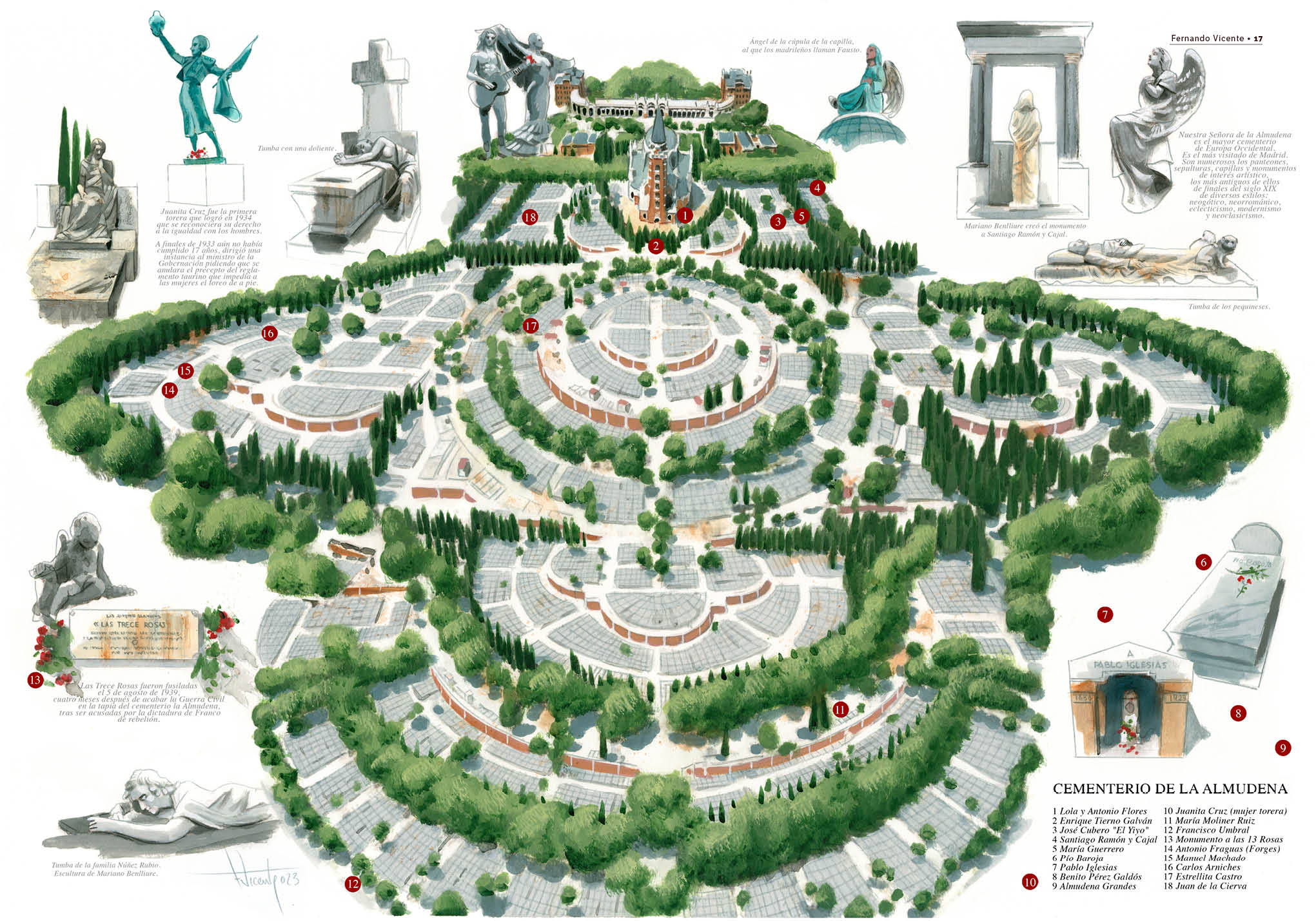 Con motivo del Día de los Difuntos, en las páginas centrales, Fernando Vicente ha dibujado un mapa del Cementerio de la Almudena, el mayor cementerio de Europa occidental y el más visitado de Madrid. Sepulturas y esculturas de figuras ilustres y monumentos de interés artístico de diversos estilos ilustran este mapa de insignes fallecidos.