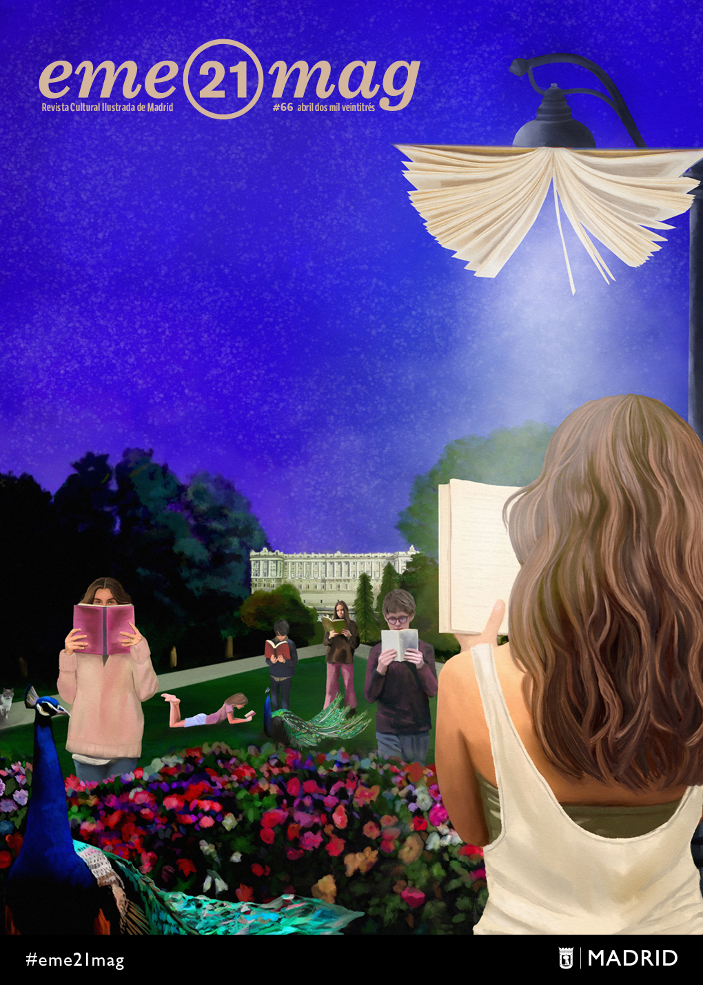 El Día del Libro protagoniza la portada de eme21magazine, la revista ilustrada del Área de Cultura, Turismo y Deporte del Ayuntamiento de Madrid. Su diseñadora, Elsa Suárez, transmite el placer que sienten varios lectores en los jardines del Campo del Moro, con el Palacio Real al fondo. En este número, María Corte ofrece su visión de esta celebración internacional que llega cada año el 23 de abril. La revista muestra también el rastro del legado del escritor Ernest Hemingway en Madrid, desde su llegada a la capital en 1923.