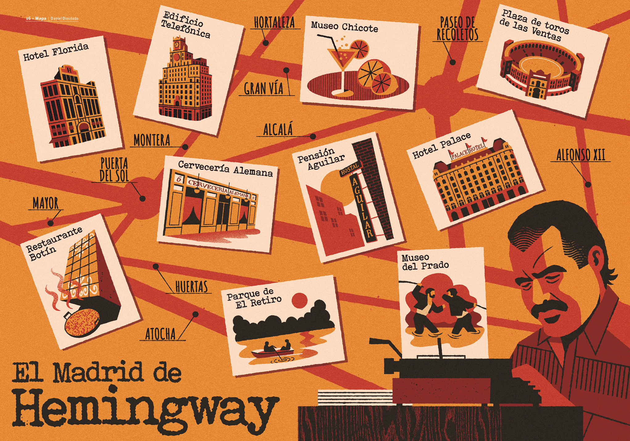 El mapa de Daniel Diosdado refleja los rincones emblemáticos del escritor norteamericano en Madrid: El Hotel Florida, el Museo Chicote, la Plaza de Toros de las Ventas, el Museo del Prado o el Hotel Palace entre otros.