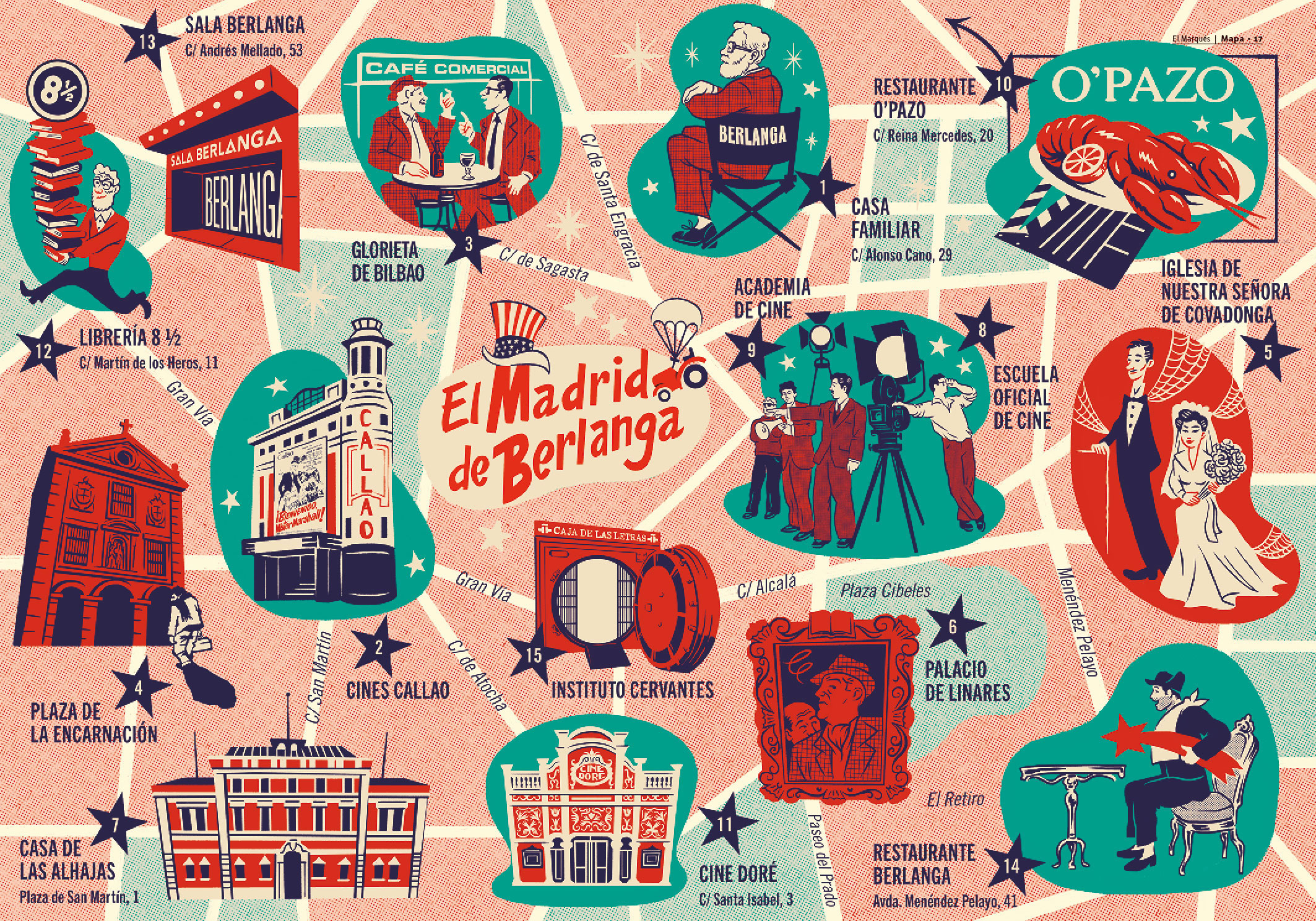 Luis Alegre es autor de libro ¡Hasta Siempre. Mr. Berlanga!, realizado junto al ilustrador El Marqués, quien ofrece en este nuevo número de eme21magazine un recorrido visual por el Madrid de Berlanga. Un mapa de estética retro con 14 localizaciones imprescindibles para seguir las huellas del director en la capital desde el Cine Doré al Palacio de Linares, el Instituto Cervantes, la plaza de la Encarnación, la Escuela Oficial de Cine o la iglesia de Nuestra Señora de Covadonga.